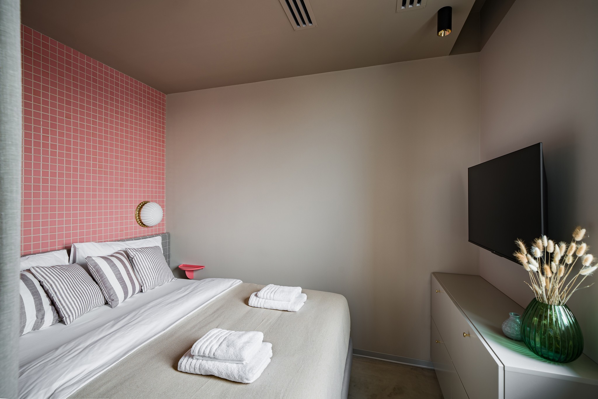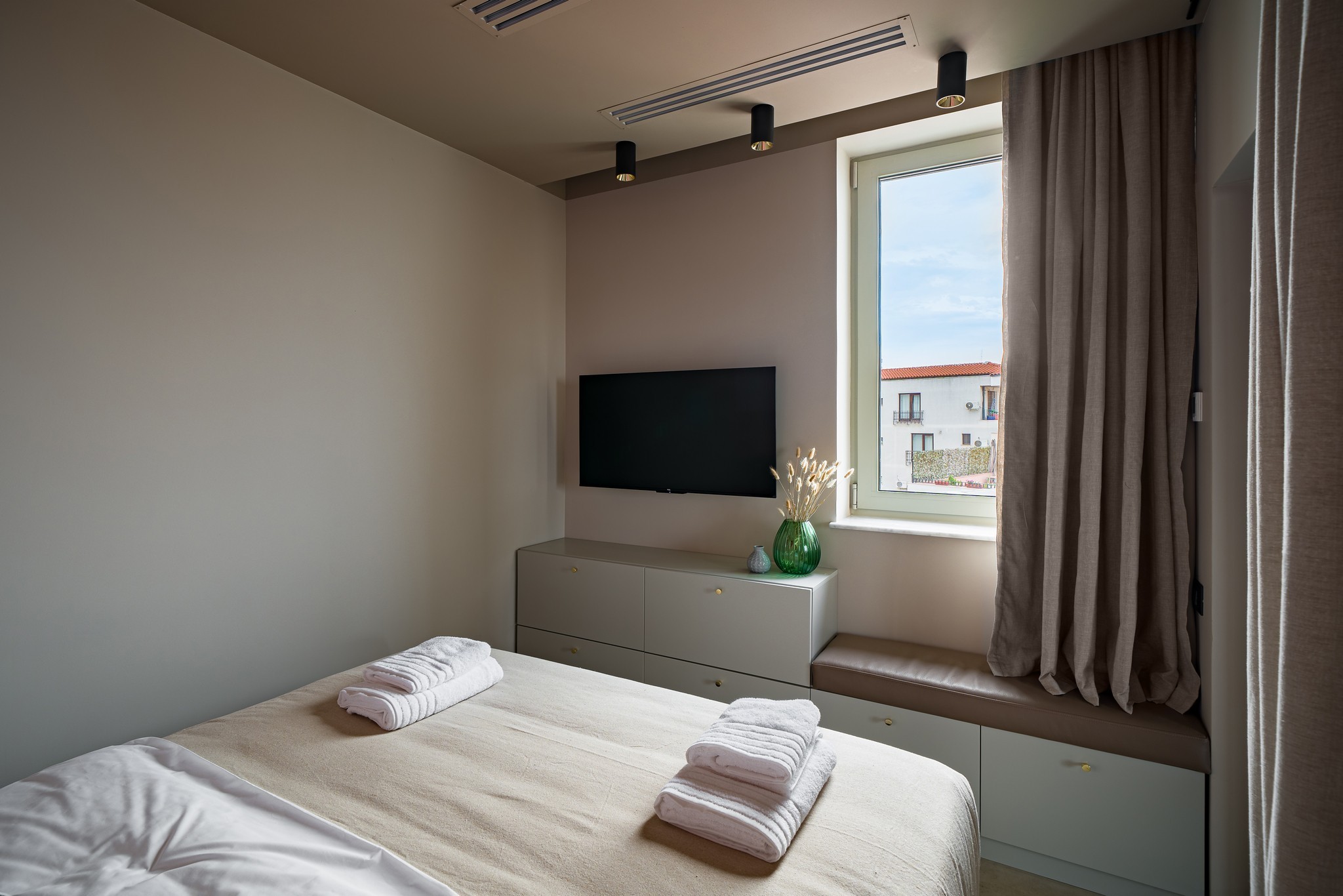 Paleta cromatică – tonuri calde de crem și bej, care pun în valoare jocul de texturi. MDF-ul frezat în modele tip val, romb și ramă clasică – devine elementul definitoriu al proiectului, completat de sticlă, oglinzi și suprafețe atent finisate.