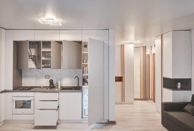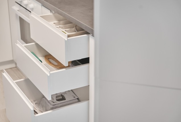 Bucataria nu este foarte mare, dar incorporare electrocanicelor ne ajuta sa pastram o linie curata. Corpurile realizate la comanda, cu usi de MDF vopsit cu maner frezat si sticla termorezistenta vopsita, in loc de clasica gresie , da senzatia unui spatiu aerisit, fara a face compromisuri la functionalitate.
