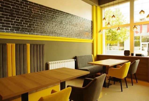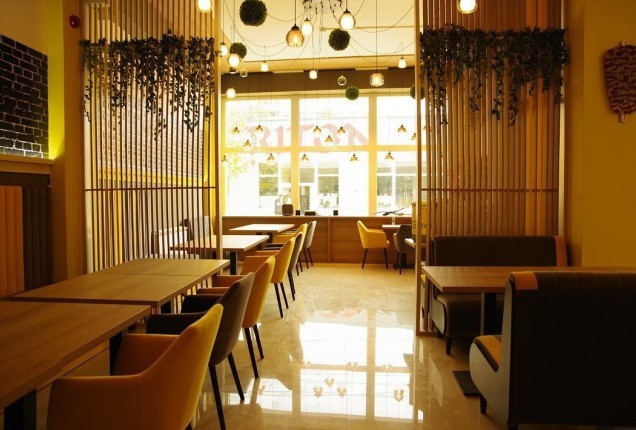 Paleta cromatică – construită pe nuanțe calde de bej și gri mineral, echilibrate de accente negre grafice și texturi naturale de lemn ce oferă eleganță și profunzime, în timp ce accentele ocru ale scaunelor introduc energie și dinamism.