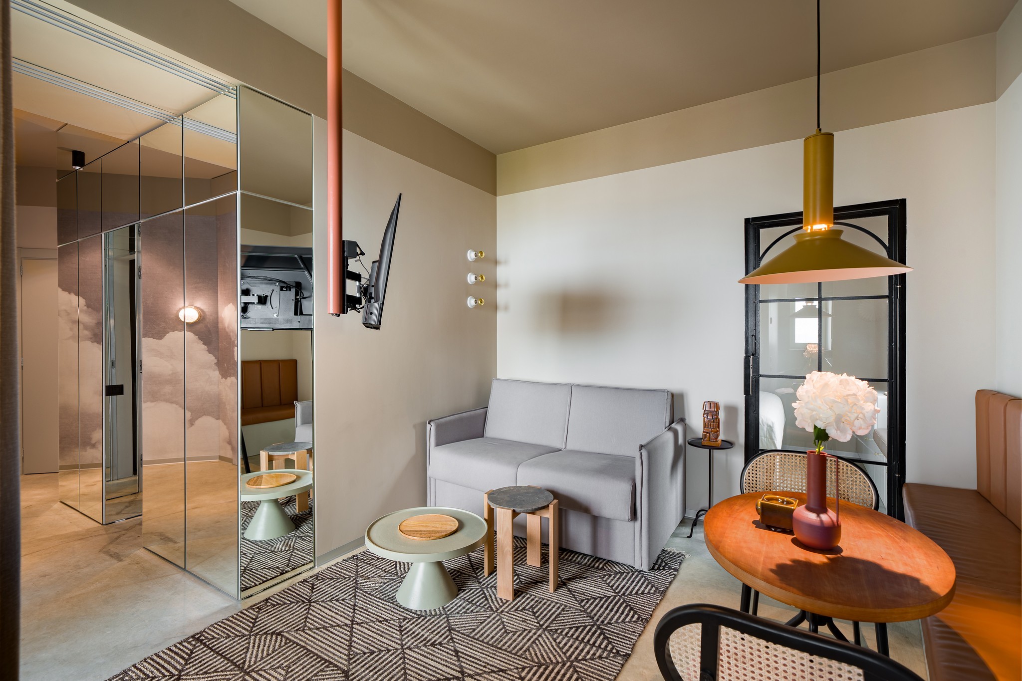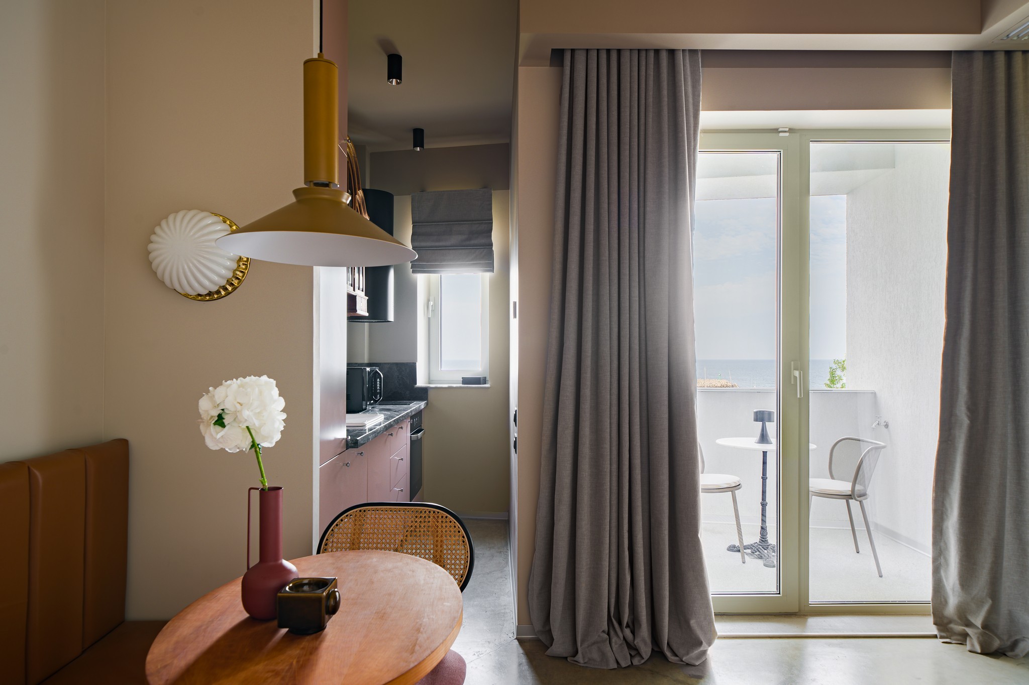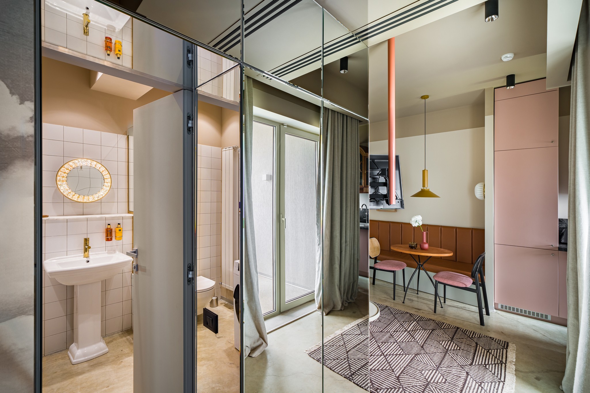 Comoda din hol, pare ca sta in echilibru, iar oglinda cu forme fazetate completeaza perfect linia. Dressingul generos tine loc de cuier si pantofar, lasand totusi intrarea luminoasa.