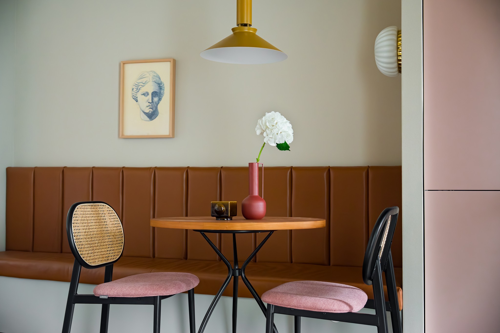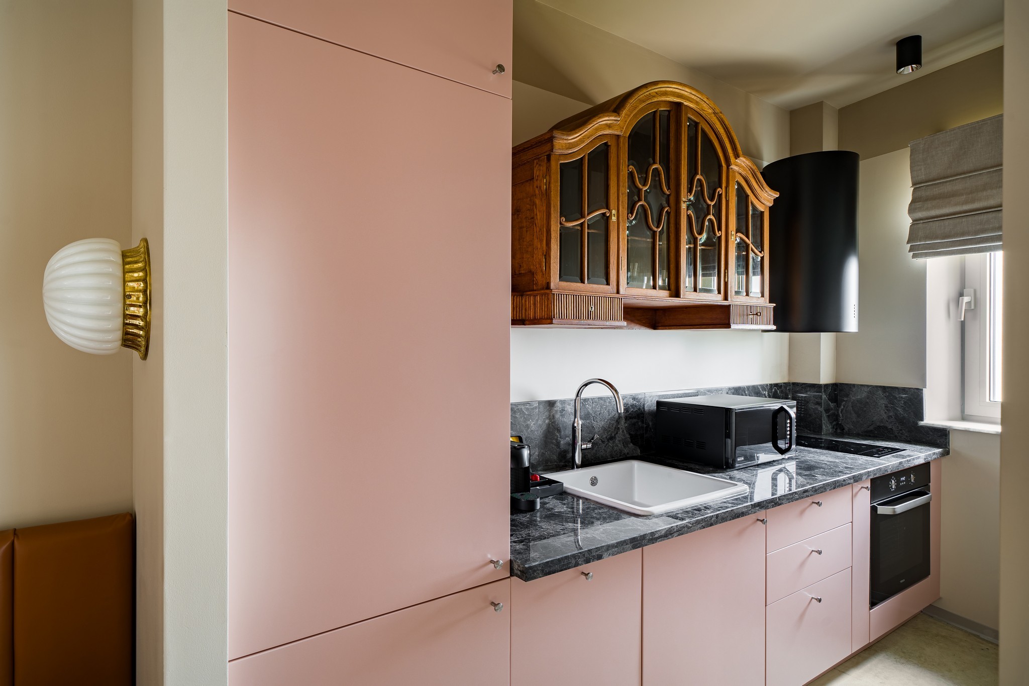Bucataria este realizata din PAL cu usi si fronturi de sertar din MDF vopsit, care ne permit pastrarea liniei neoclasice. Blatul de corian de 12mm permite o intretinere foarte usoara si o rezistenta foarte mare in timp. Detaliul principal este zona de contrablat, unde s-a optat pentru un sistem de glisare discret, cu sticla printata cu efect de marmura, care face spatiul sa arate foarte ordonat.