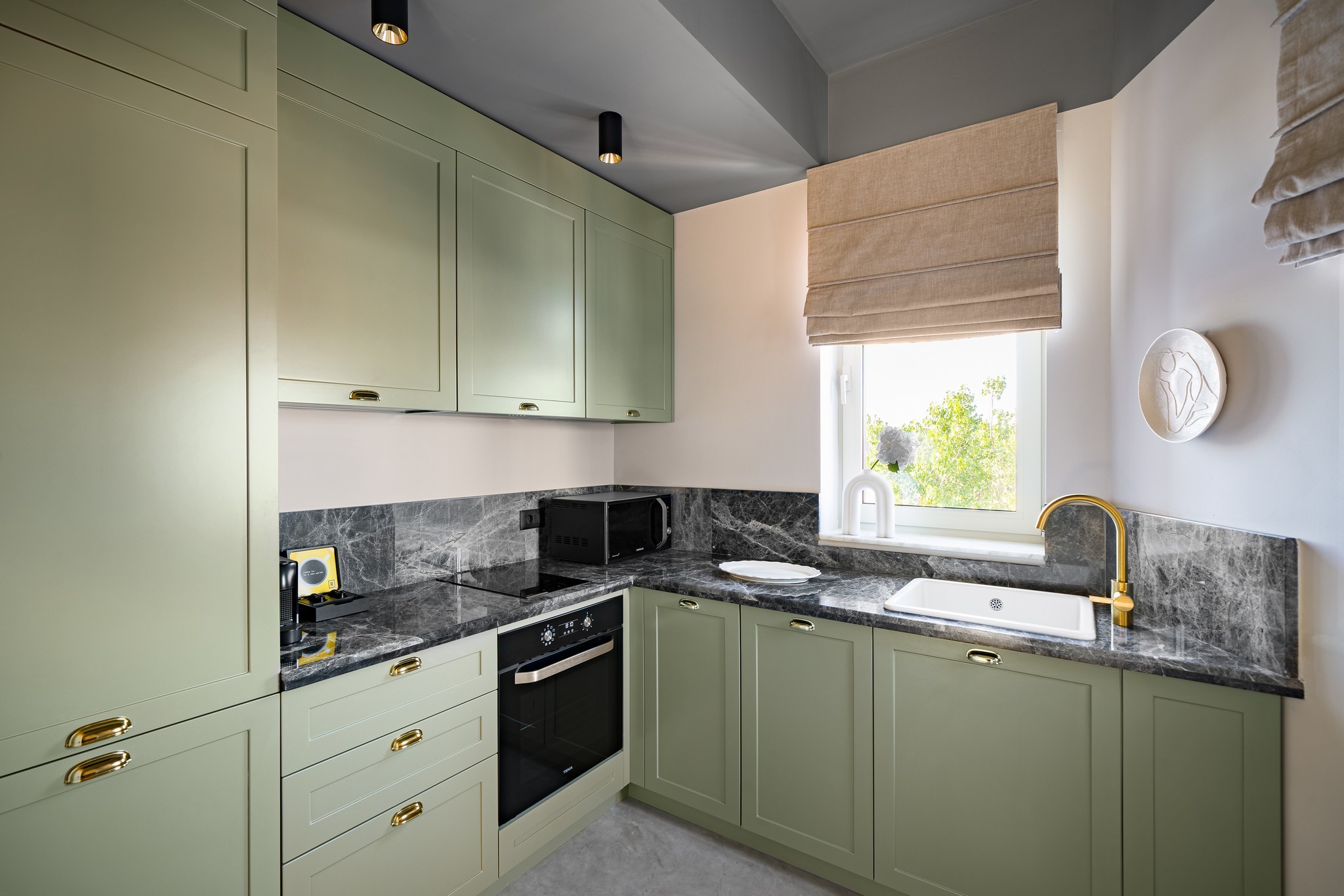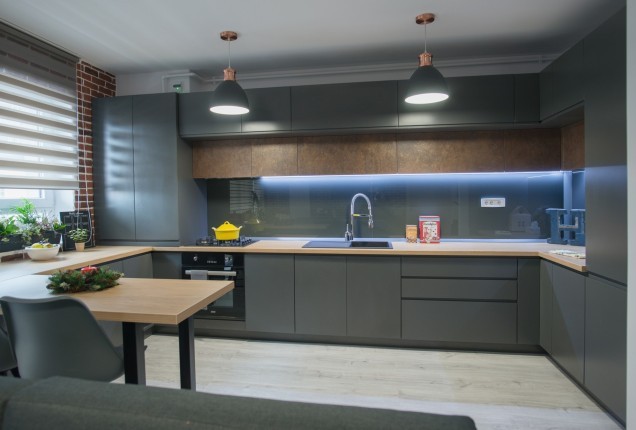 Bucataria nu este foarte mare, dar incorporare electrocanicelor ne ajuta sa pastram o linie curata. Corpurile realizate la comanda, cu usi de MDF vopsit cu maner frezat si sticla termorezistenta vopsita, in loc de clasica gresie , da senzatia unui spatiu aerisit, fara a face compromisuri la functionalitate.