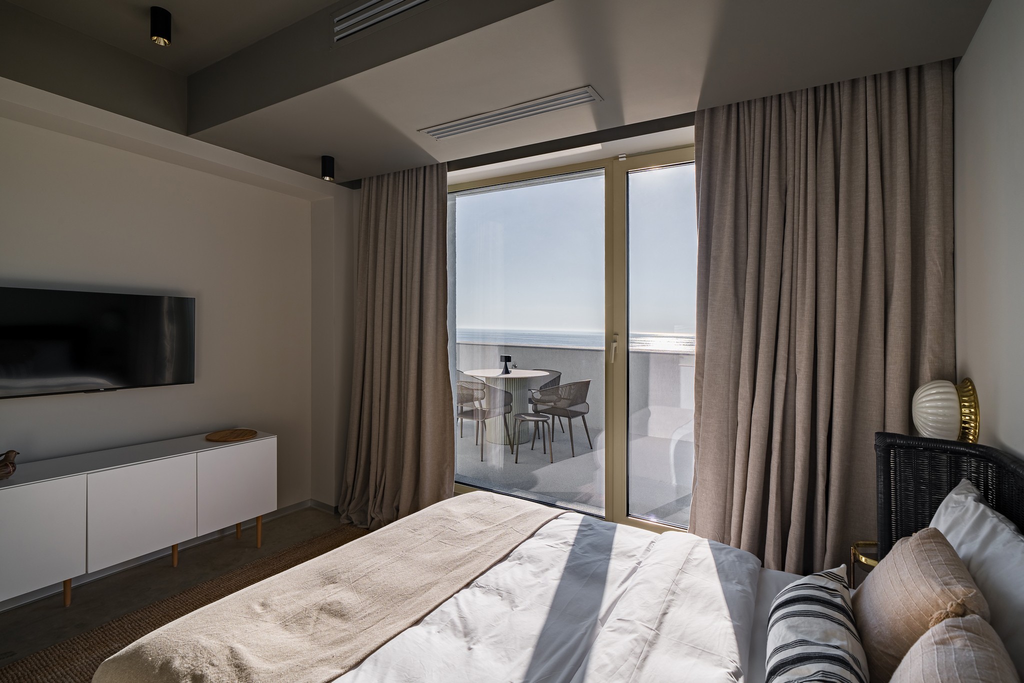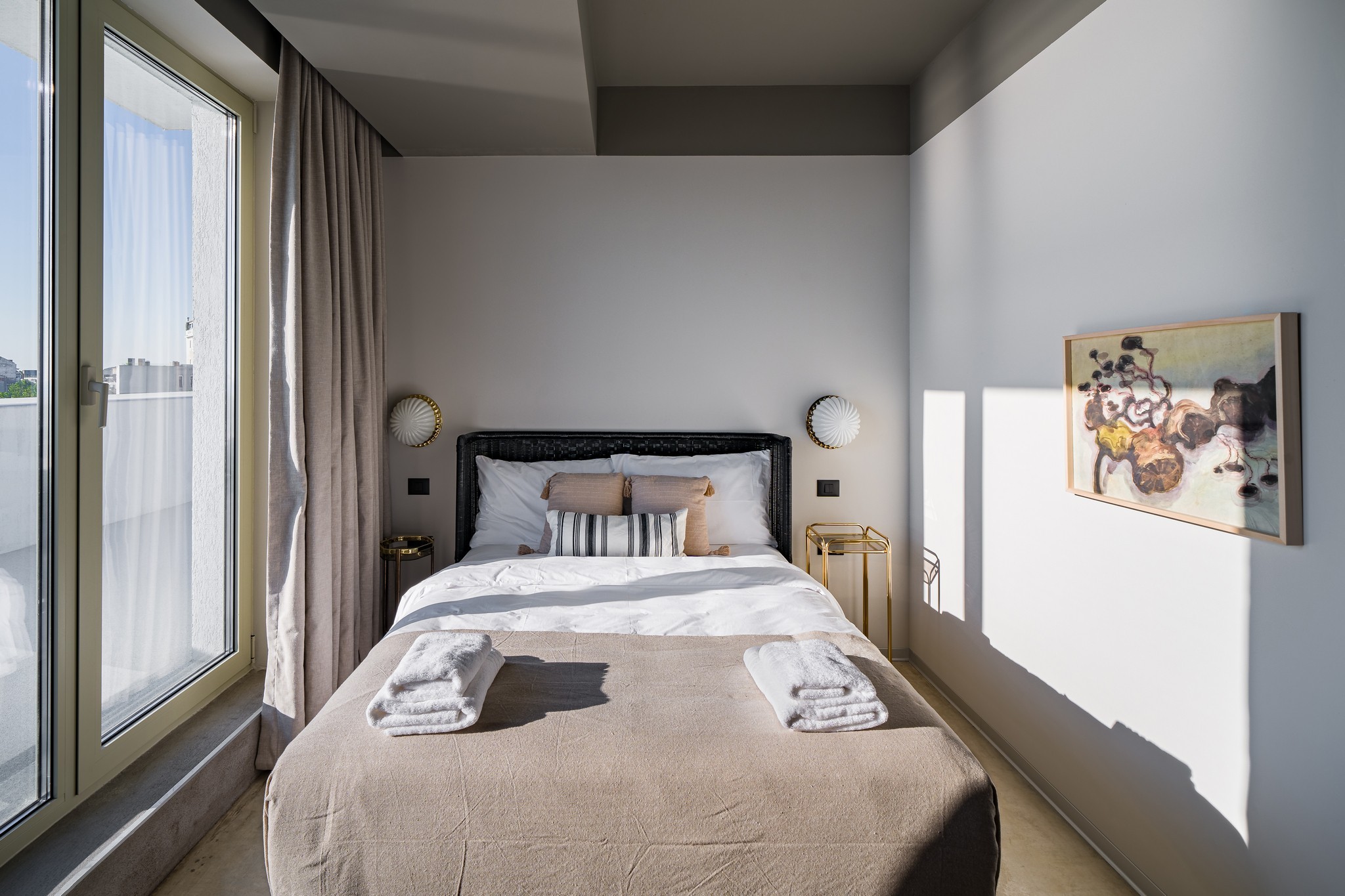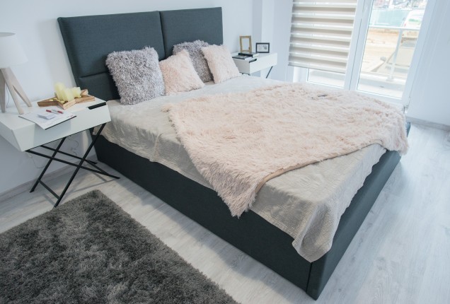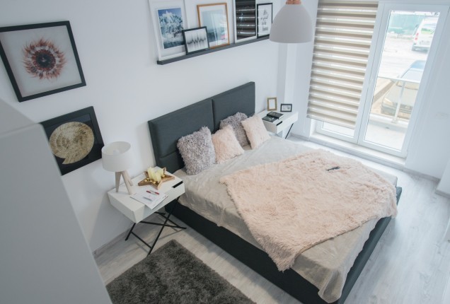 Amenjarea dormitorelor este sofisticata, dar in acelasi timp calda. Punctul principal din cele 2 dormitoare sunt paturile, in culori puternice burgund si olive, in timp ce accentele de auriu, pastreaza linia glamour pe care si-a dorit-o clientul.
