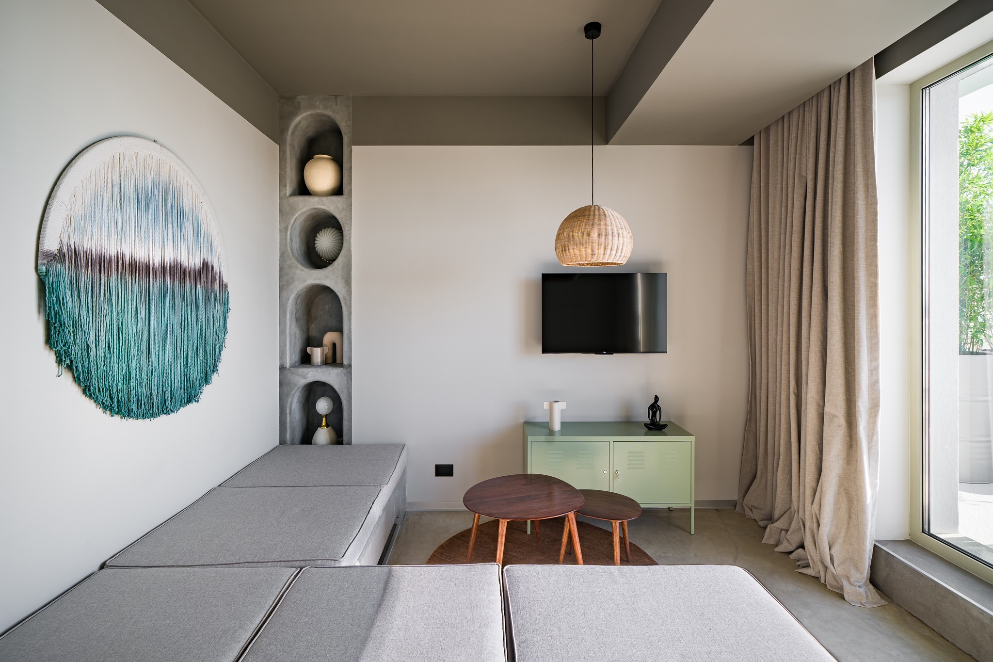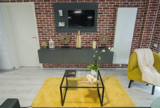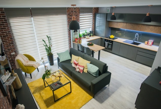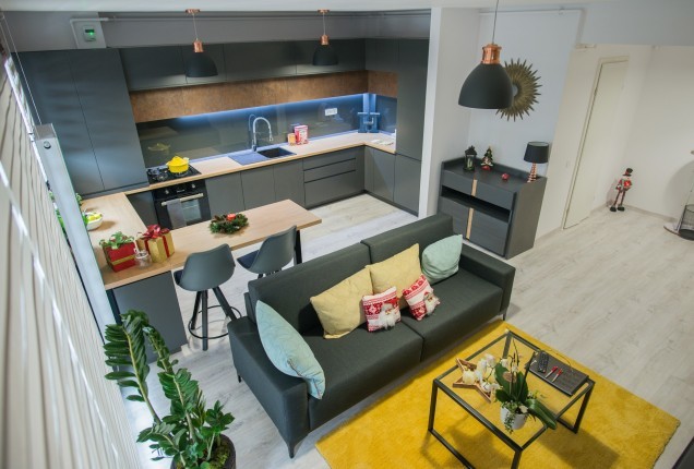 Livingul preia din cromatica bucatariei, cu placari de pereti superbe dn nuante de gri, riflaje din lemn sofisticate si cu accente de auriu, care capteaza lumina, sporind bogatia generala a incaperii. In zona de televizor, desi este compacta, am integrat un semineu electric pentru a crea o atmosfera si mai relaxanta.