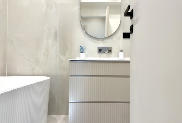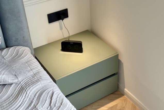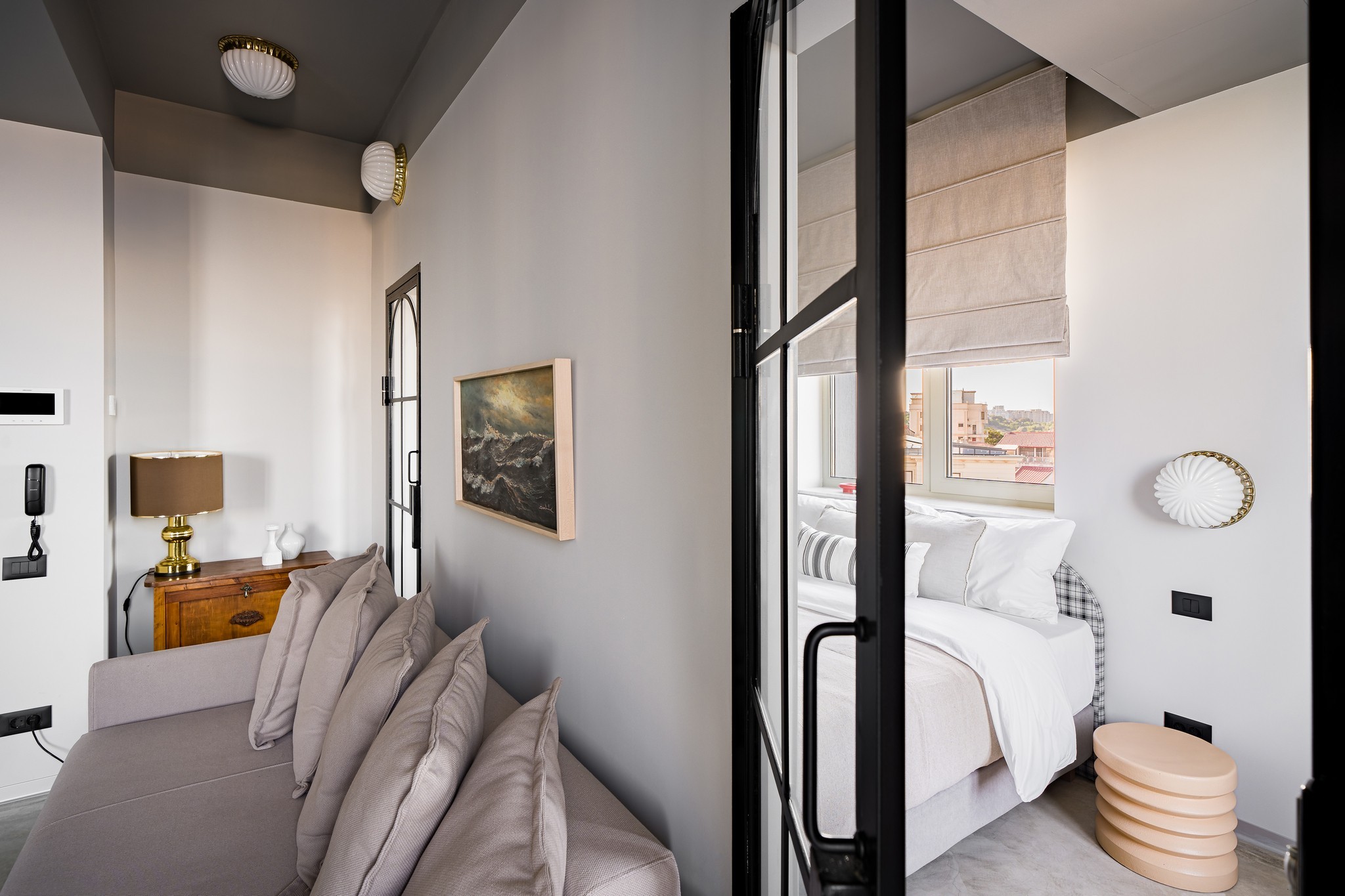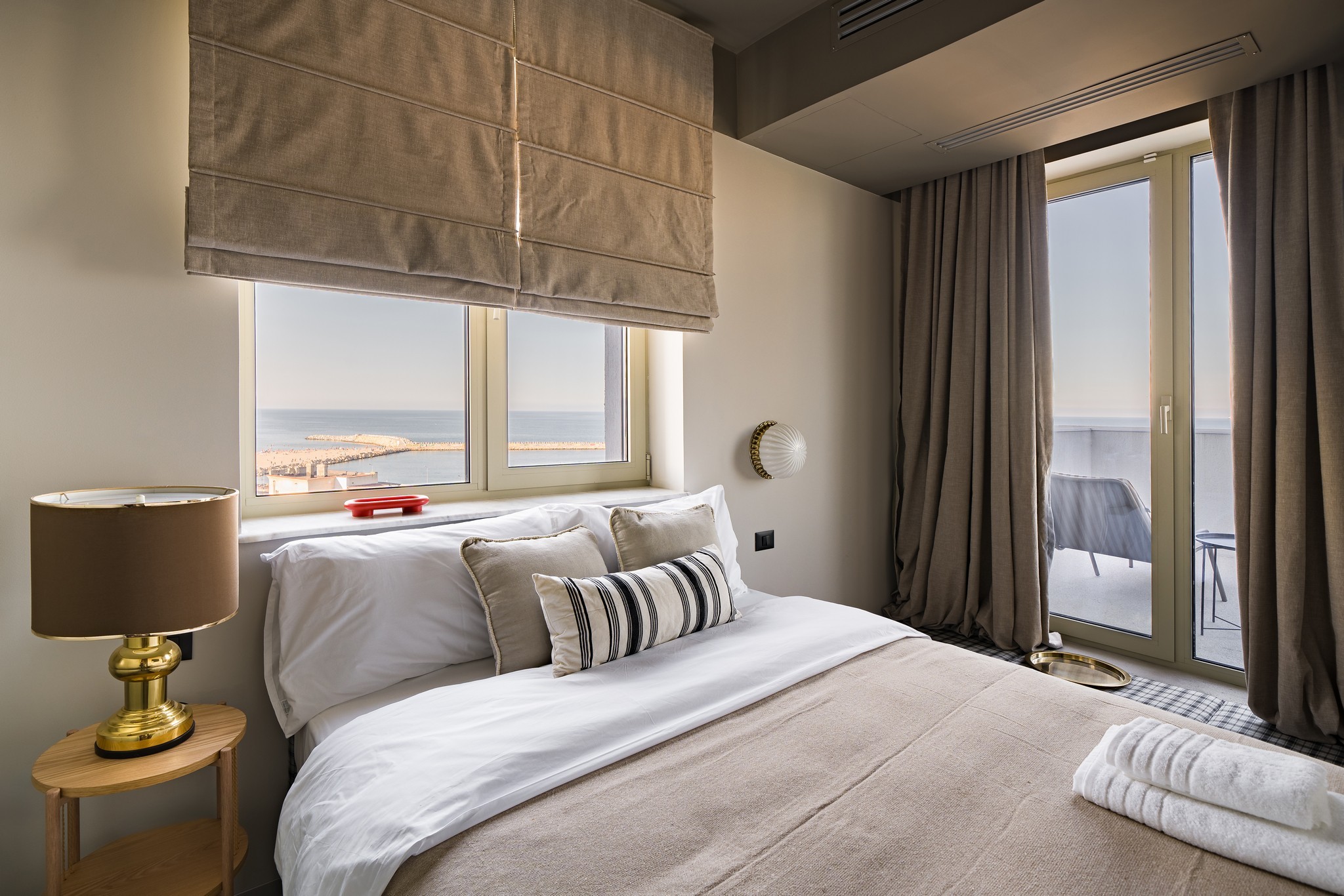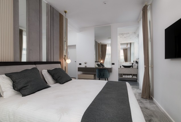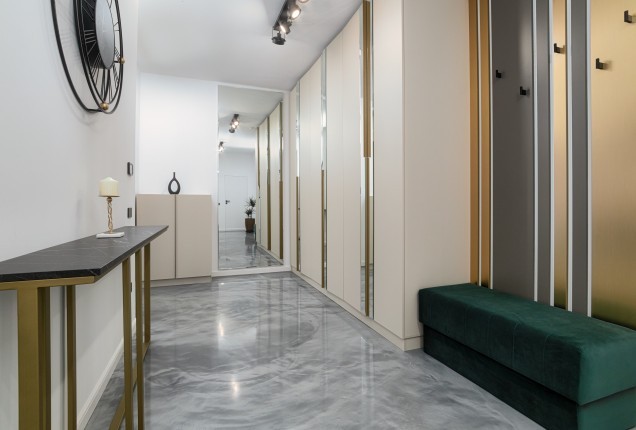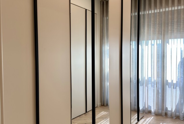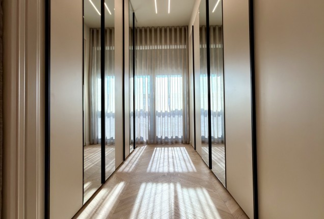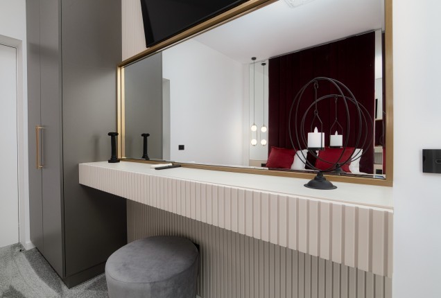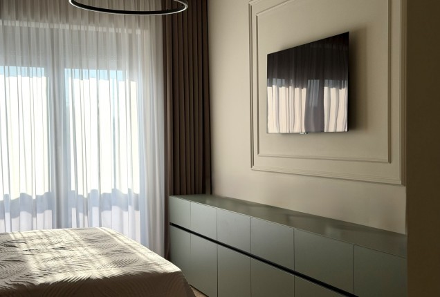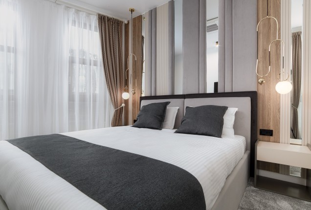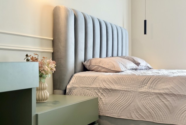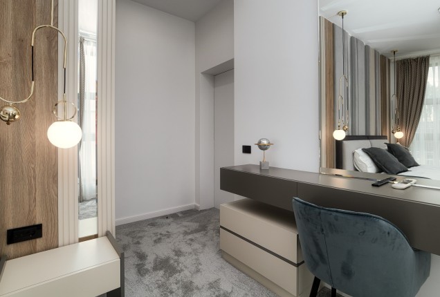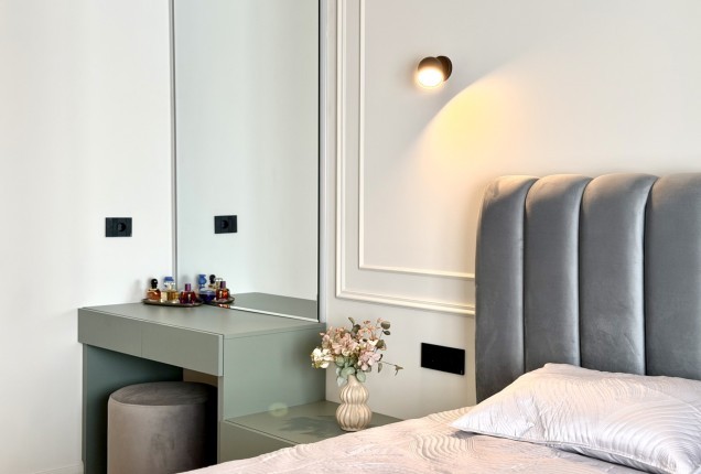 Amenjarea dormitoarelor este sofisticata, dar in acelasi timp calda. Punctul principal din cele 2 dormitoare sunt paturile, cu tablii inalte tapitate, care completeaza accentele de auriu, si pastreaza linia glamour pe care si-a dorit-o clientul.