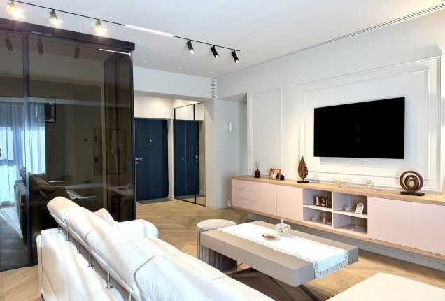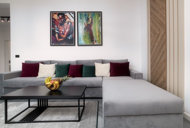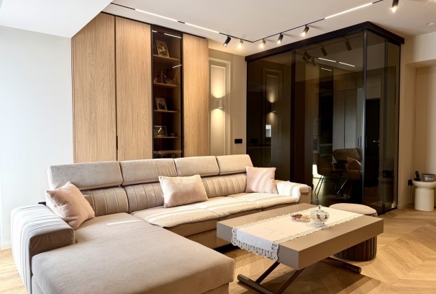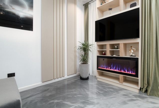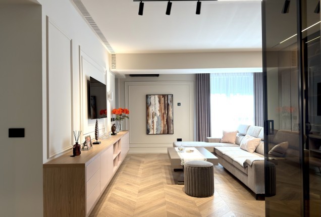Livingul preia din cromatica bucatariei, cu placari de pereti superbe din nuante de grej cald si riflaje din lemn sofisticate . In zona de televizor, desi este compacta, am integrat un semineu electric pentru a crea o atmosfera si mai relaxanta.