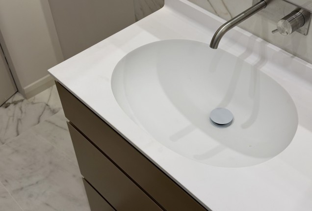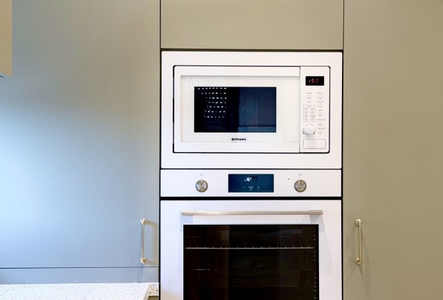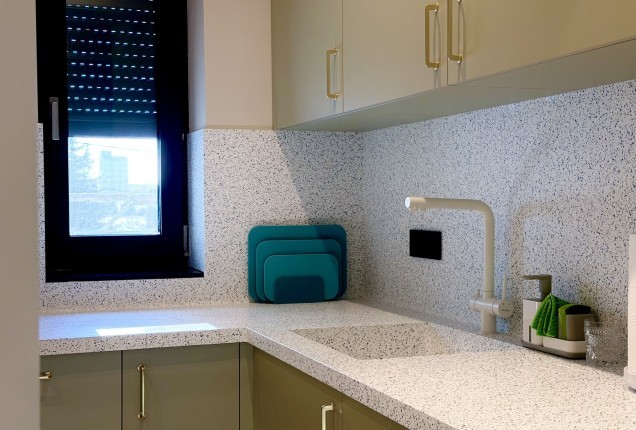 Bucataria nu este foarte mare, dar incorporare electrocanicelor ne ajuta sa pastram o linie curata. Corpurile realizate la comanda, cu usi de MDF vopsit cu maner frezat si sticla termorezistenta vopsita, in loc de clasica gresie , da senzatia unui spatiu aerisit, fara a face compromisuri la functionalitate.