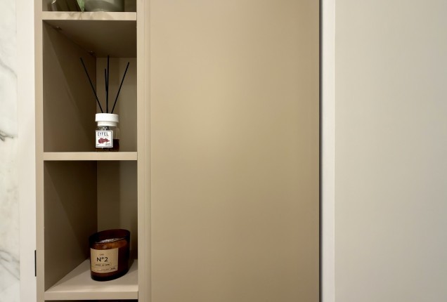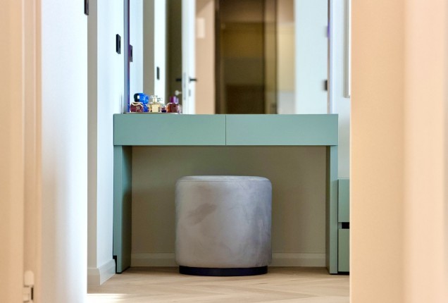 Holul ofera spatii generoase de depozitare, pe care le-am exploatat la maxim, prin duloapuri mari, facute pe comanda , pentru a castiga cat mai mult spatiu.