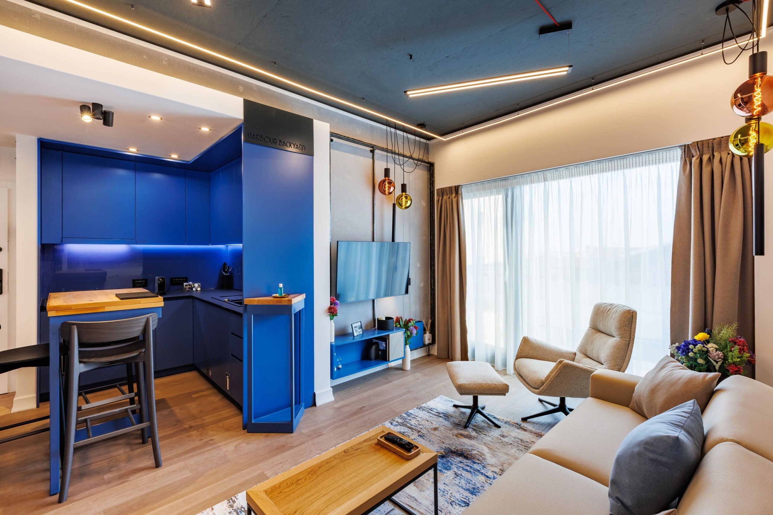Apartamentul 405 este despre contrast asumat și forme care atrag privirea. Nu este un spațiu timid — este un spațiu care își afirmă personalitatea prin culoare, volum și detaliu.