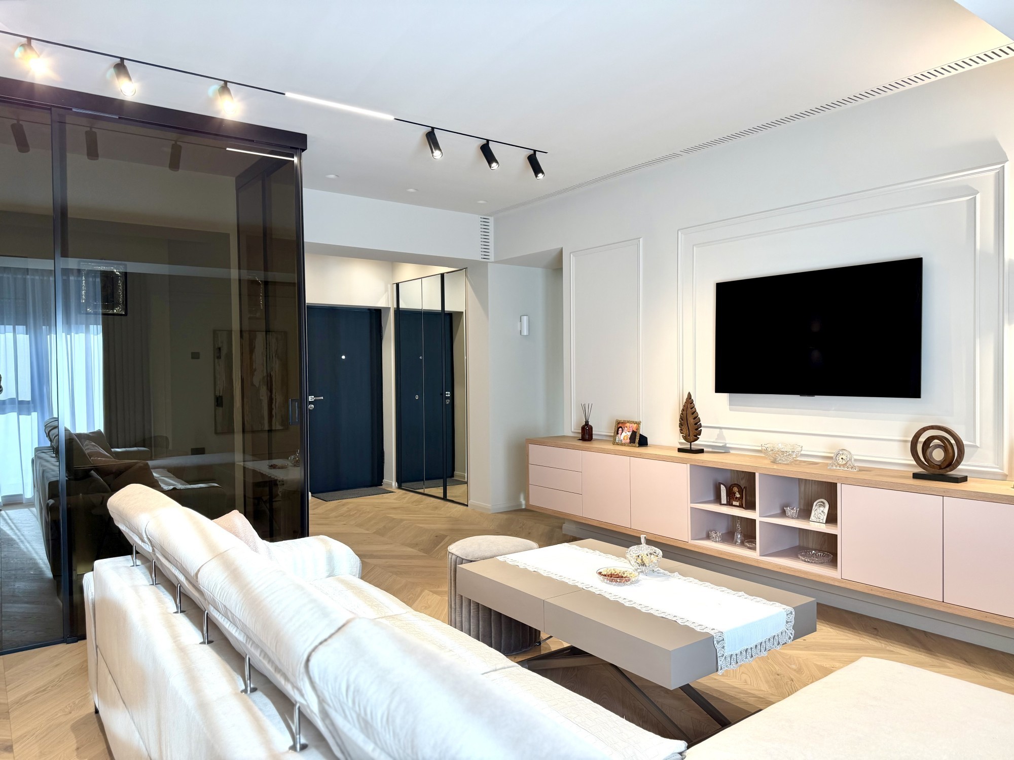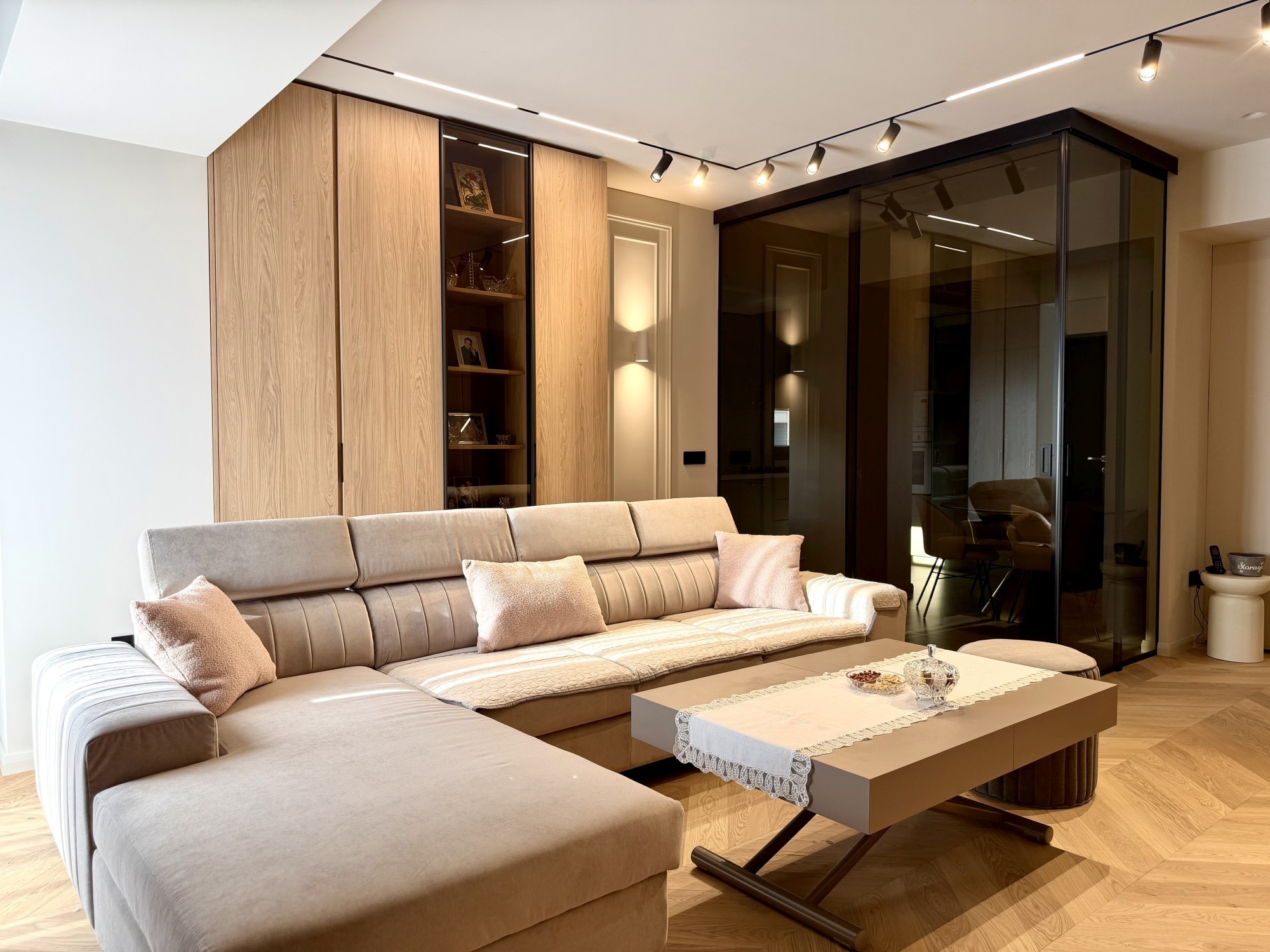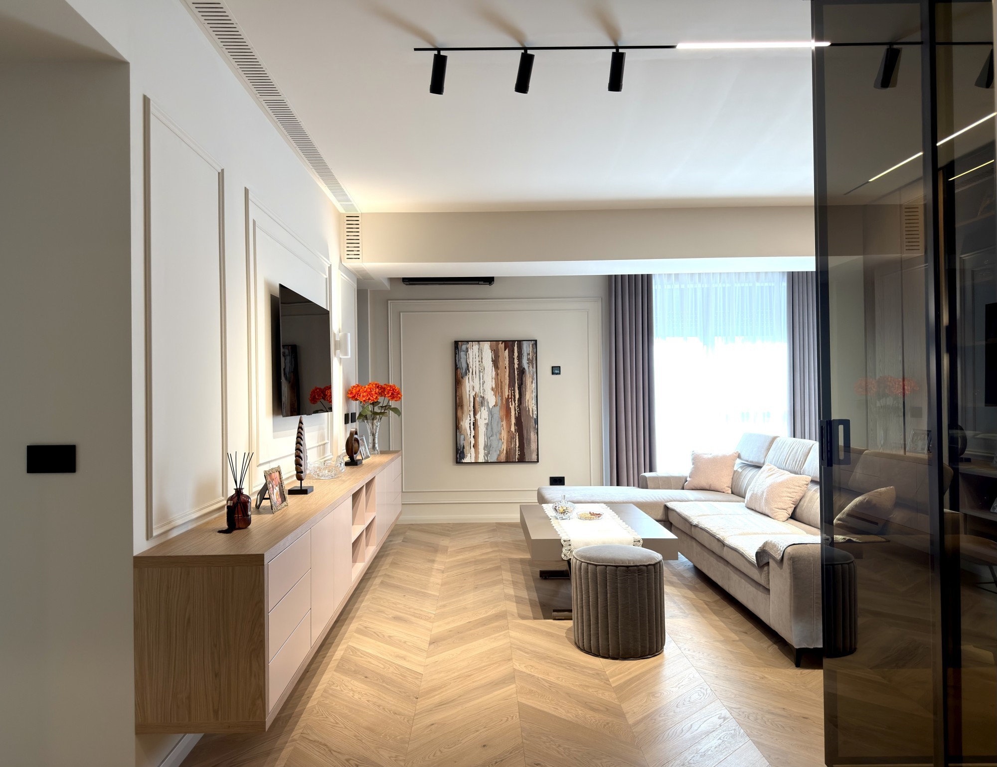 Livingul preia din cromatica bucatariei, cu placari de pereti superbe din nuante de grej cald si riflaje din lemn sofisticate . In zona de televizor, desi este compacta, am integrat un semineu electric pentru a crea o atmosfera si mai relaxanta.