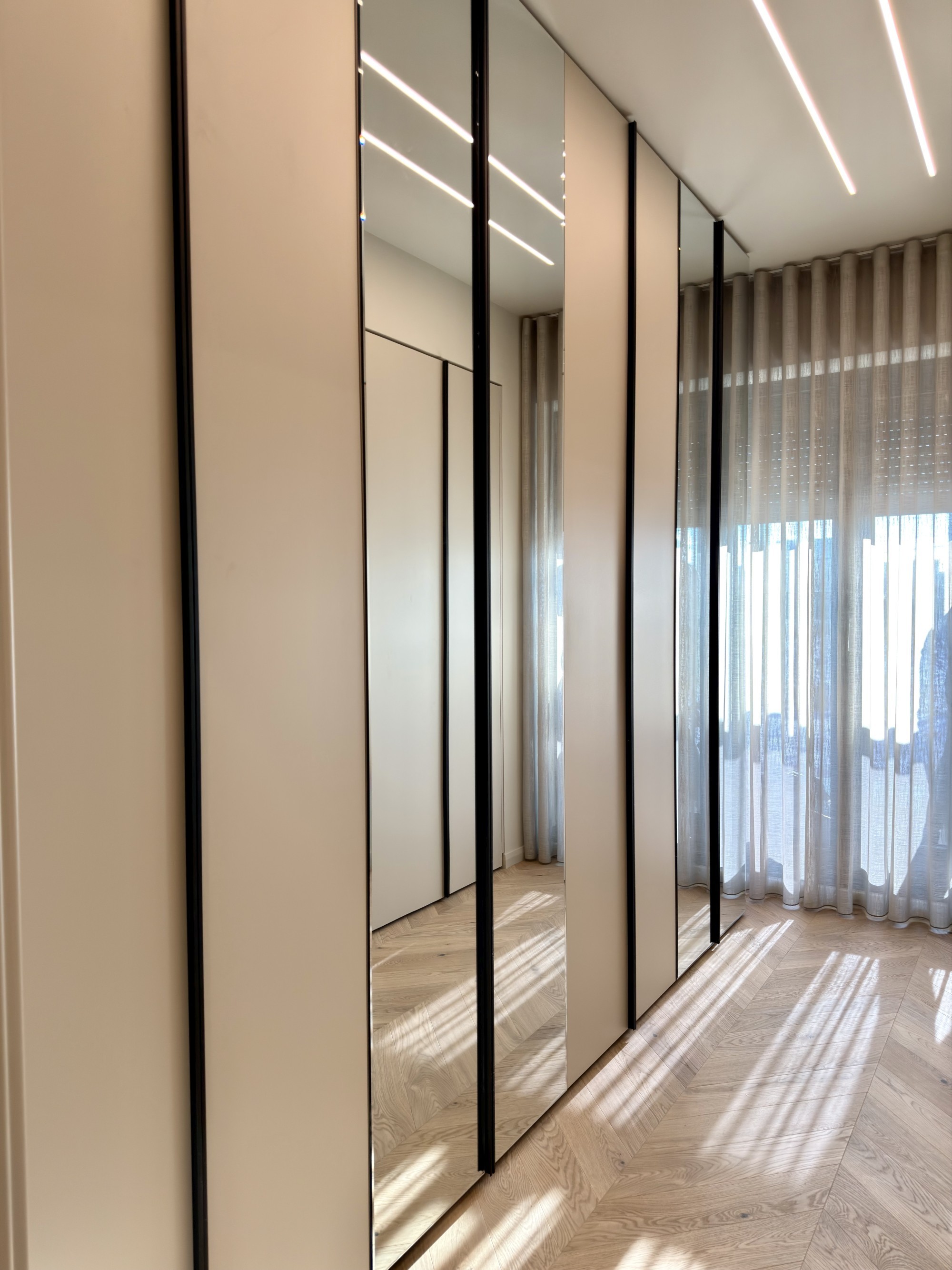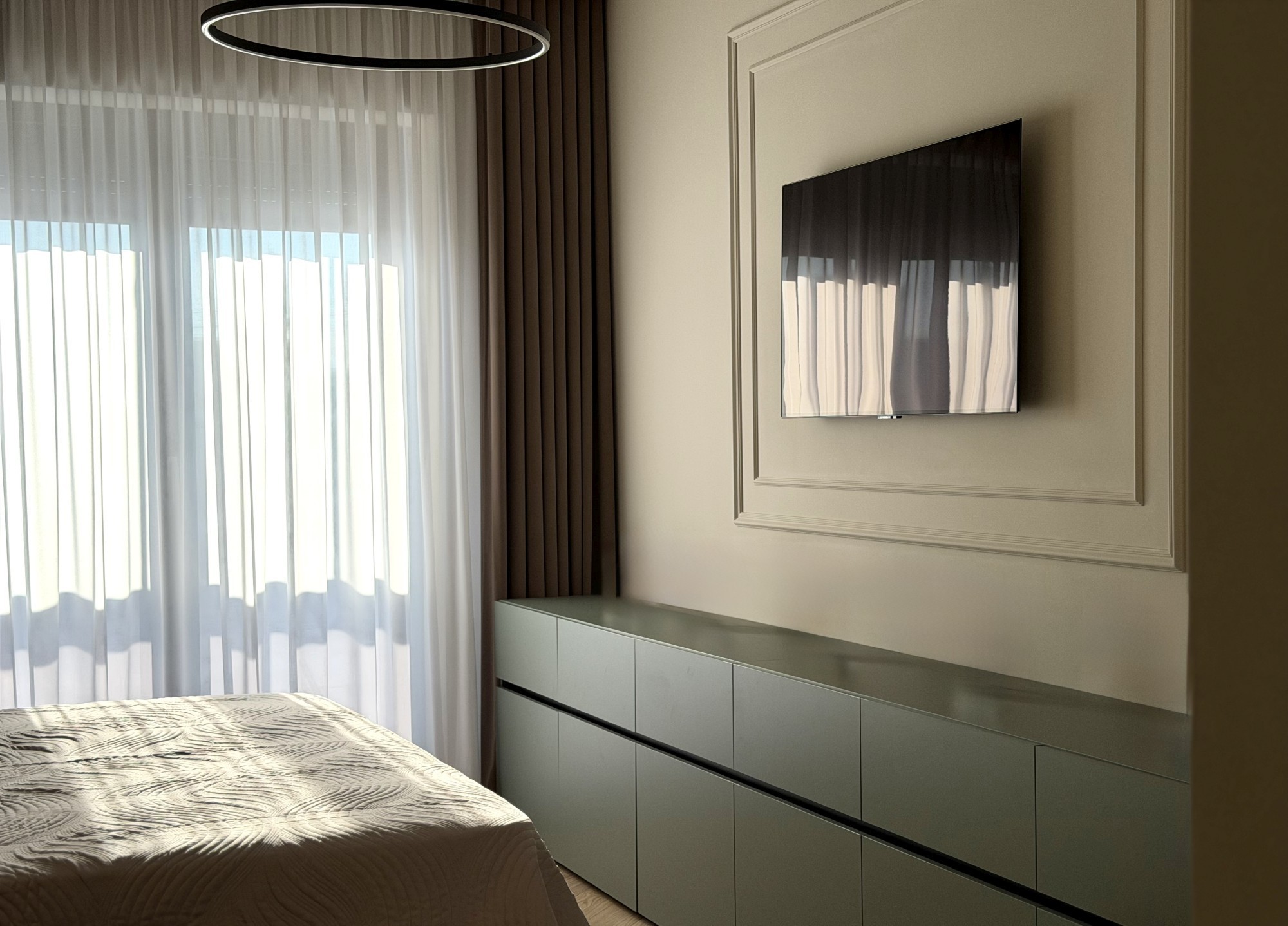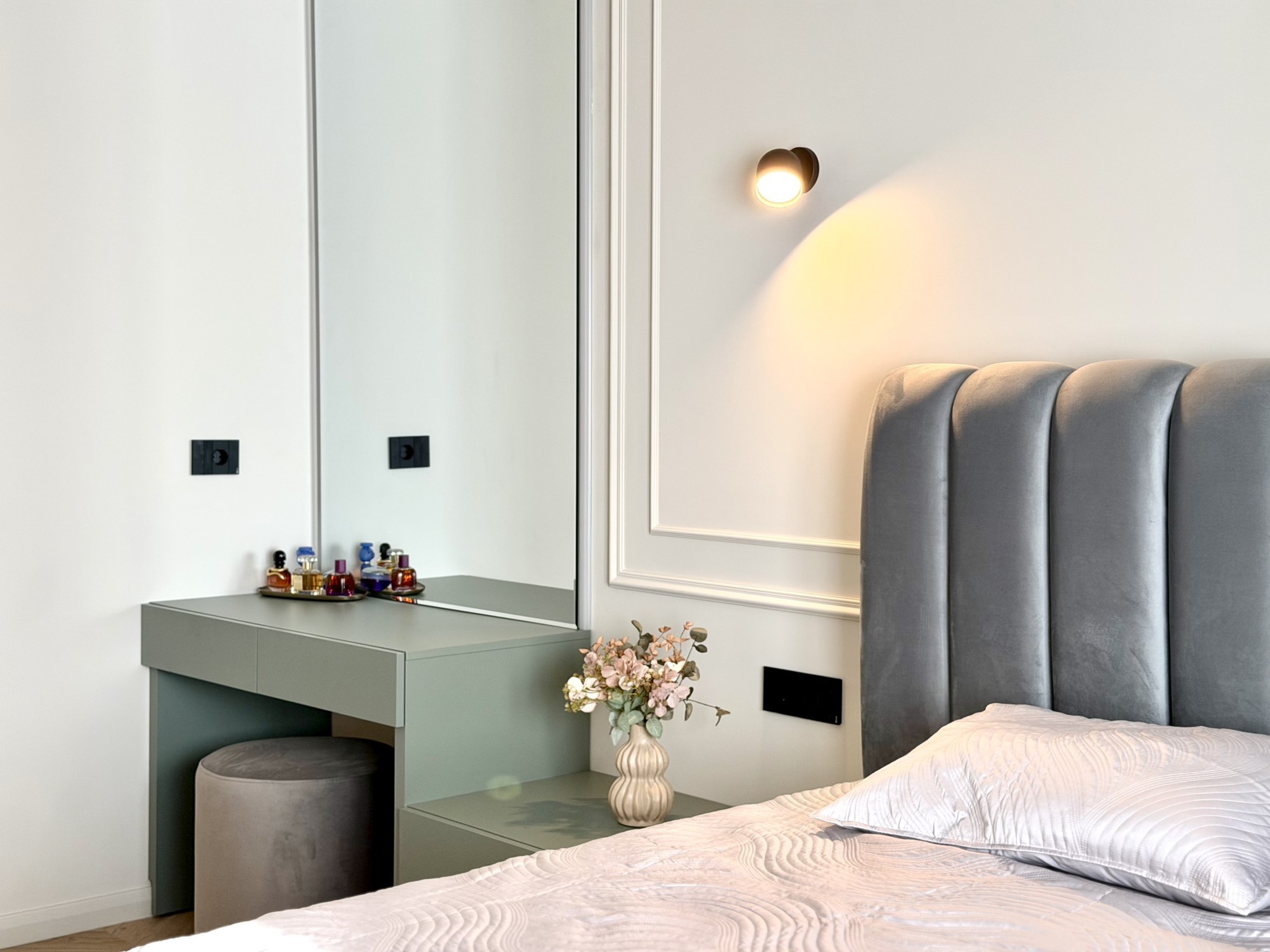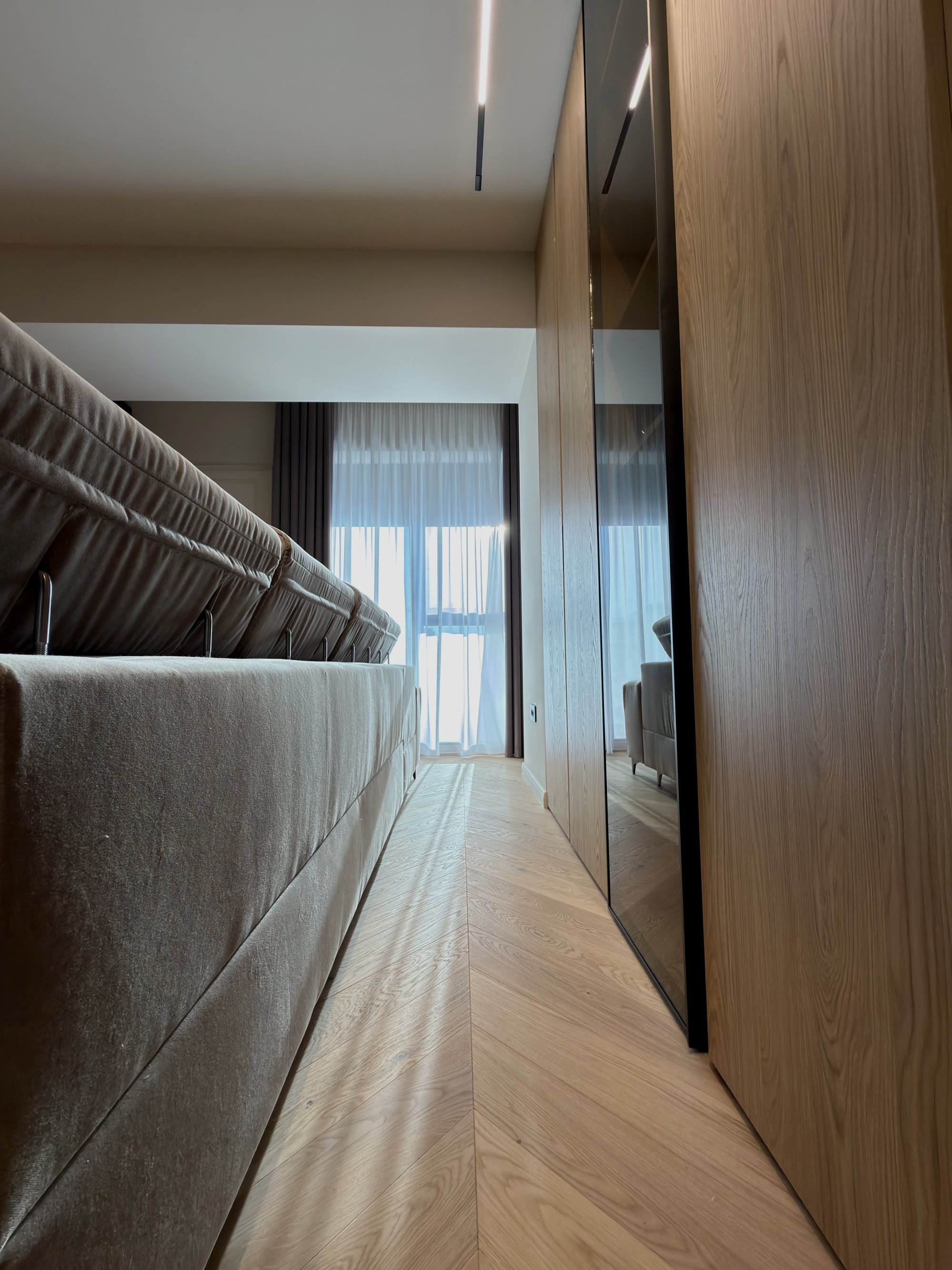 Amenjarea dormitoarelor este sofisticata, dar in acelasi timp calda. Punctul principal din cele 2 dormitoare sunt paturile, cu tablii inalte tapitate, care completeaza accentele de auriu, si pastreaza linia glamour pe care si-a dorit-o clientul.