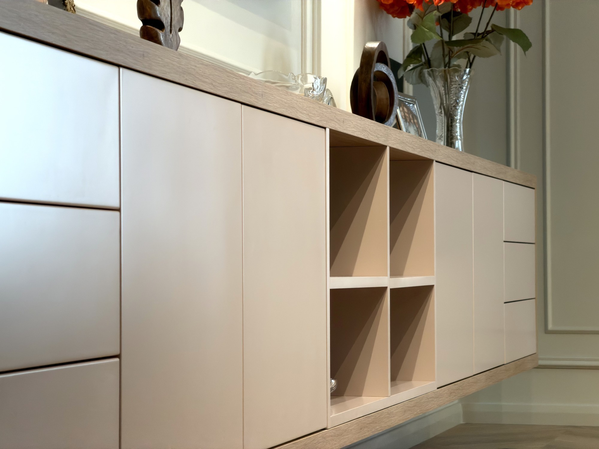 Mobilierul este realizat din PAL si MDF vopsit pe zona de bucatarie.