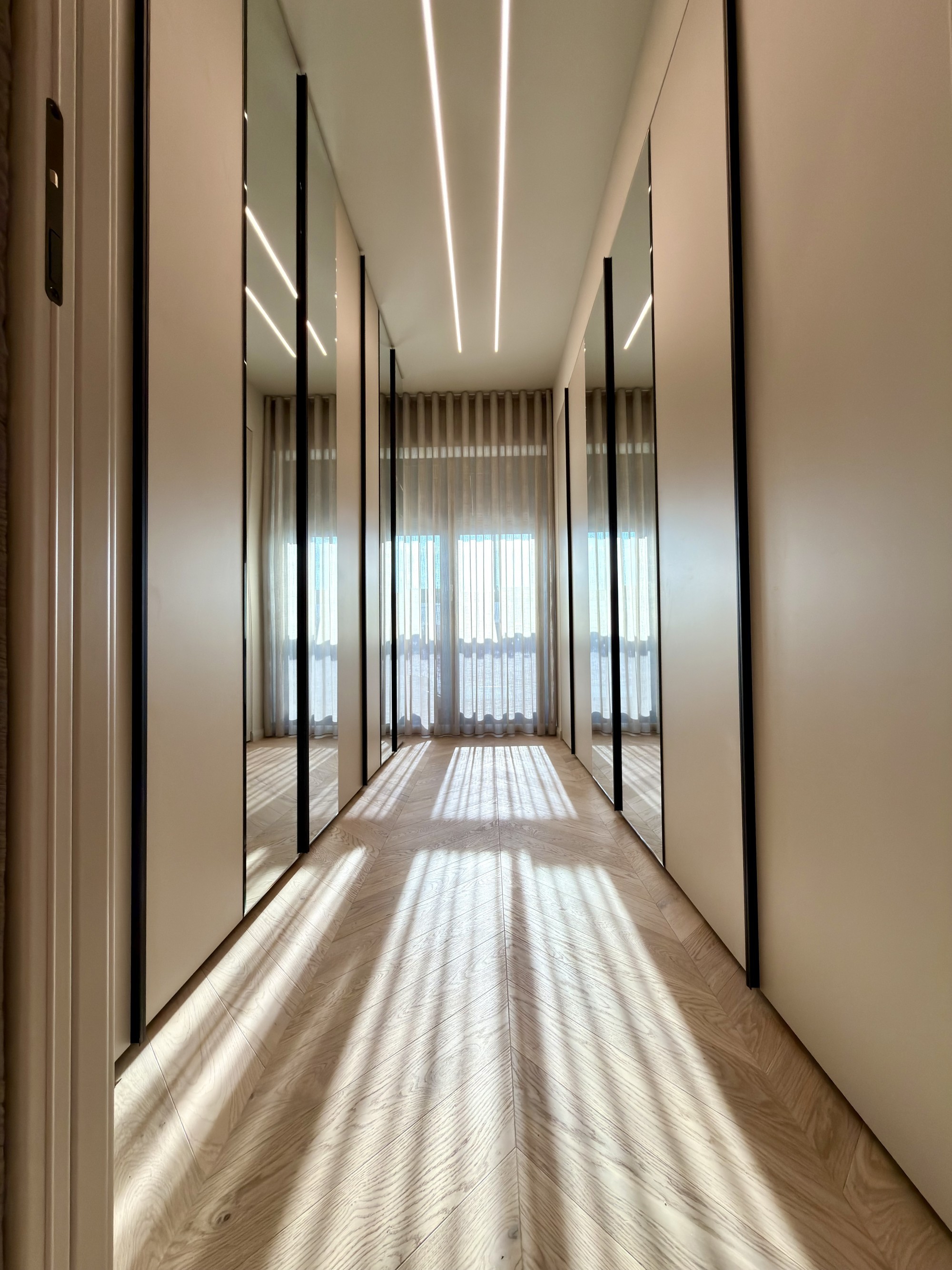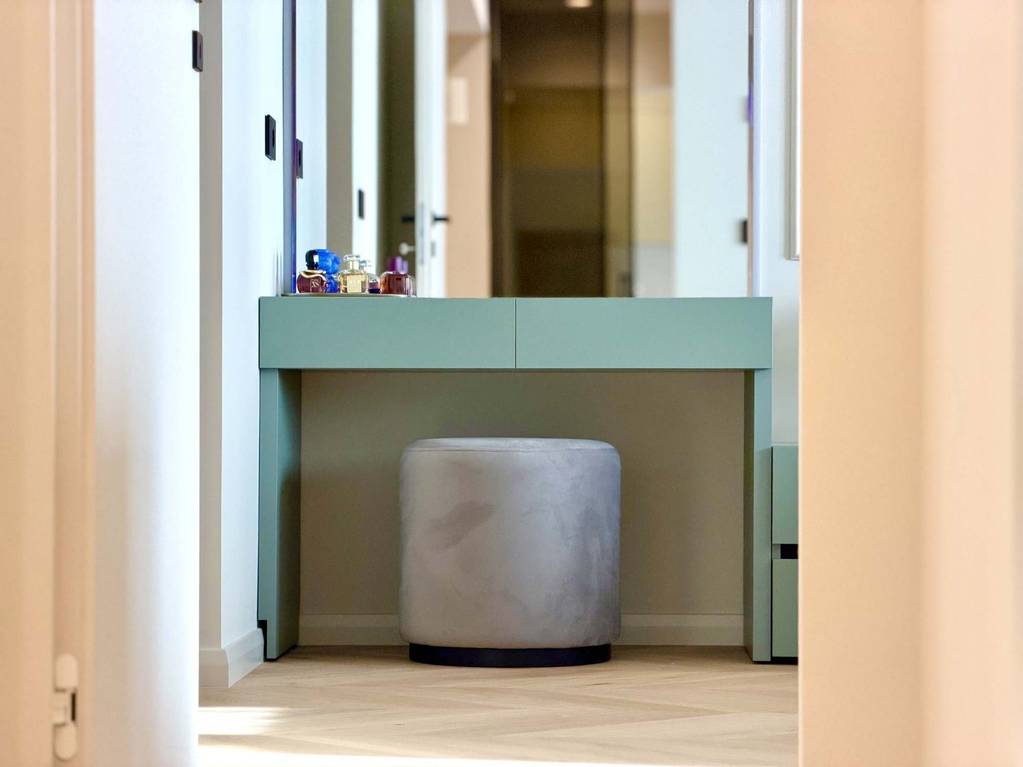 Holul ofera spatii generoase de depozitare, pe care le-am exploatat la maxim, prin duloapuri mari, facute pe comanda , pentru a castiga cat mai mult spatiu.
