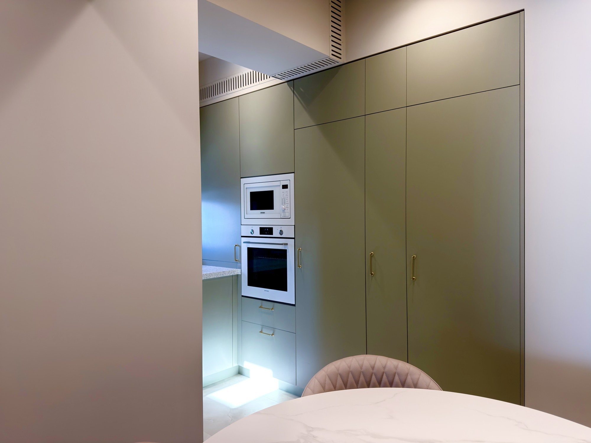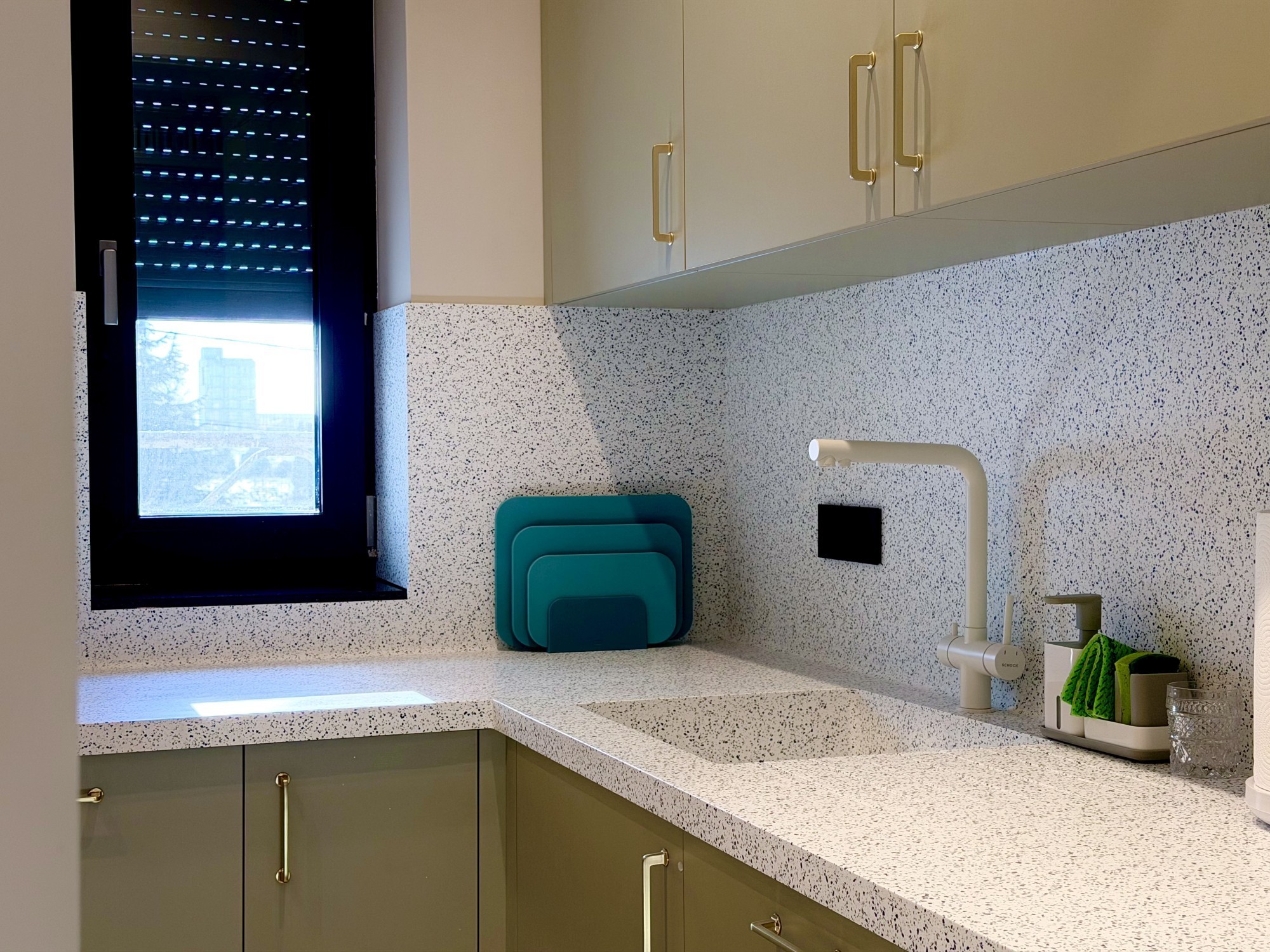 Bucataria nu este foarte mare, dar incorporare electrocanicelor ne ajuta sa pastram o linie curata. Corpurile realizate la comanda, cu usi de MDF vopsit cu maner frezat si sticla termorezistenta vopsita, in loc de clasica gresie , da senzatia unui spatiu aerisit, fara a face compromisuri la functionalitate.