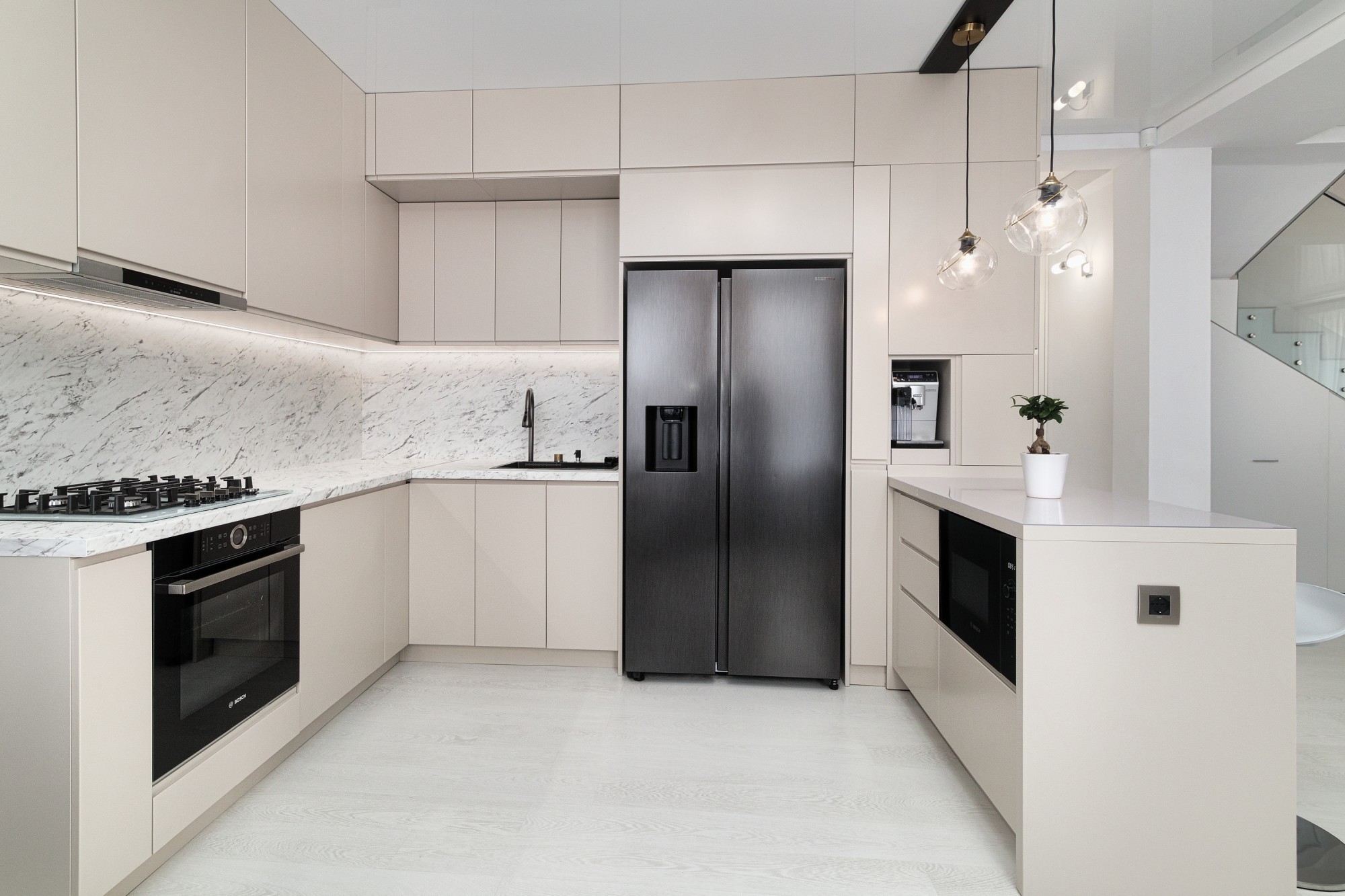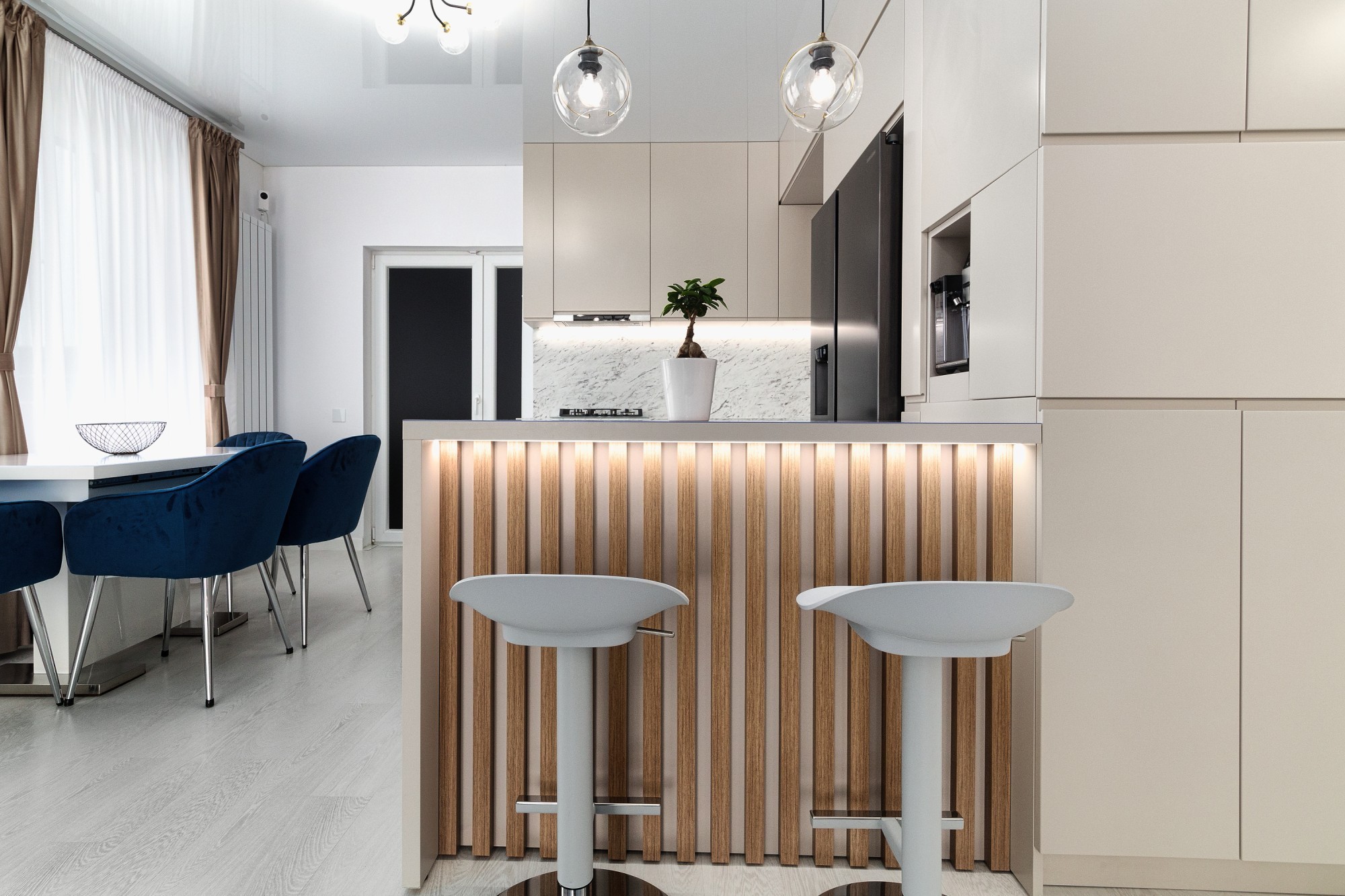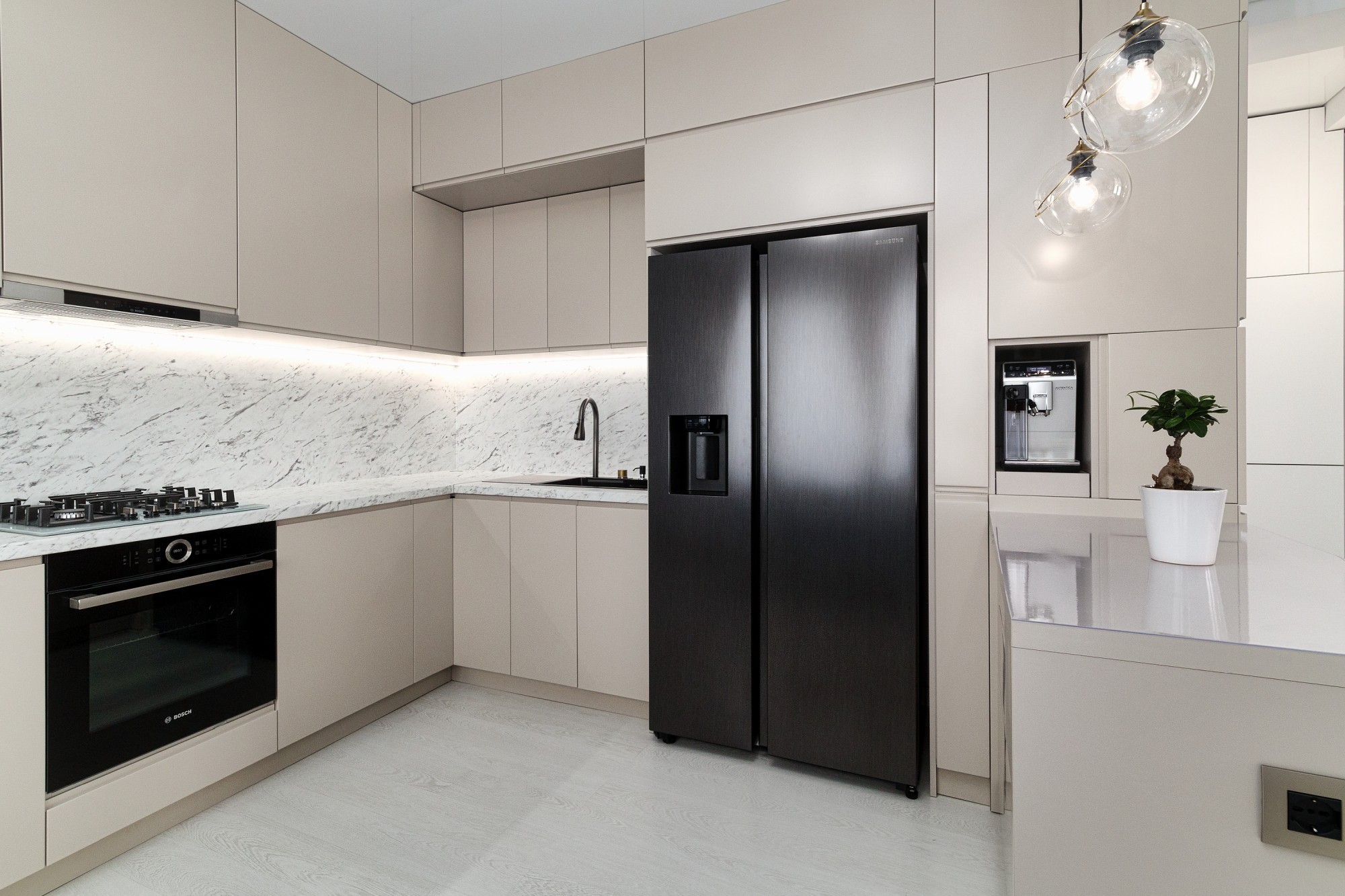 Zona de living se remarcă prin compoziția media suspendată și jocul dintre texturi mate, lemn cald și suprafețe minerale. Canapeaua generoasă și corpurile auxiliare rotunjite contribuie la o atmosferă confortabilă și coerentă vizual. Bucătăria continuă limbajul elegant prin fronturi uniforme, mânere metalice fine și o organizare eficientă a spațiului de lucru. În zonele de depozitare și dressing, oglinzile și finisajele deschise amplifică lumina și senzația de spațiu.