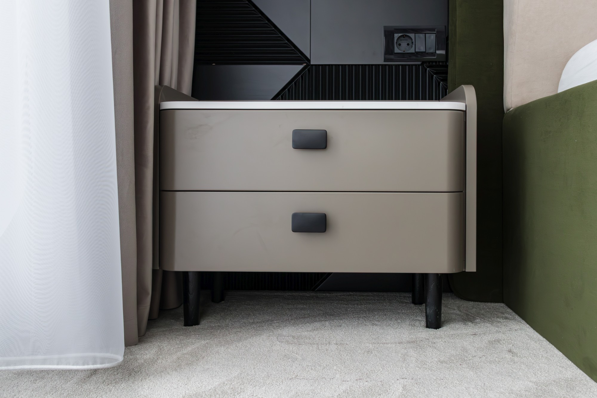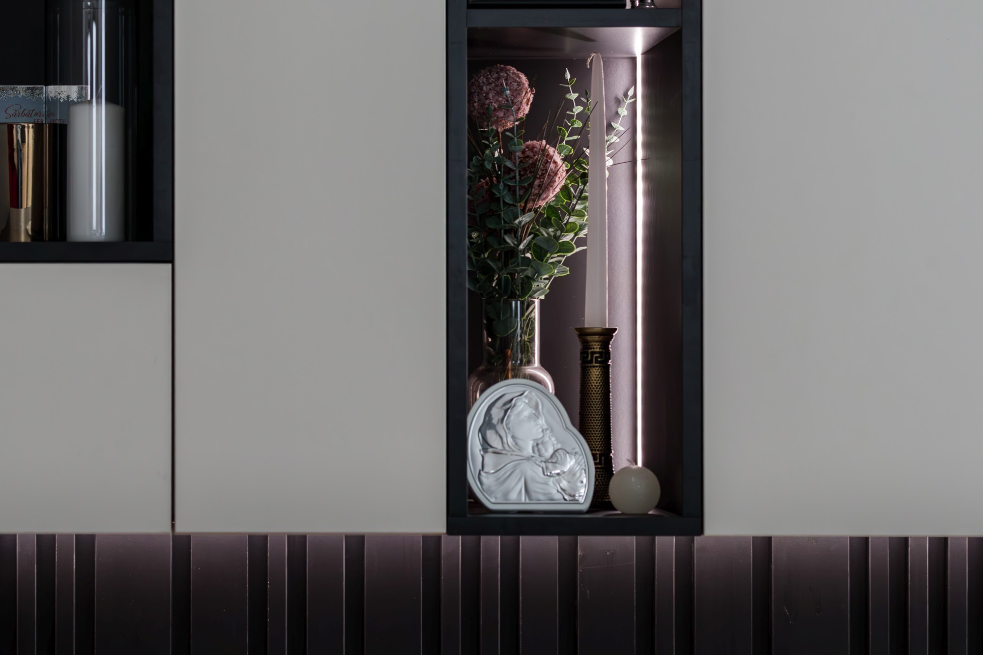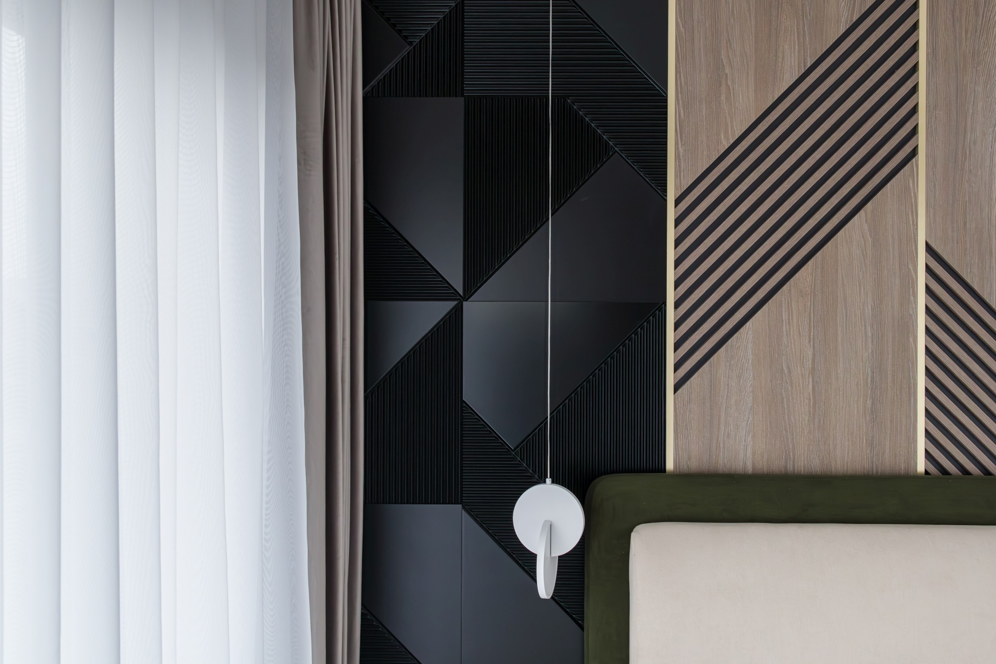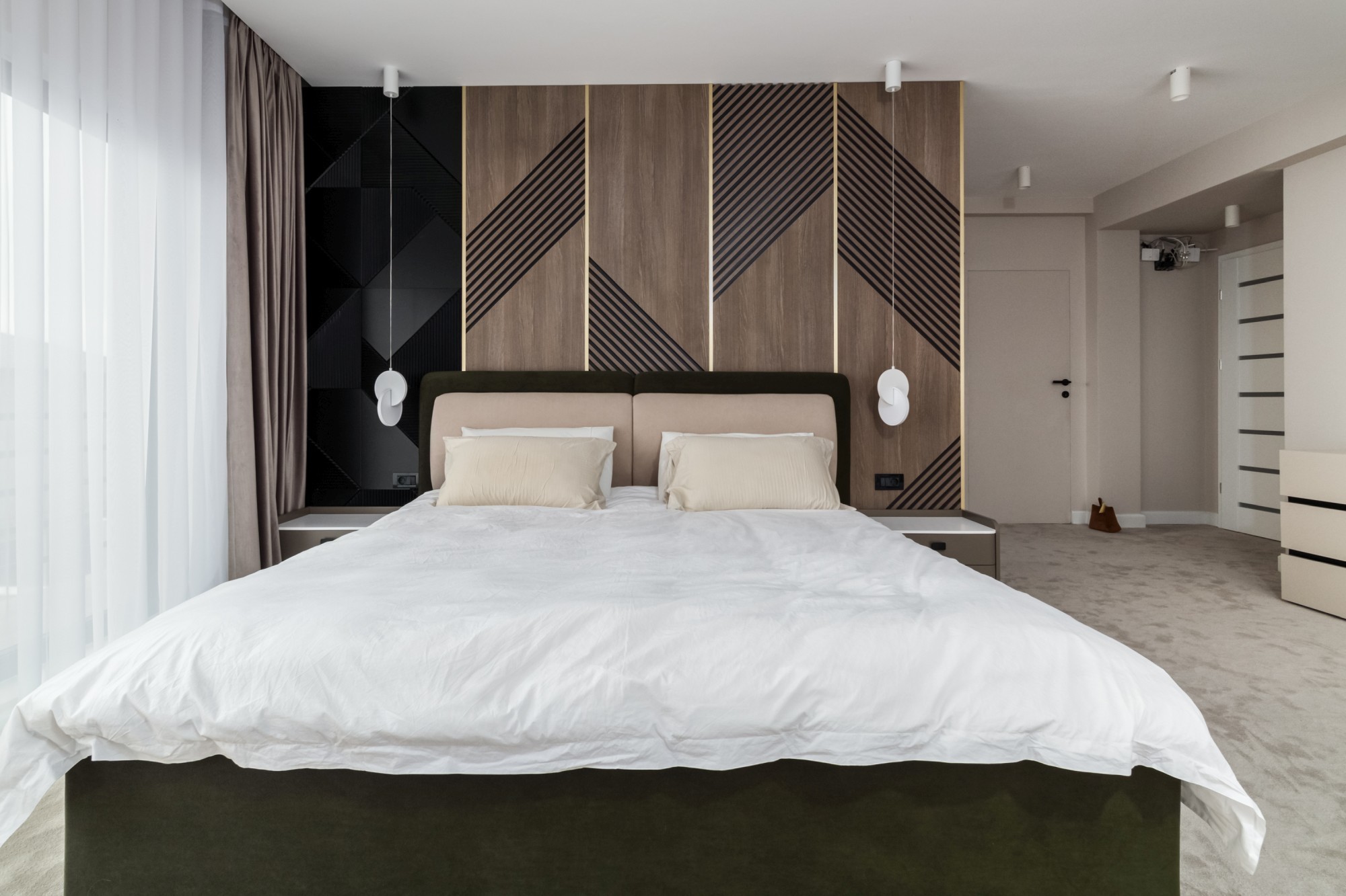 Bucătăria devine o piesă de arhitectură: fronturi mate în nuanță oliv, perfect aliniate, iar fundalul în negru creează adâncime și o estetică premium. Iluminarea caldă, integrată în zonele potrivite, accentuează liniile și face spațiul să pară și mai amplu. Piesele de mobilier cu detalii frezate și texturi de lemn (inclusiv fronturi cu ritm vertical) adaugă caracter fără să aglomereze. Dormitoarele completează povestea cu pereți statement: panouri geometrice/chevron și lumină ambientală caldă, care transformă zona patului într-o scenă elegantă, de hotel.