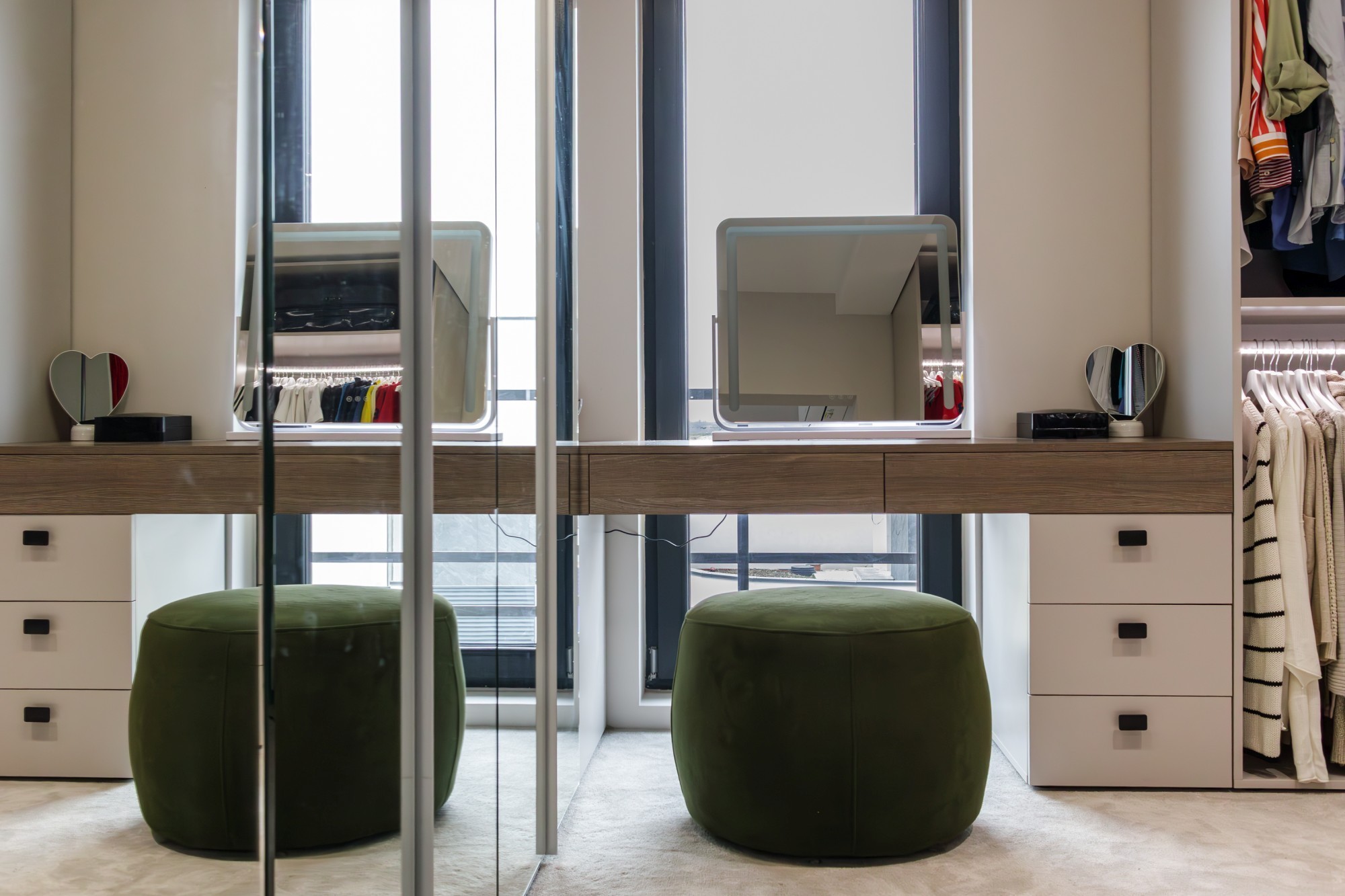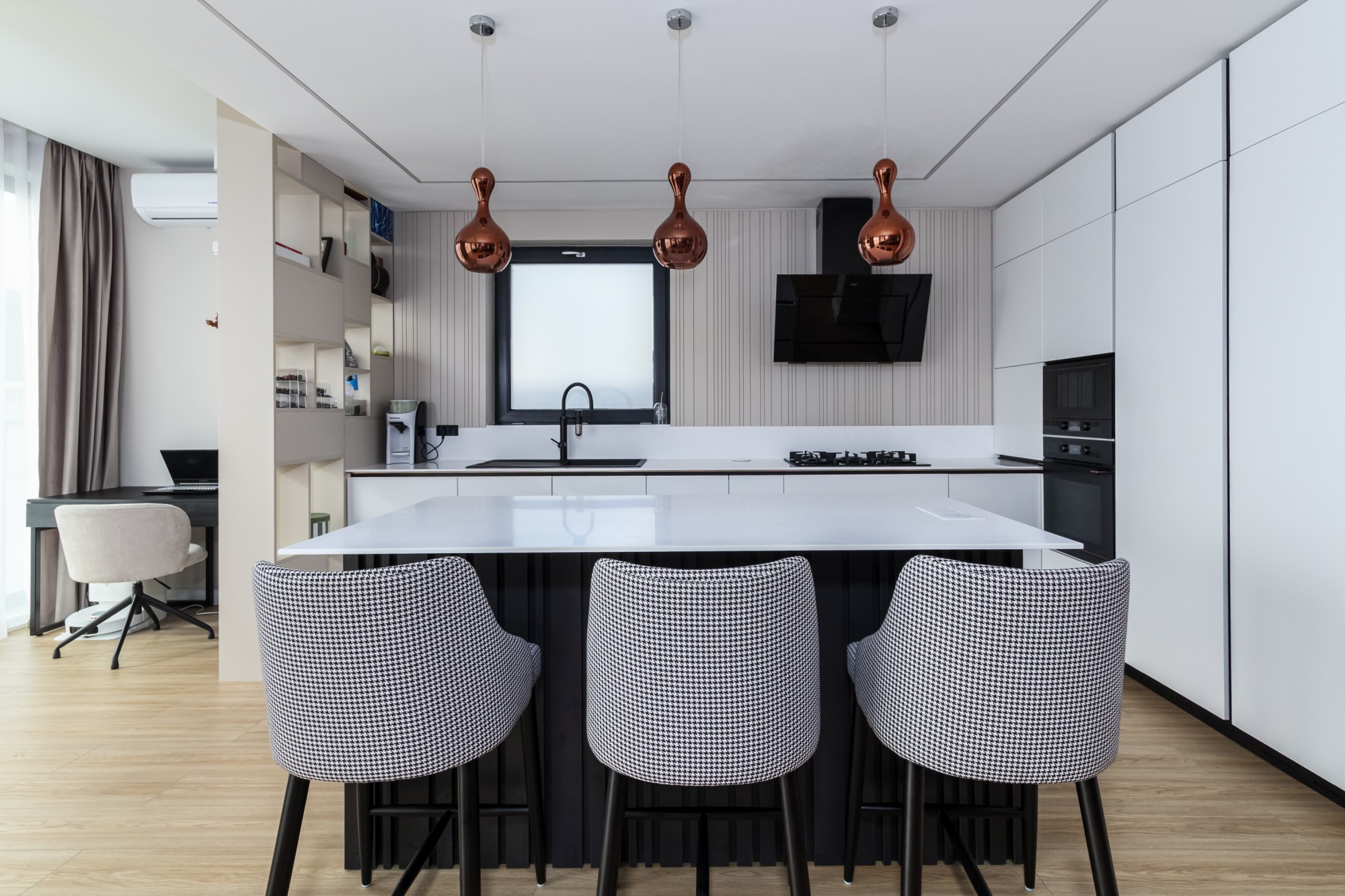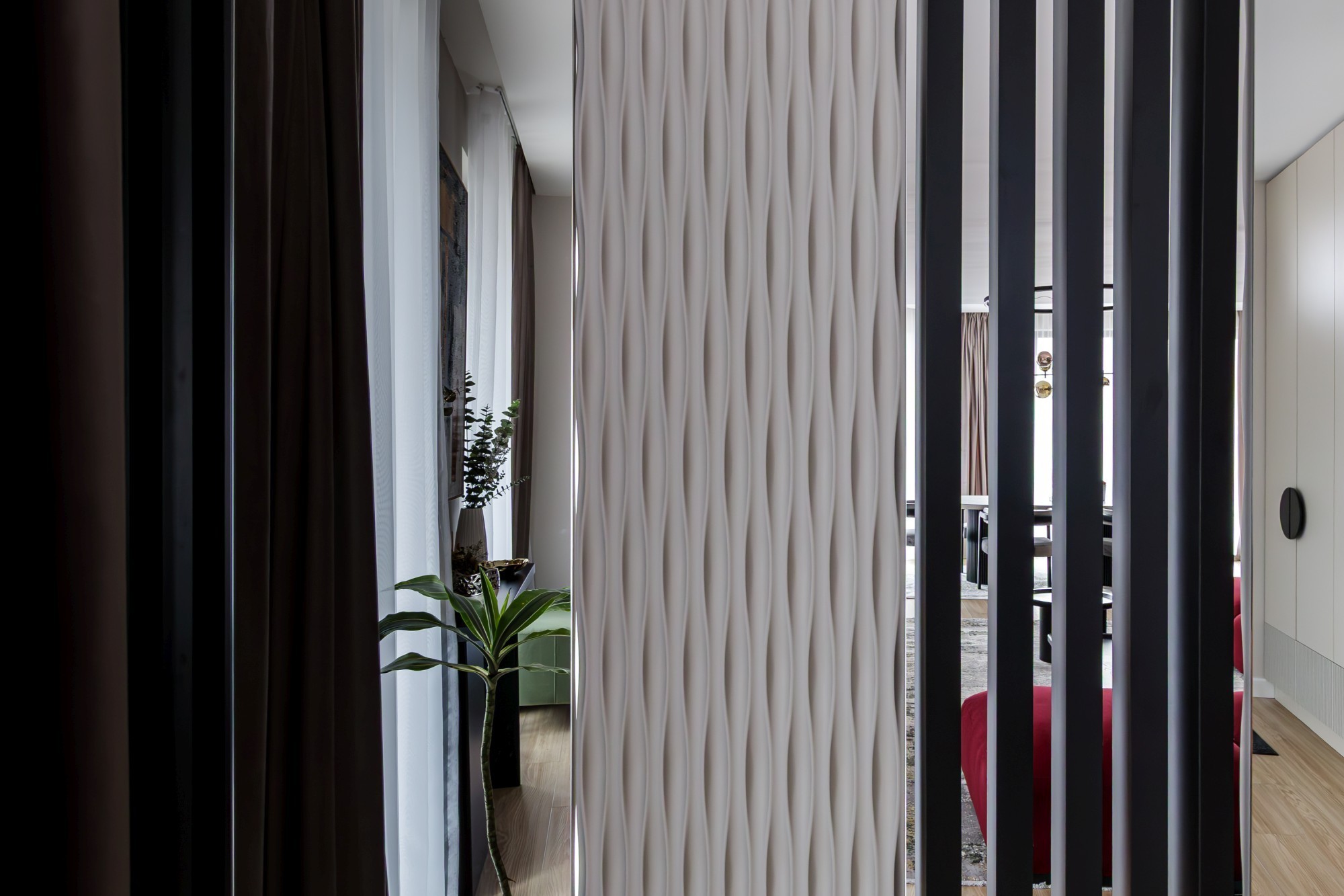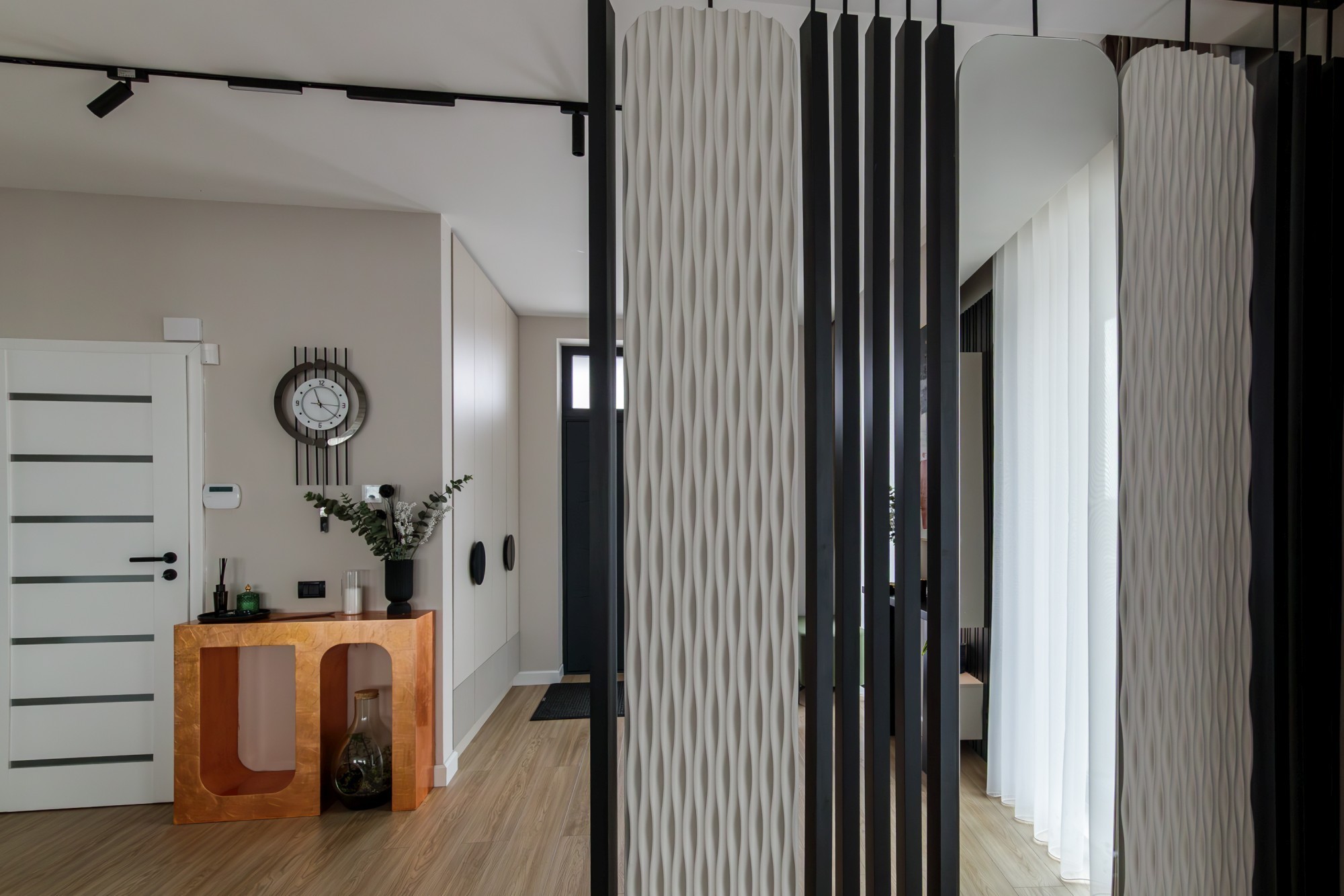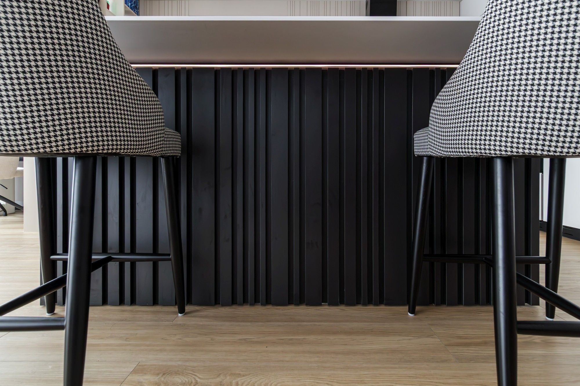 Bucătăria devine o piesă de arhitectură: fronturi mate în nuanță oliv, perfect aliniate, iar fundalul în negru creează adâncime și o estetică premium. Iluminarea caldă, integrată în zonele potrivite, accentuează liniile și face spațiul să pară și mai amplu. Piesele de mobilier cu detalii frezate și texturi de lemn (inclusiv fronturi cu ritm vertical) adaugă caracter fără să aglomereze. Dormitoarele completează povestea cu pereți statement: panouri geometrice/chevron și lumină ambientală caldă, care transformă zona patului într-o scenă elegantă, de hotel.