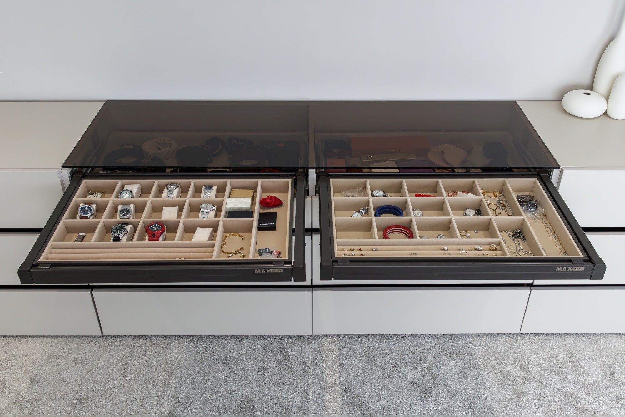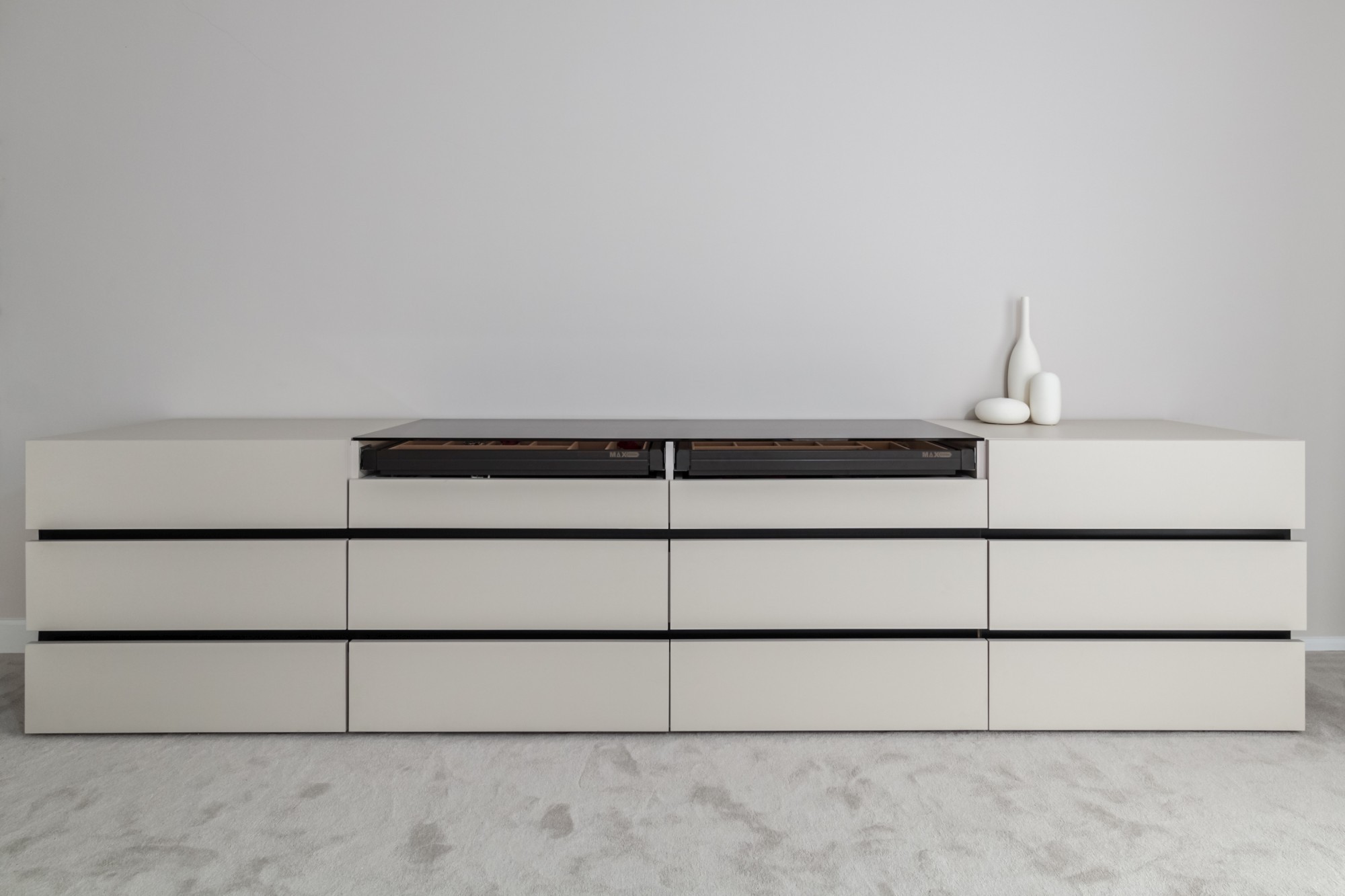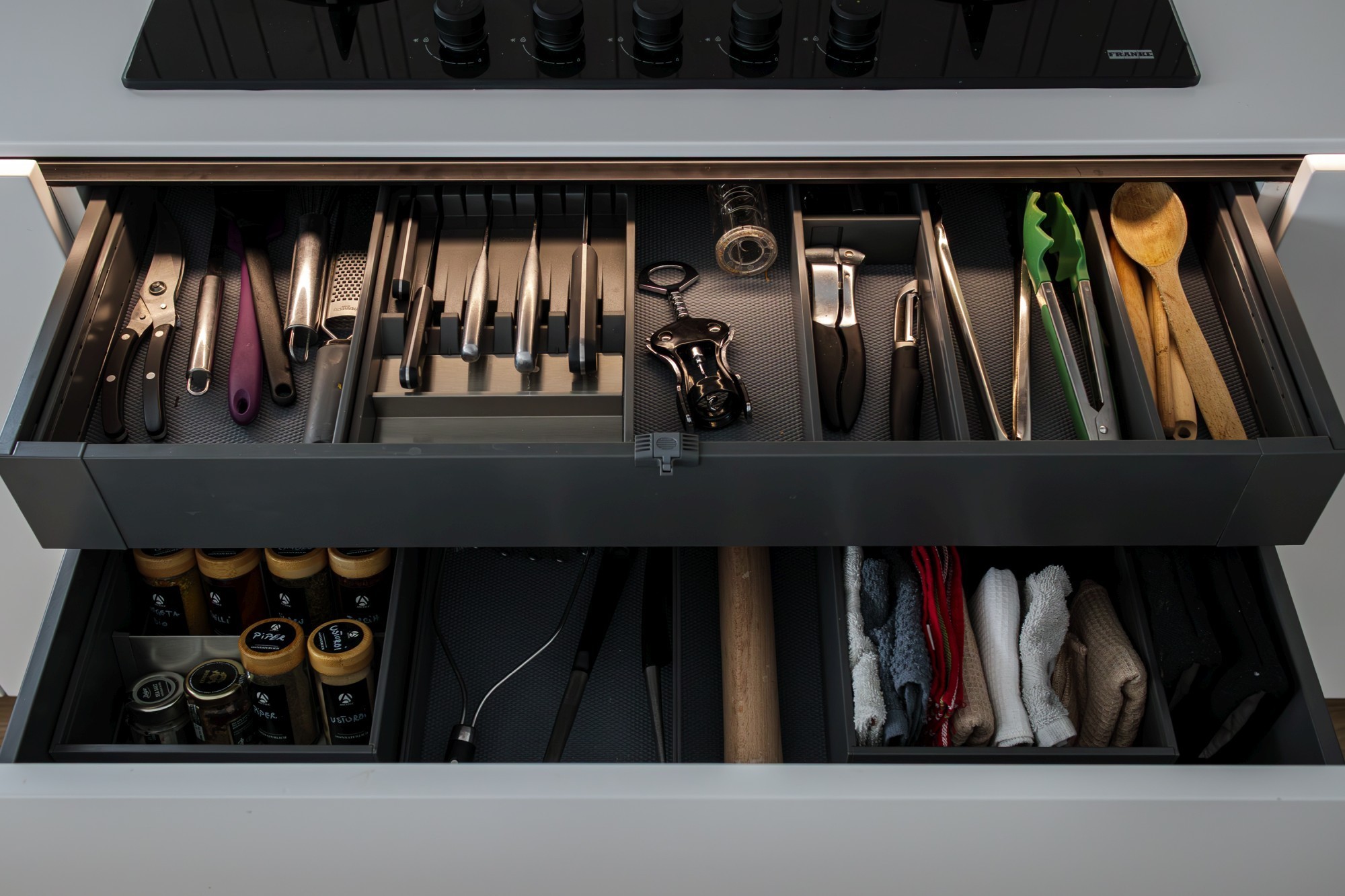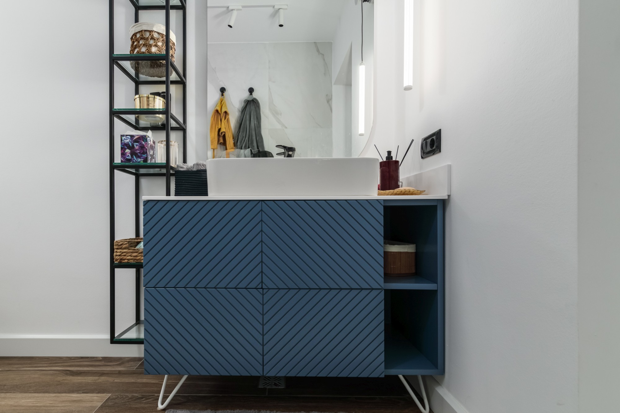 Paleta cromatică – tonurile calde de stejar natural construiesc baza vizuală a proiectului și aduc o senzație autentică de confort. Nuanțele sofisticate de oliv și taupe temperează ansamblul și oferă profunzime, iar accentele negre adaugă contrast și claritate liniilor.