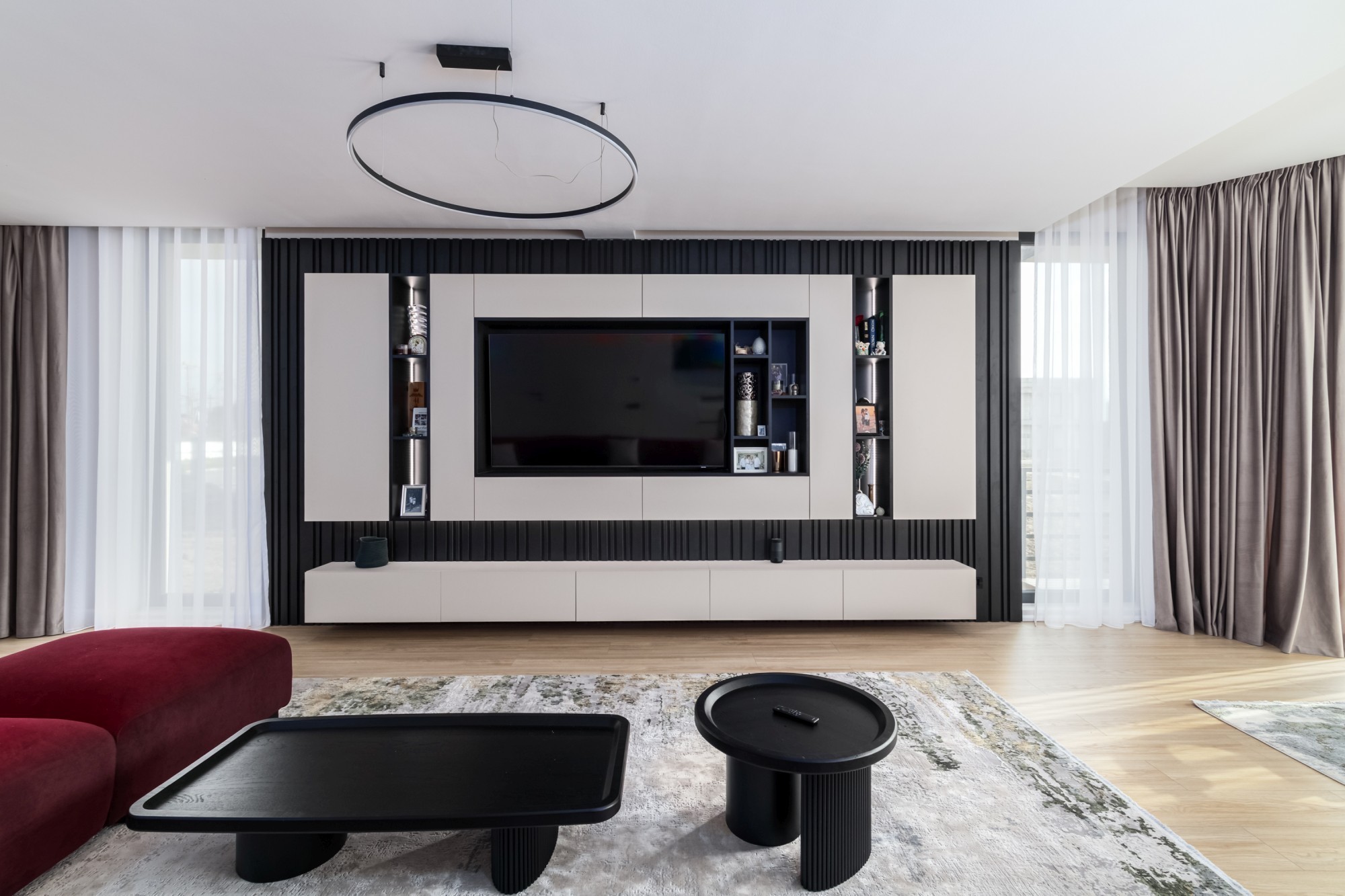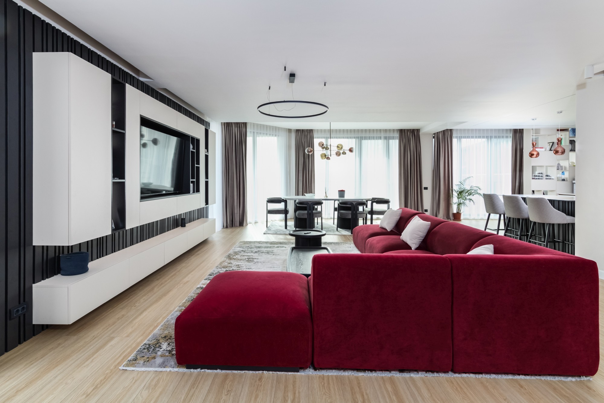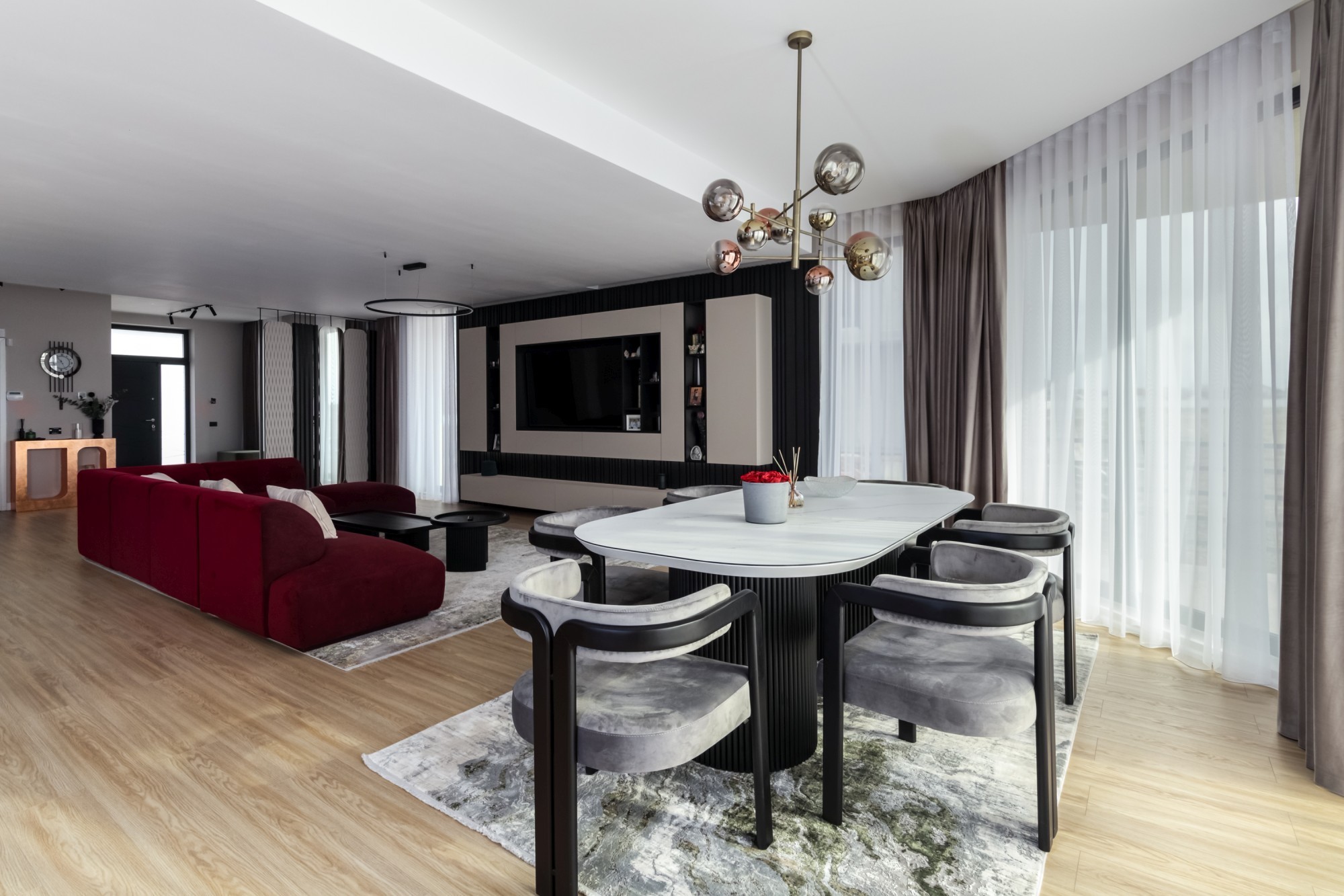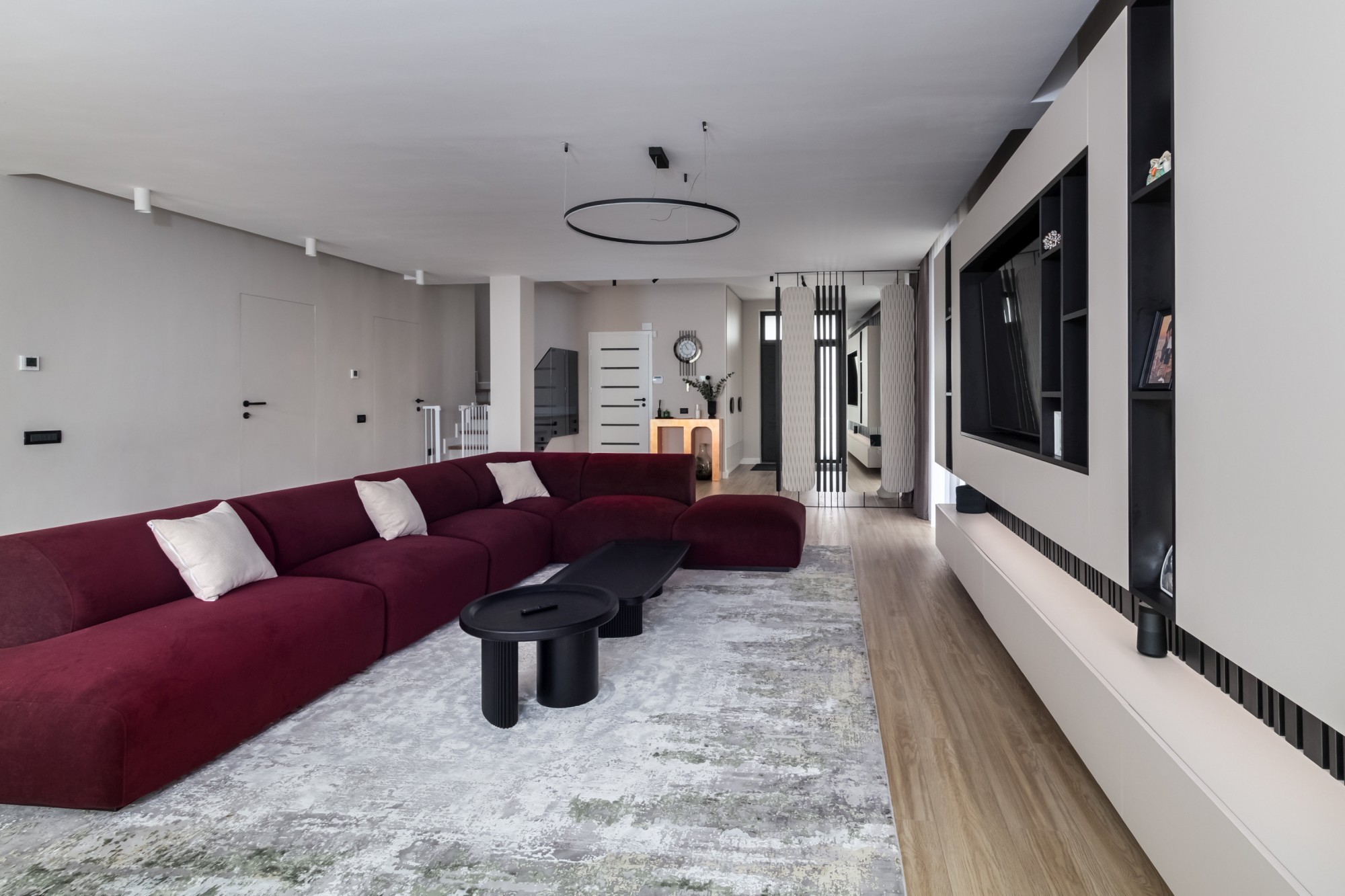 Rezultatul este un interior puternic, dar calm, care combină disciplina liniilor contemporane cu căldura lemnului și cu un joc de contraste (oliv–negru–grej) foarte actual. Spațiul se simte mare, aerisit și premium, iar detaliile la comandă (panourile, fronturile, luminile integrate) dau exact acel „ceva” care îl face memorabil.