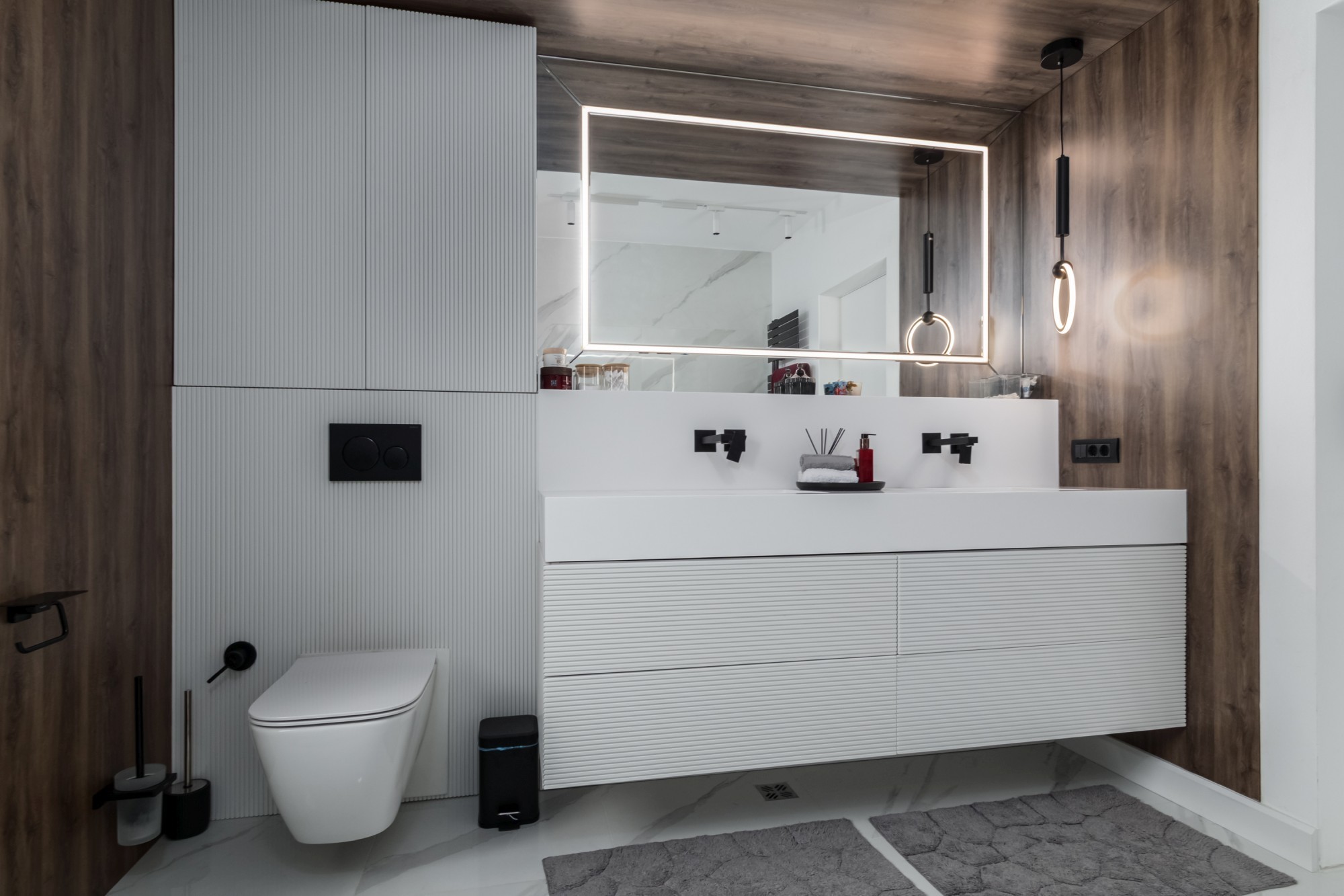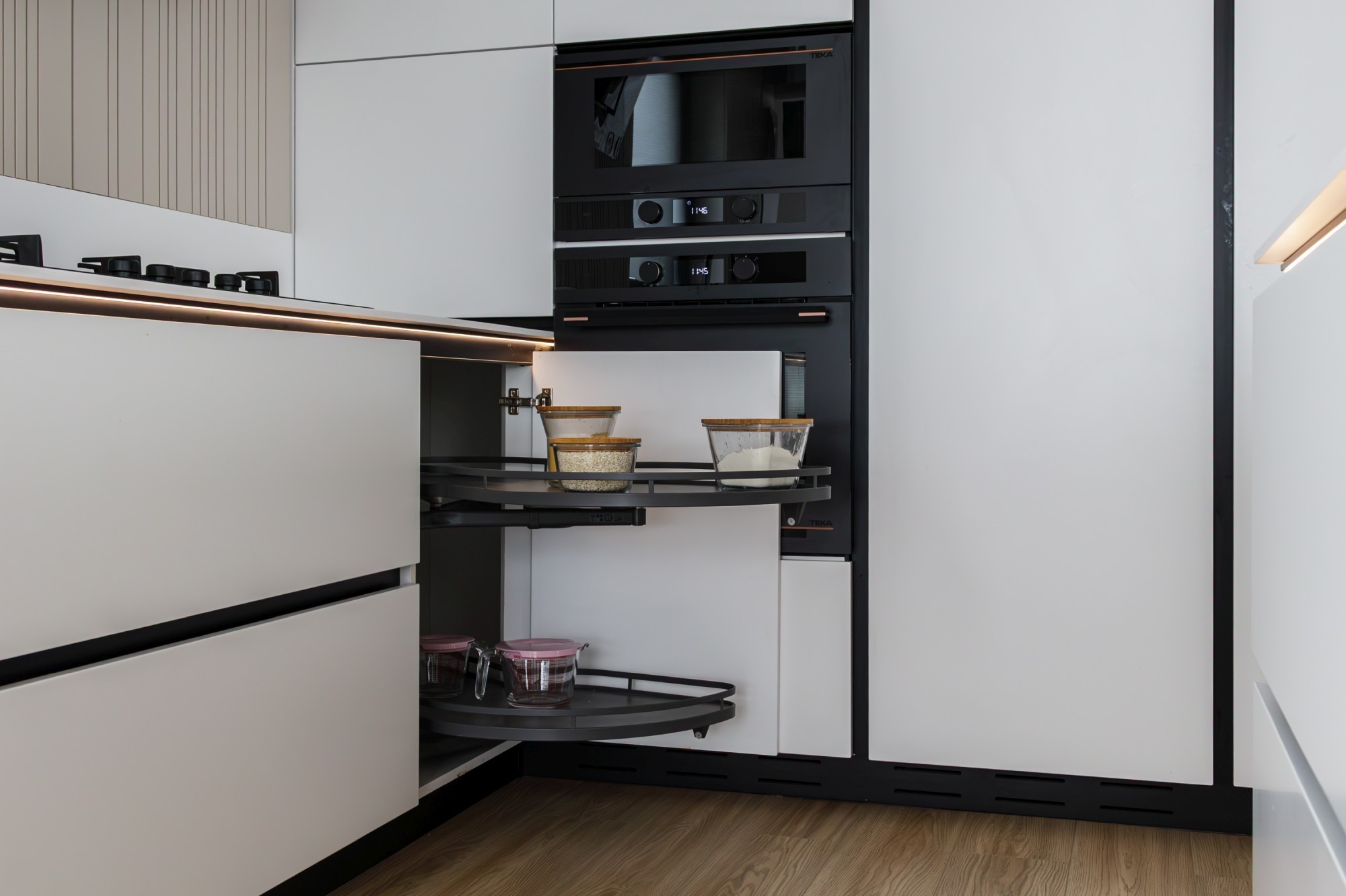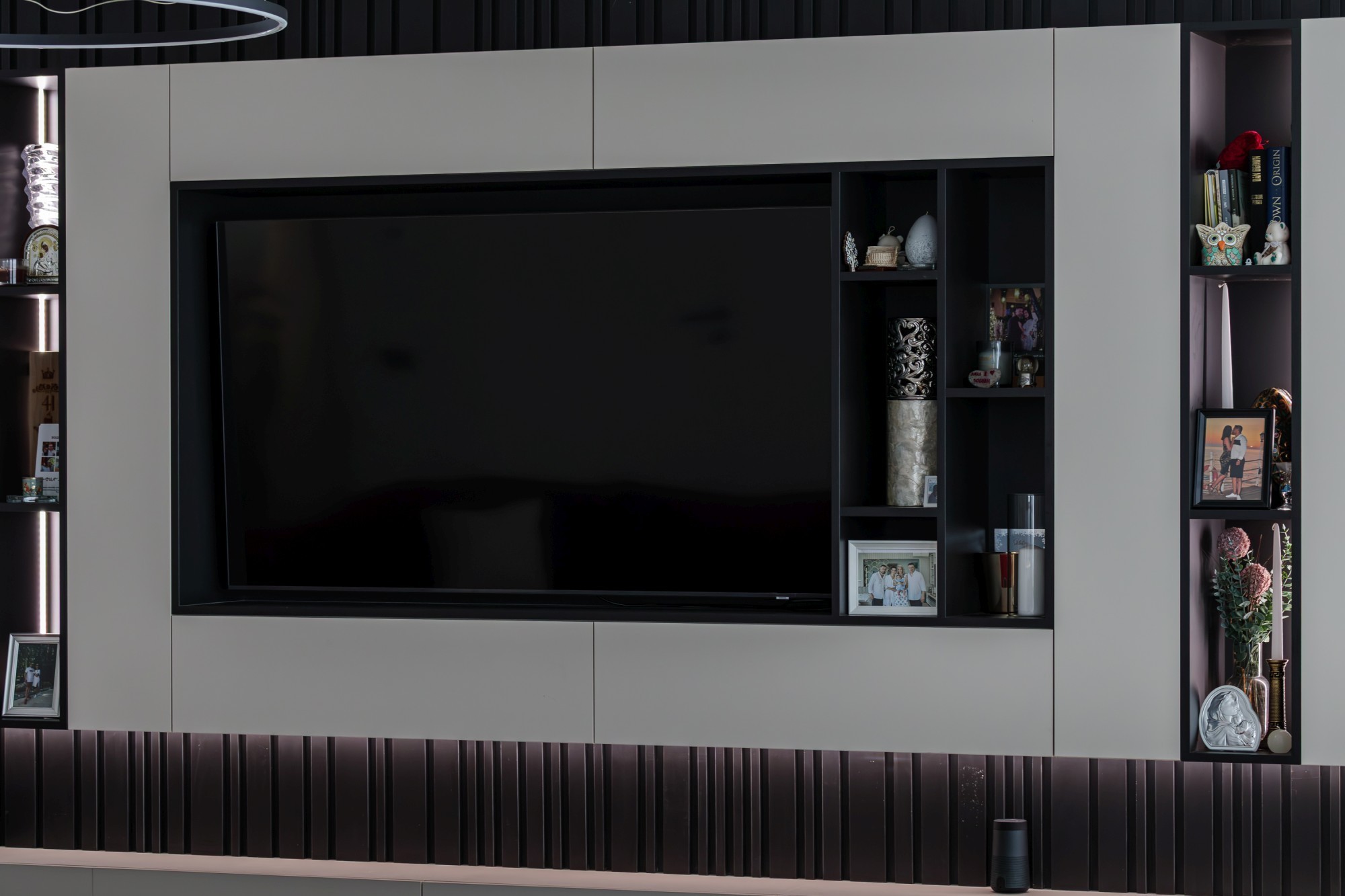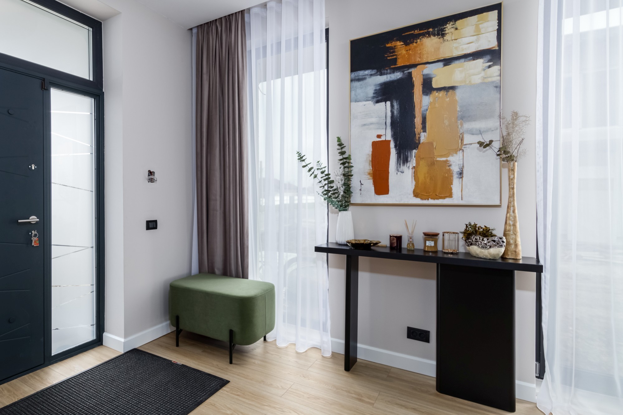 Rezultatul este un interior puternic, dar calm, care combină disciplina liniilor contemporane cu căldura lemnului și cu un joc de contraste (oliv–negru–grej) foarte actual. Spațiul se simte mare, aerisit și premium, iar detaliile la comandă (panourile, fronturile, luminile integrate) dau exact acel „ceva” care îl face memorabil.
