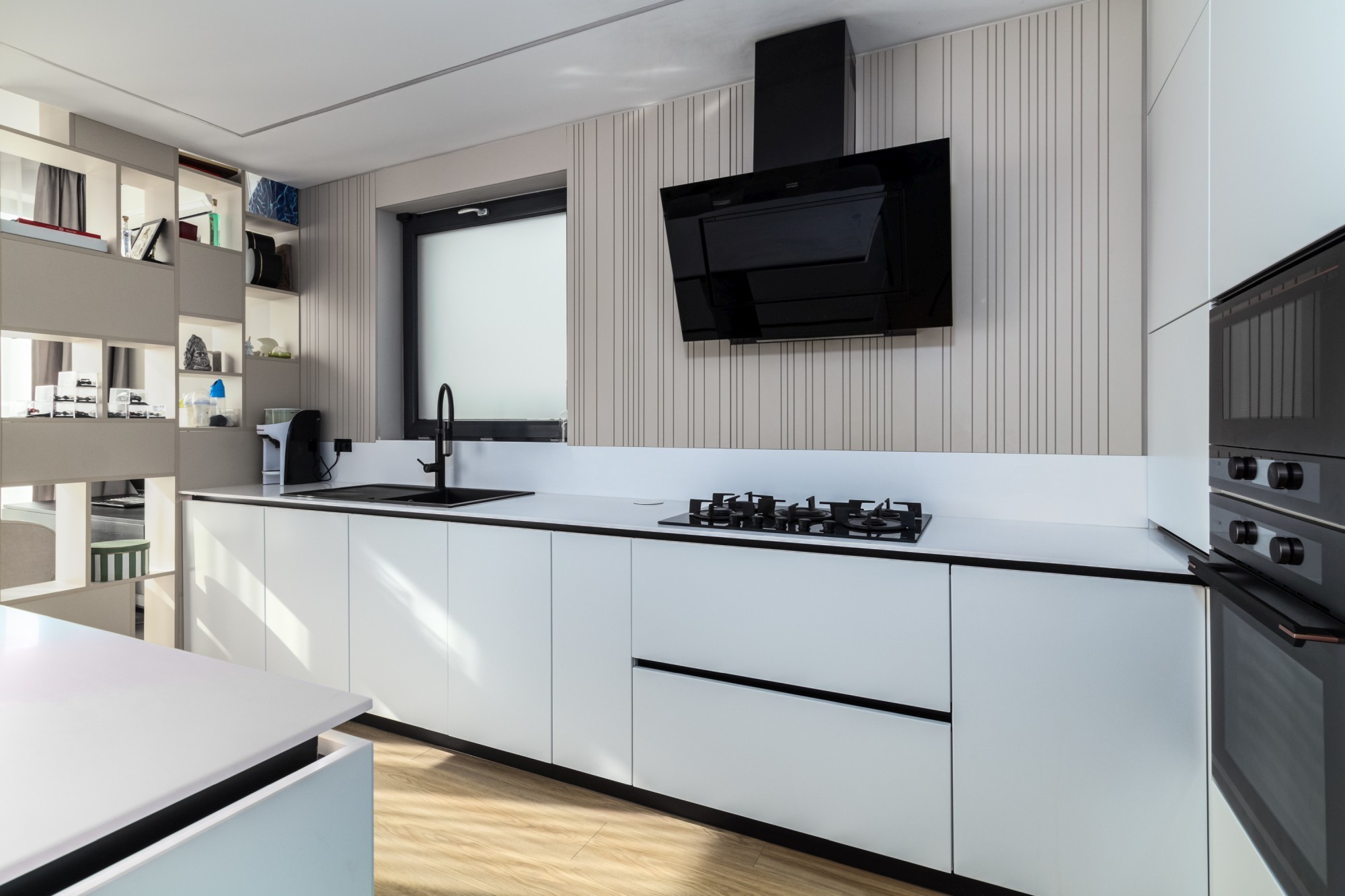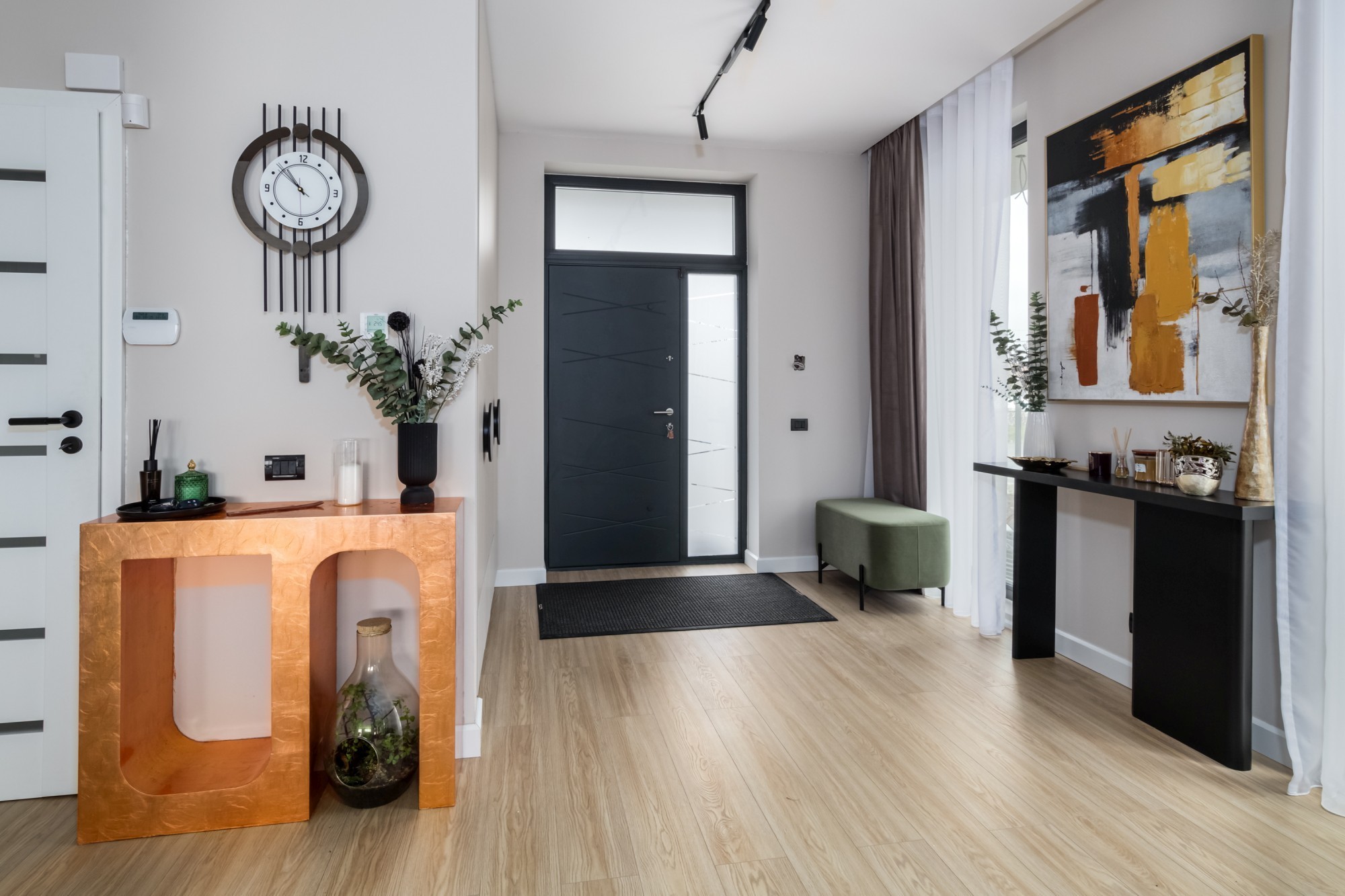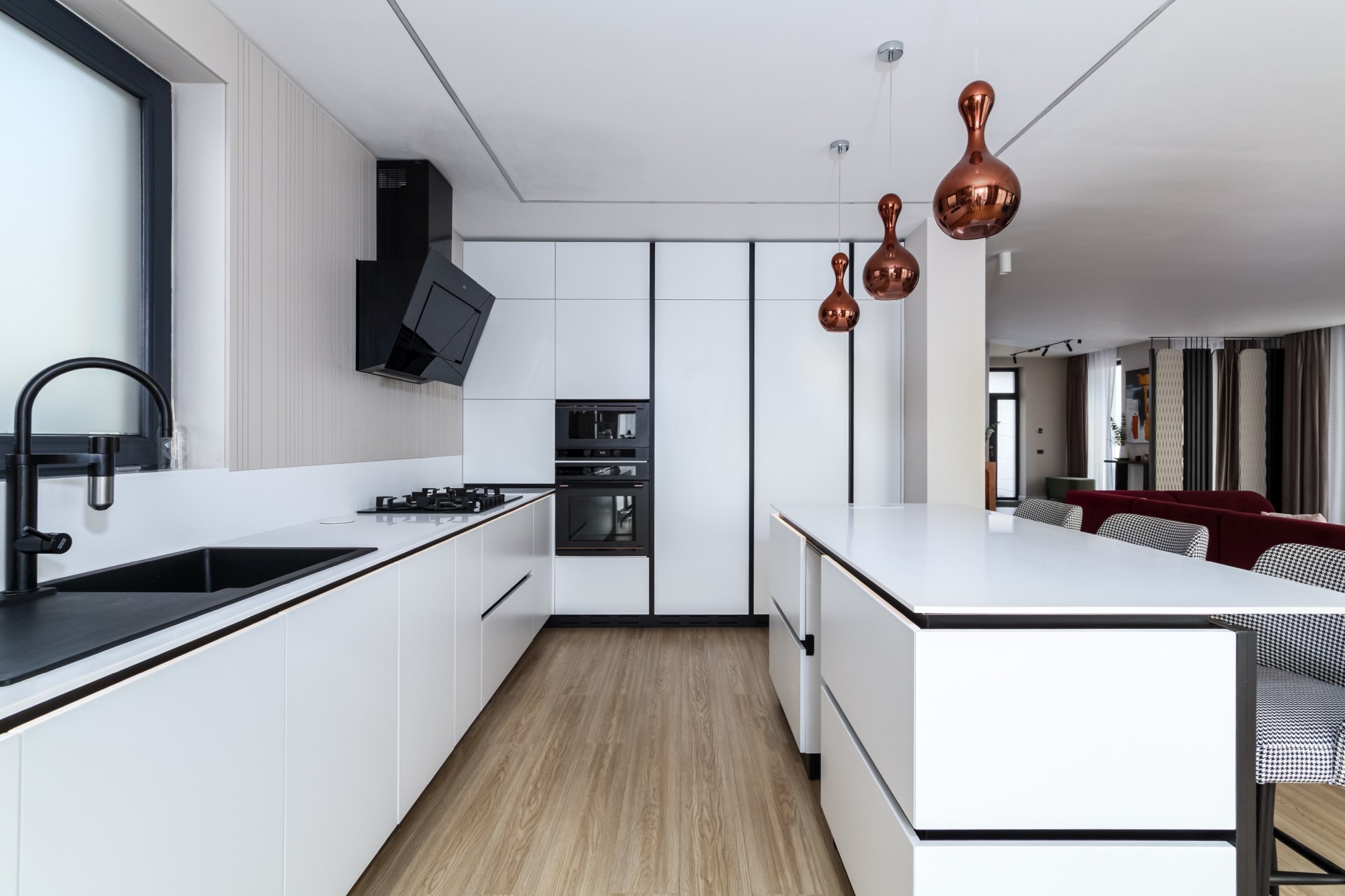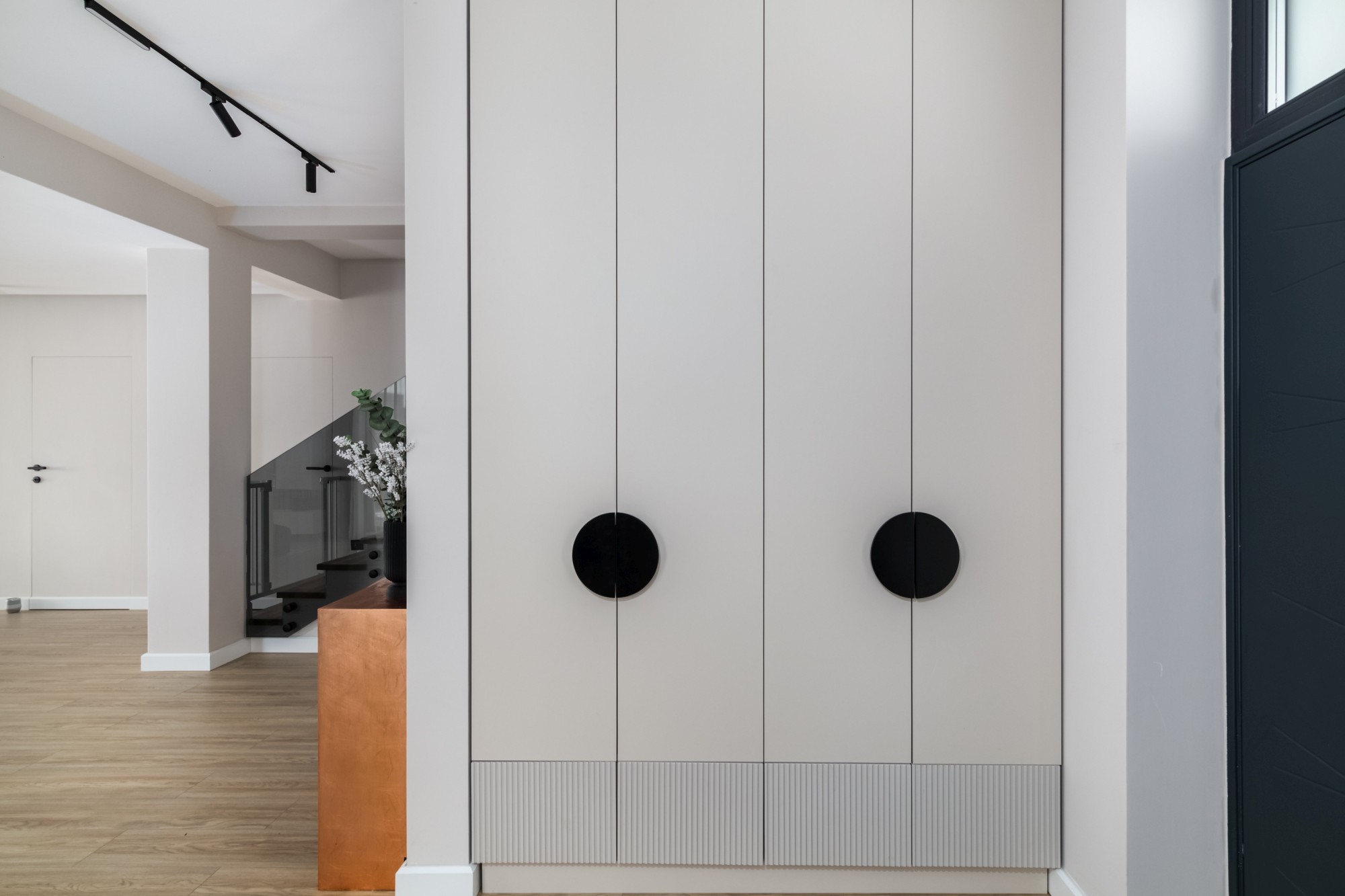 Rezultatul este un interior puternic, dar calm, care combină disciplina liniilor contemporane cu căldura lemnului și cu un joc de contraste (oliv–negru–grej) foarte actual. Spațiul se simte mare, aerisit și premium, iar detaliile la comandă (panourile, fronturile, luminile integrate) dau exact acel „ceva” care îl face memorabil.