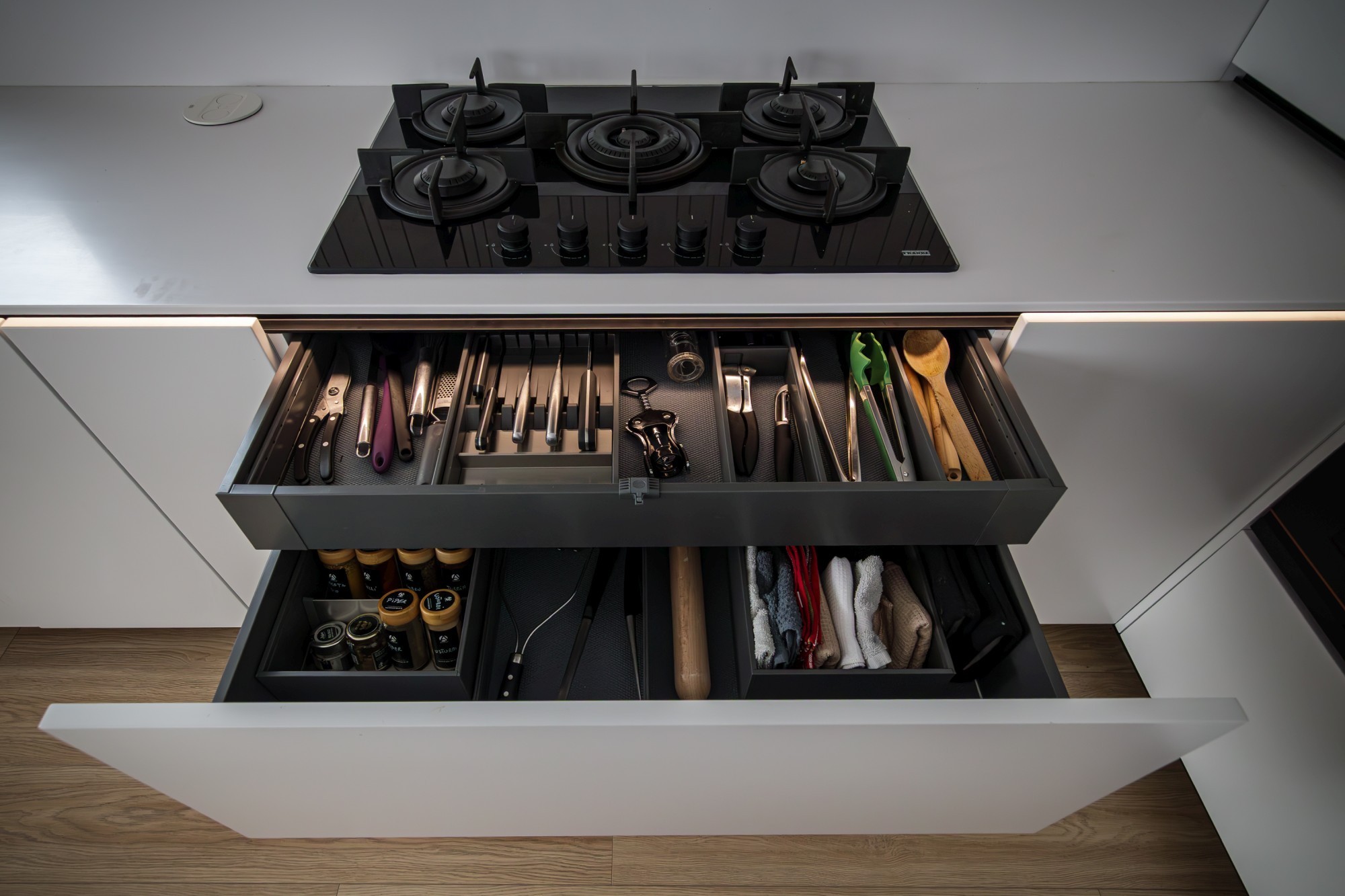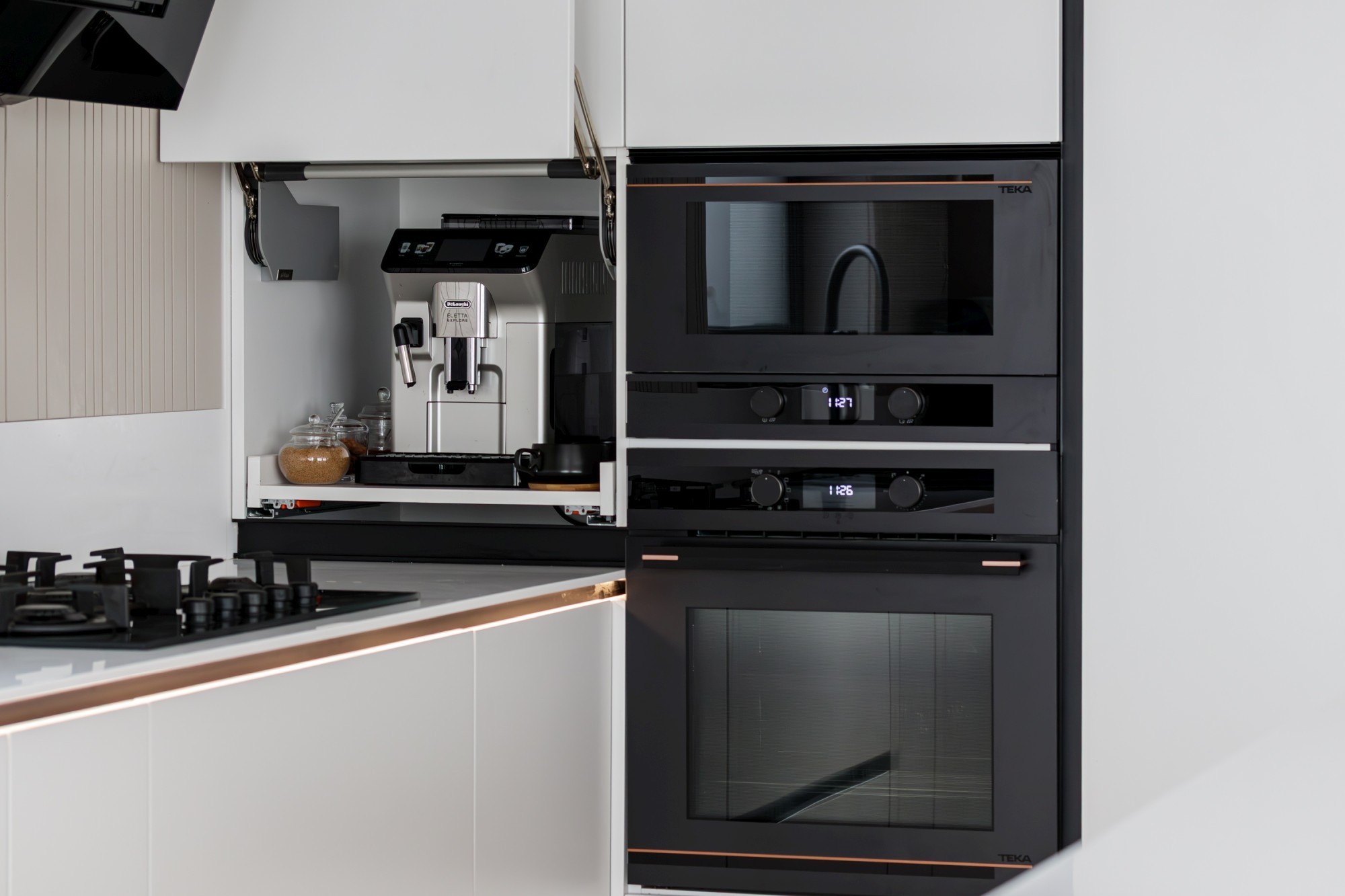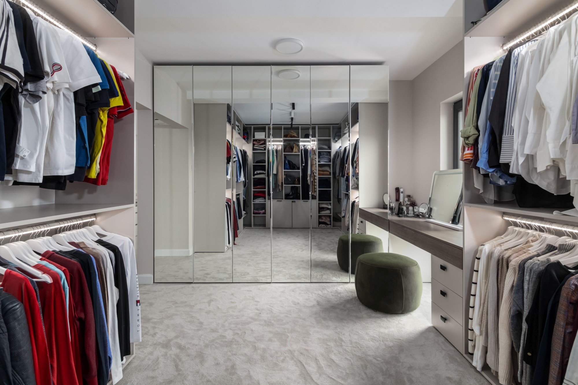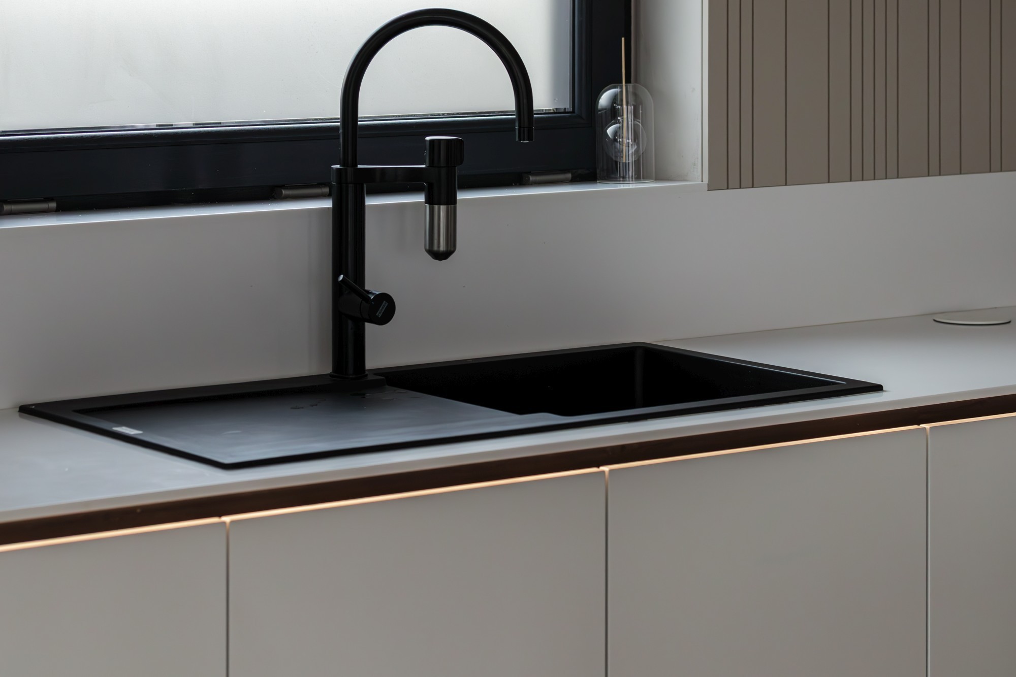 Rezultatul este un interior puternic, dar calm, care combină disciplina liniilor contemporane cu căldura lemnului și cu un joc de contraste (oliv–negru–grej) foarte actual. Spațiul se simte mare, aerisit și premium, iar detaliile la comandă (panourile, fronturile, luminile integrate) dau exact acel „ceva” care îl face memorabil.