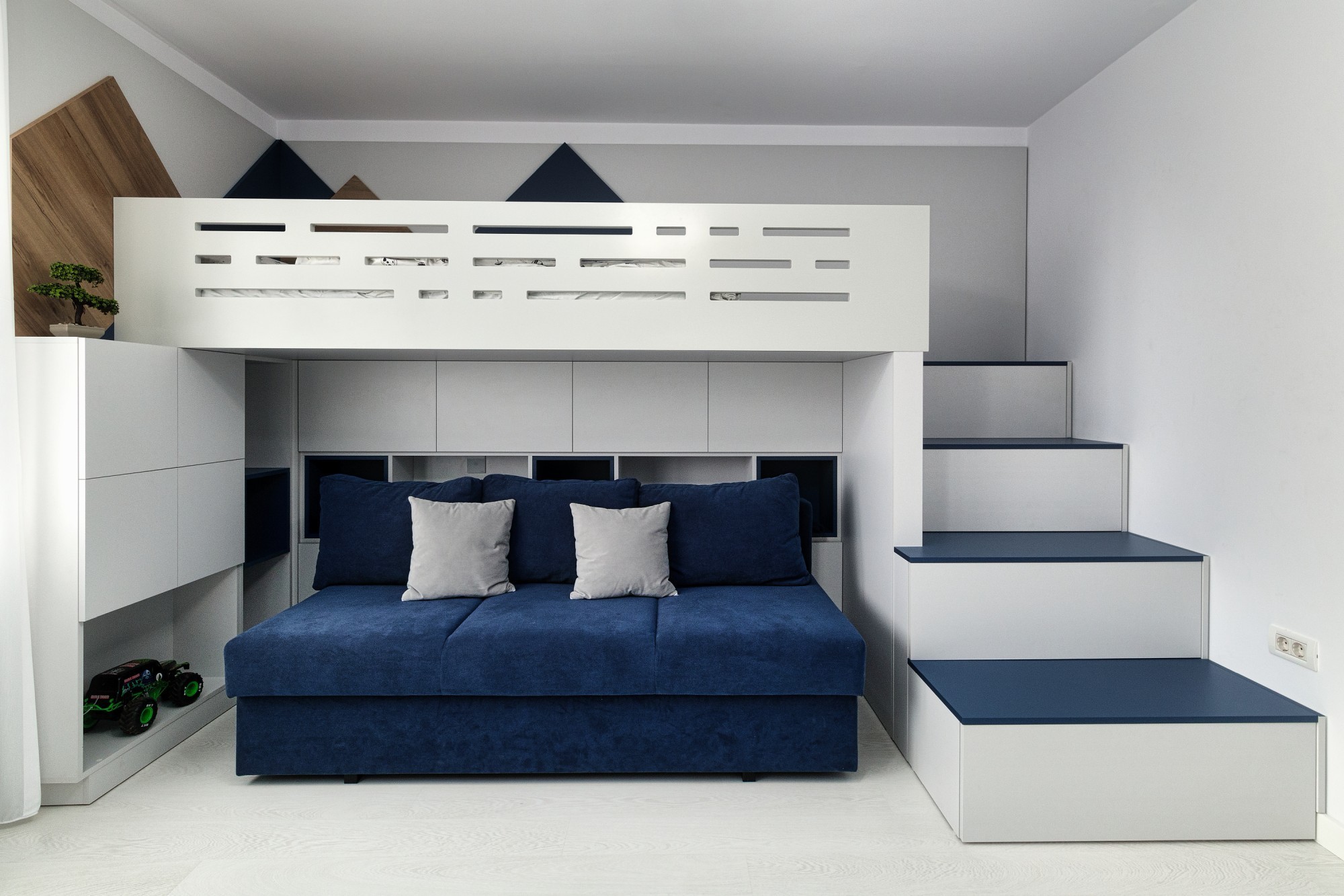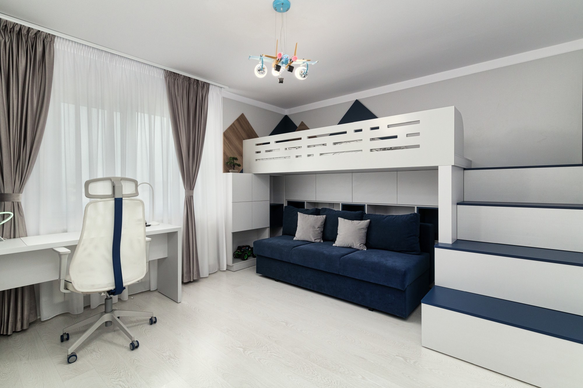 Paleta cromatică – nuanțe pastelate de albastru, verde mentă și galben cald – creează un ambient echilibrat, luminos și liniștitor. Texturile moi ale pernelor tapitate contrastează plăcut cu finisajele din PAL și MDF, iar tonurile naturale de lemn aduc căldură și stabilitate vizuală. Întregul ansamblu transmite calm, dar și energie creativă.