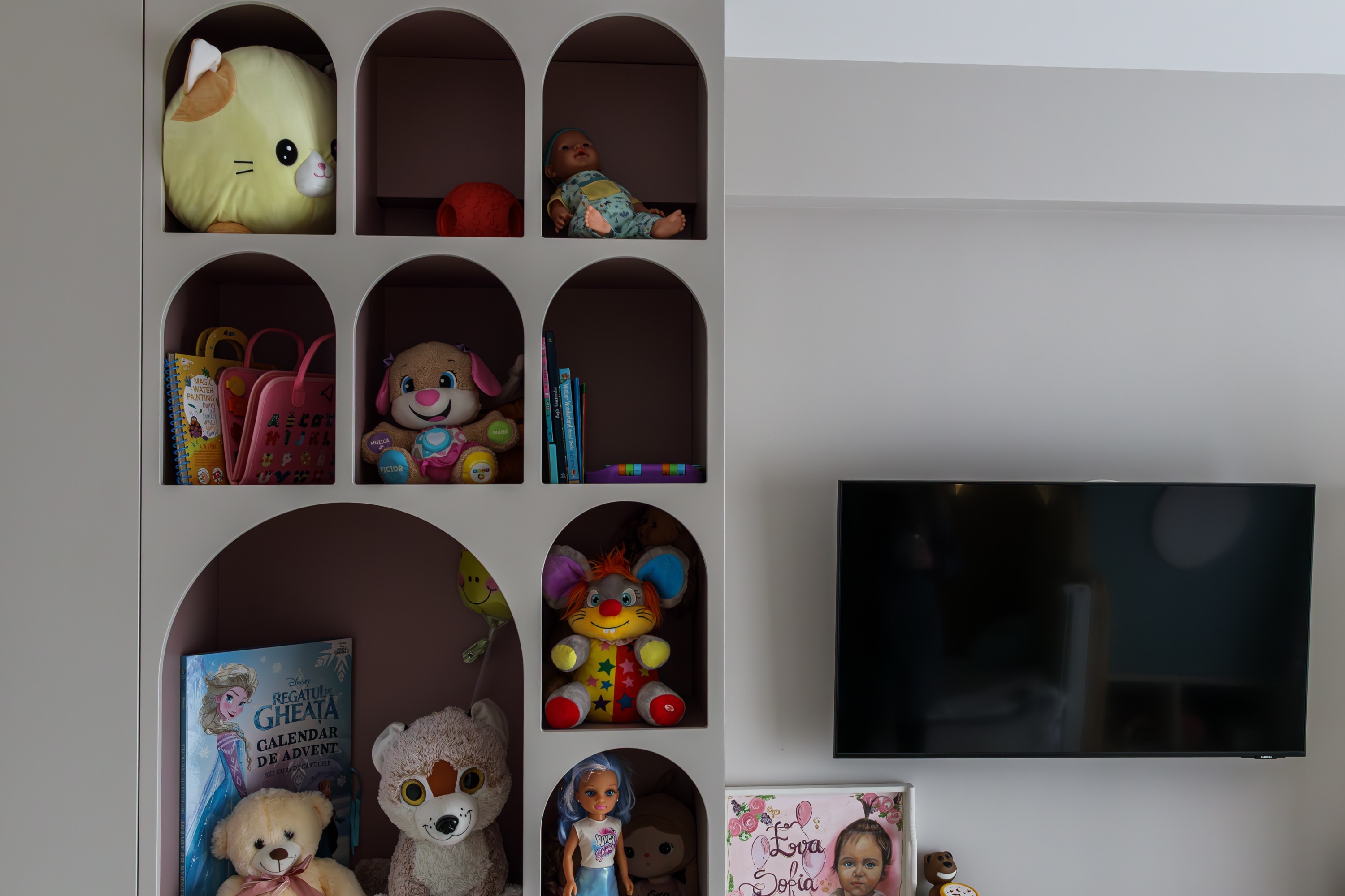 Patul tapițat, cu formă jucăușă inspirată de silueta unui ursuleț, devine punctul central al camerei – un loc de odihnă, dar și de poveste. Zona de birou este poziționată pentru a beneficia de lumină naturală, susținând atât activitățile creative, cât și momentele de concentrare, iar spațiile de depozitare sunt optim dimensionate pentru a păstra ordinea fără a încărca vizual încăperea.