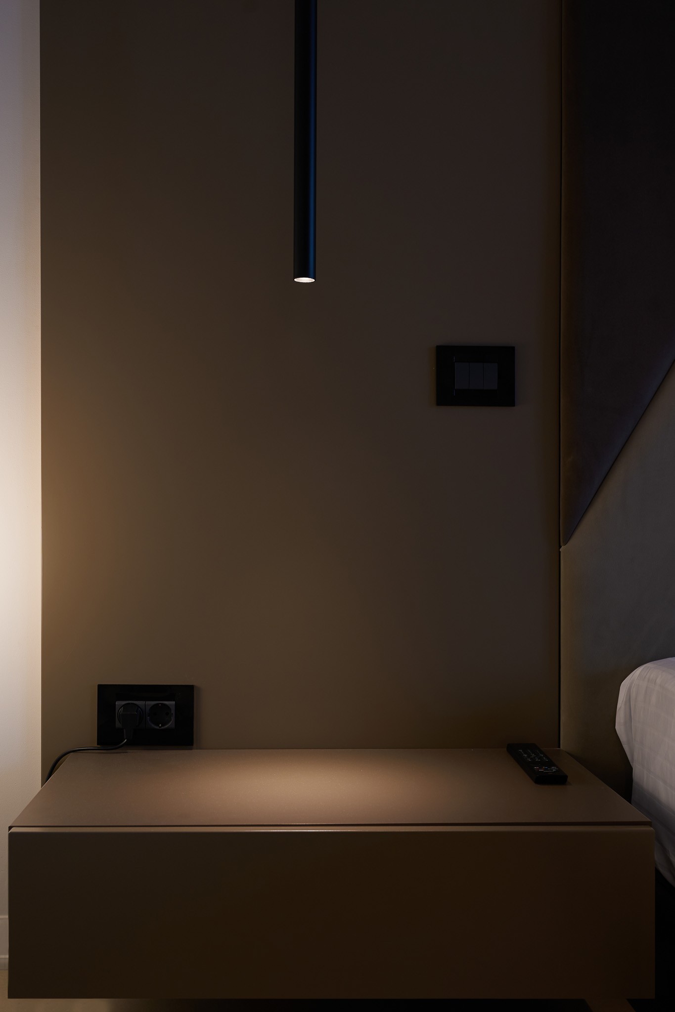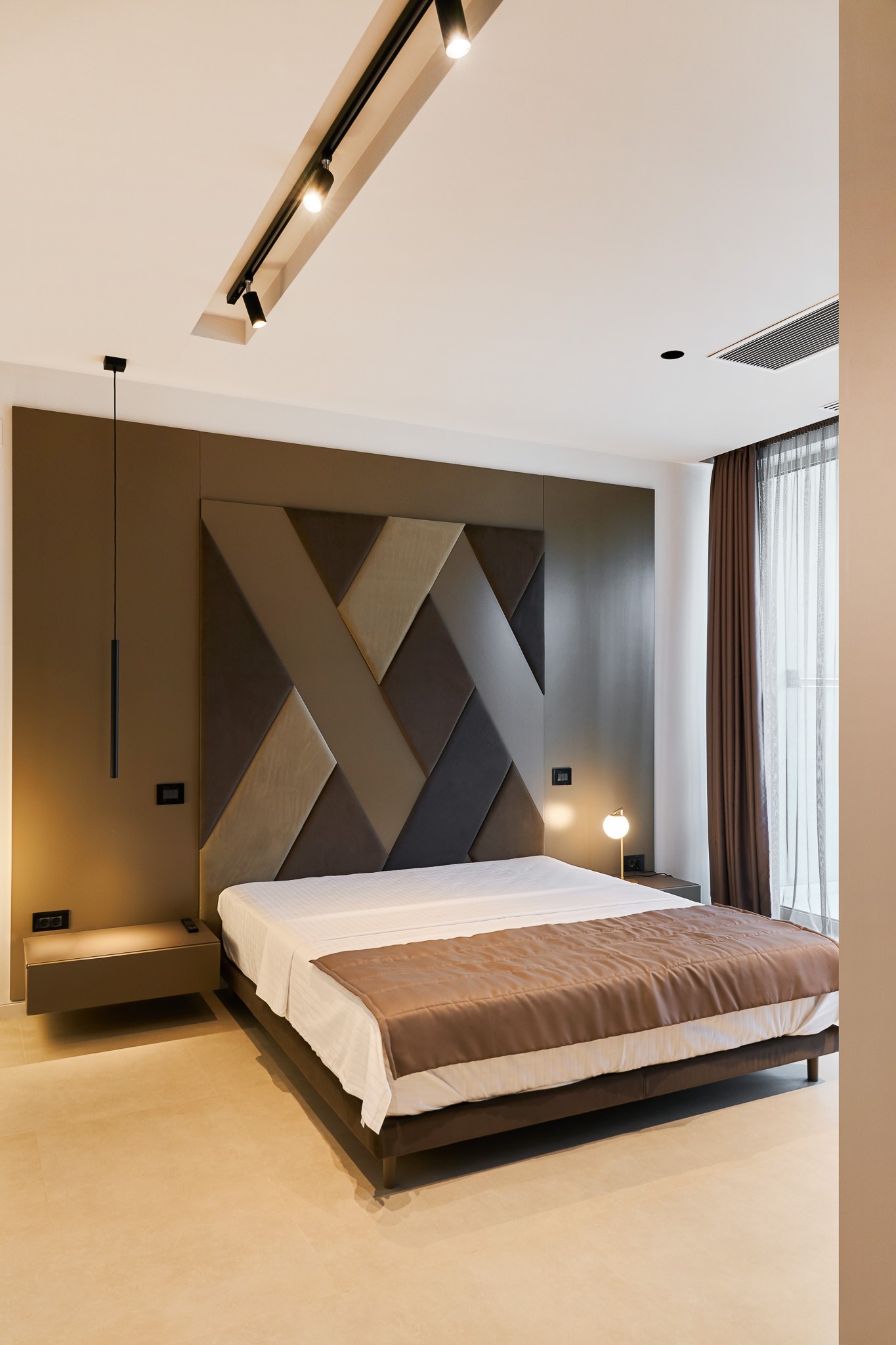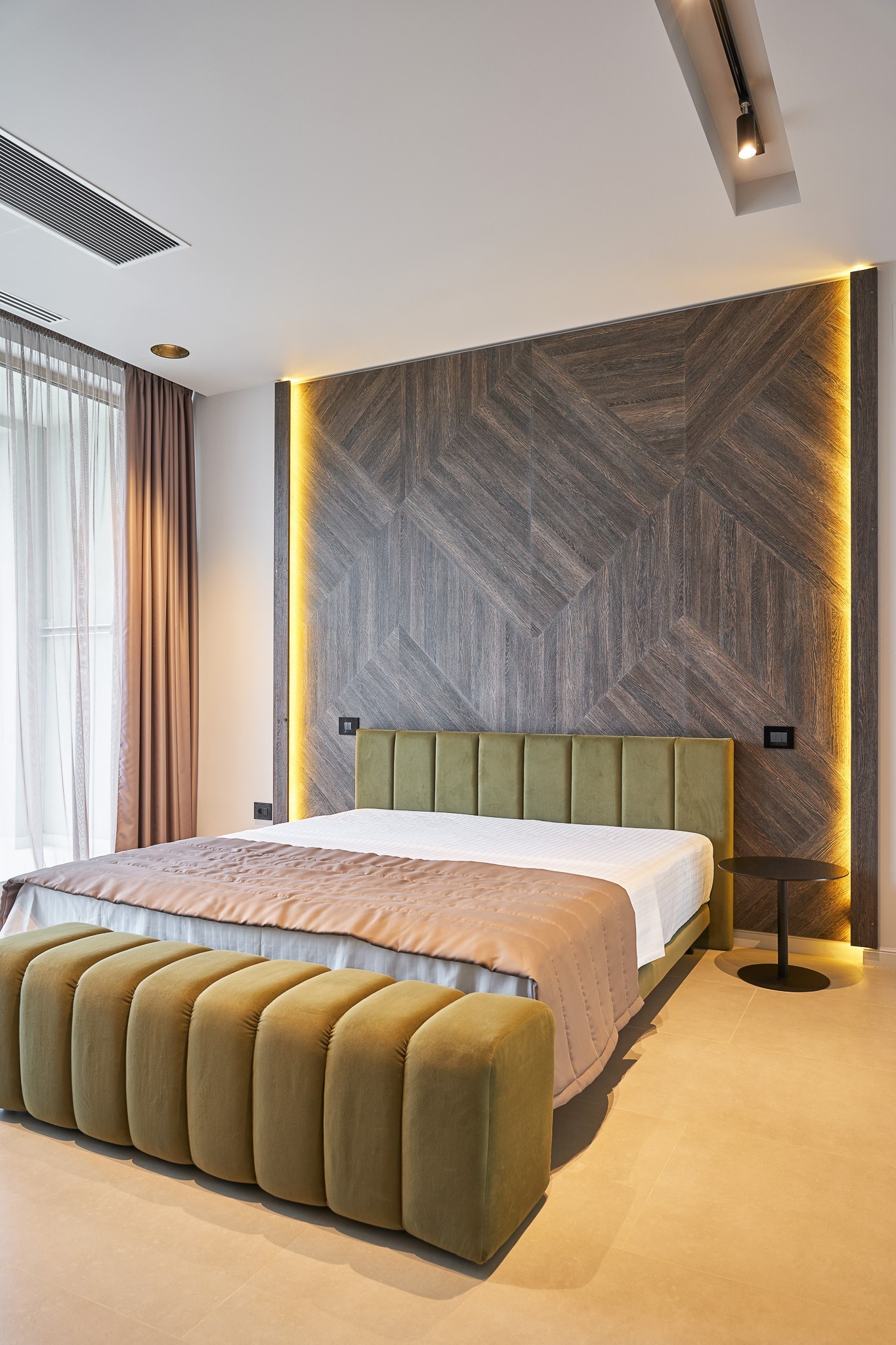 Pentru dormitor s-a pastrat nota eleganta. Modelul de pat cu tablie extinsa in romburi, a fost preluat si pe zona de dulapuri, avand spatii generoase de depozitare, cu usi cu sistem de glisare ascuns, pentru a nu influenta linia neo clasica.