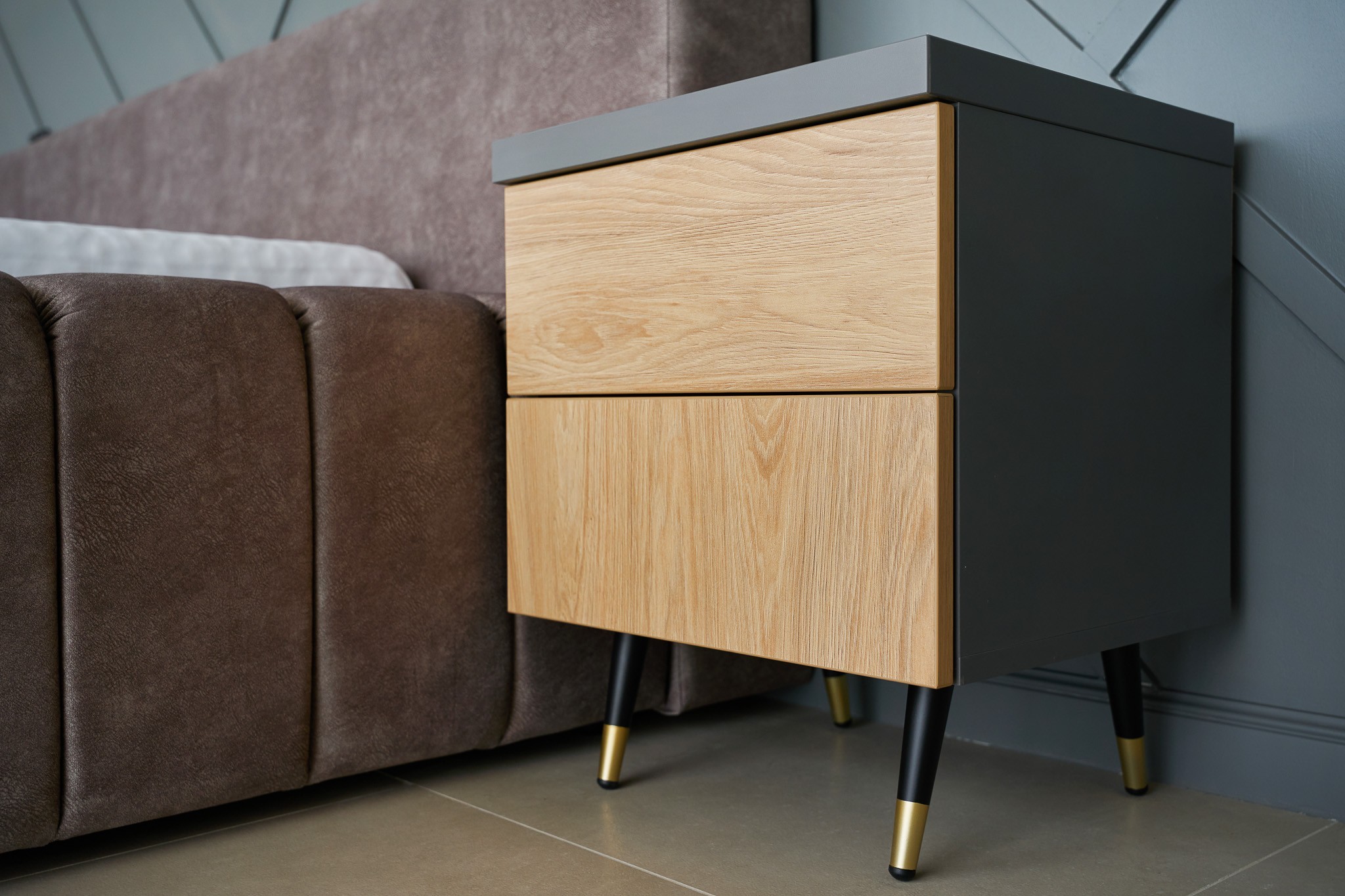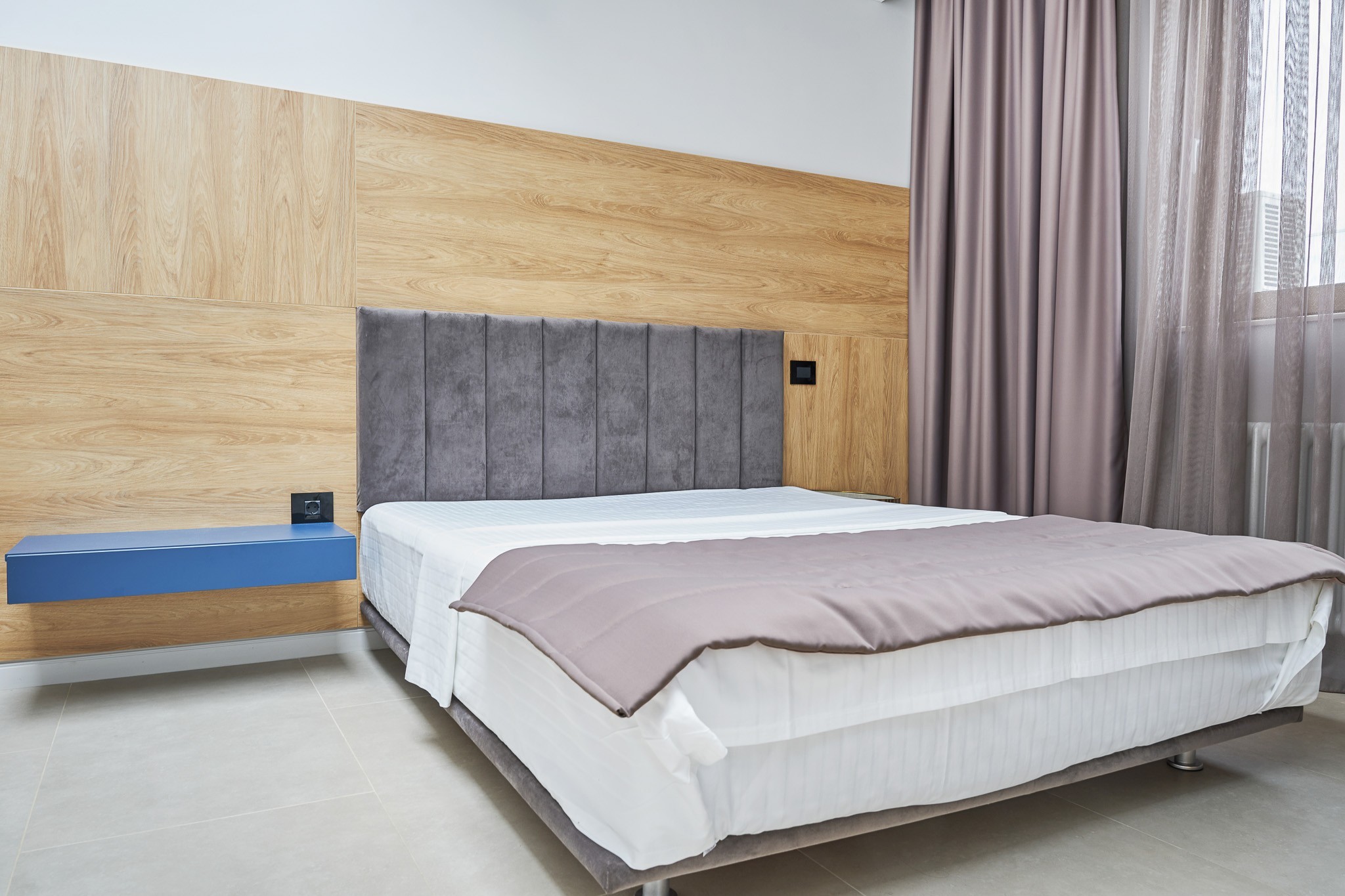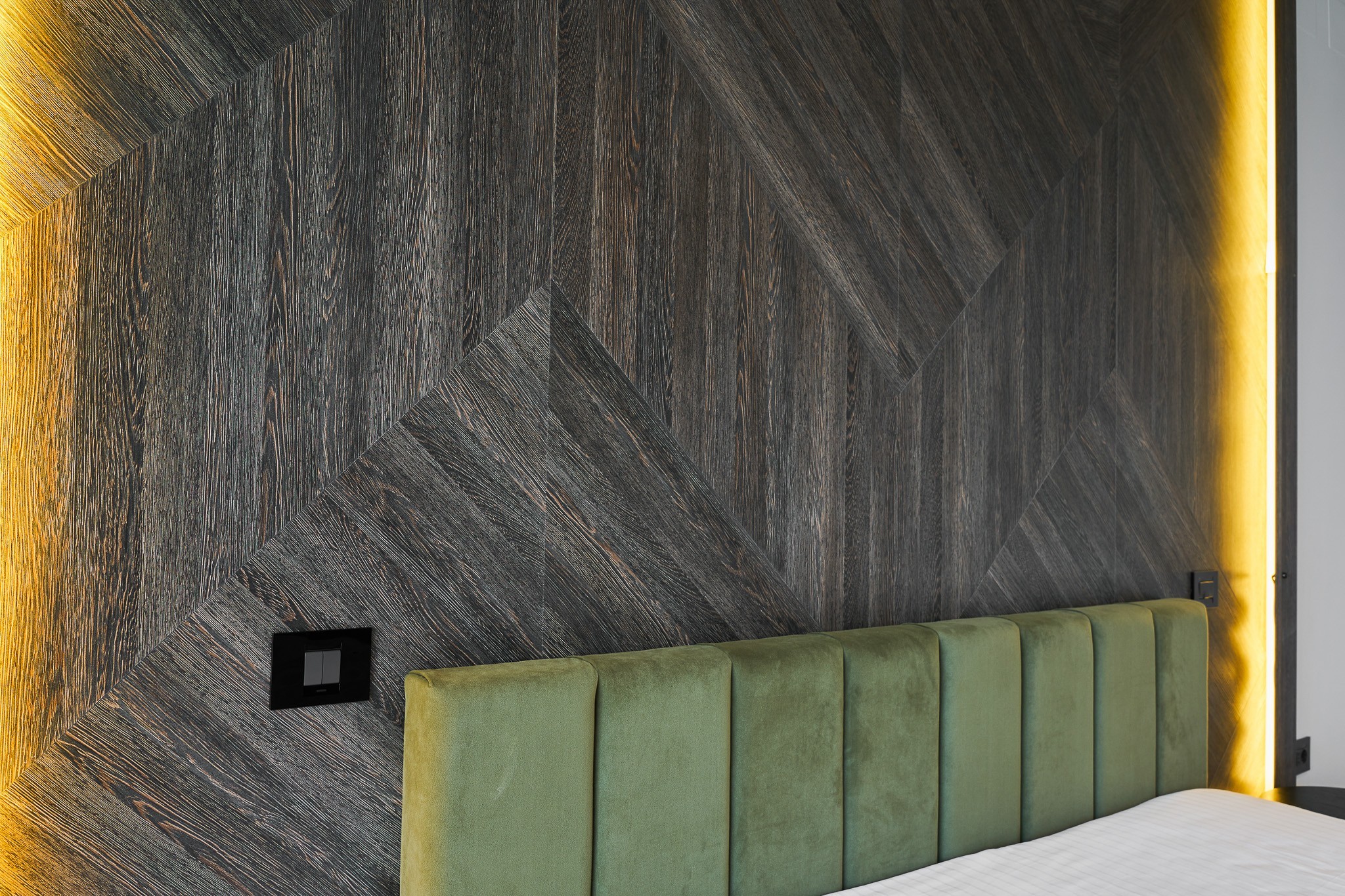 Pentru dormitor s-a pastrat nota eleganta. Modelul de pat cu tablie extinsa in romburi, a fost preluat si pe zona de dulapuri, avand spatii generoase de depozitare, cu usi cu sistem de glisare ascuns, pentru a nu influenta linia neo clasica.
