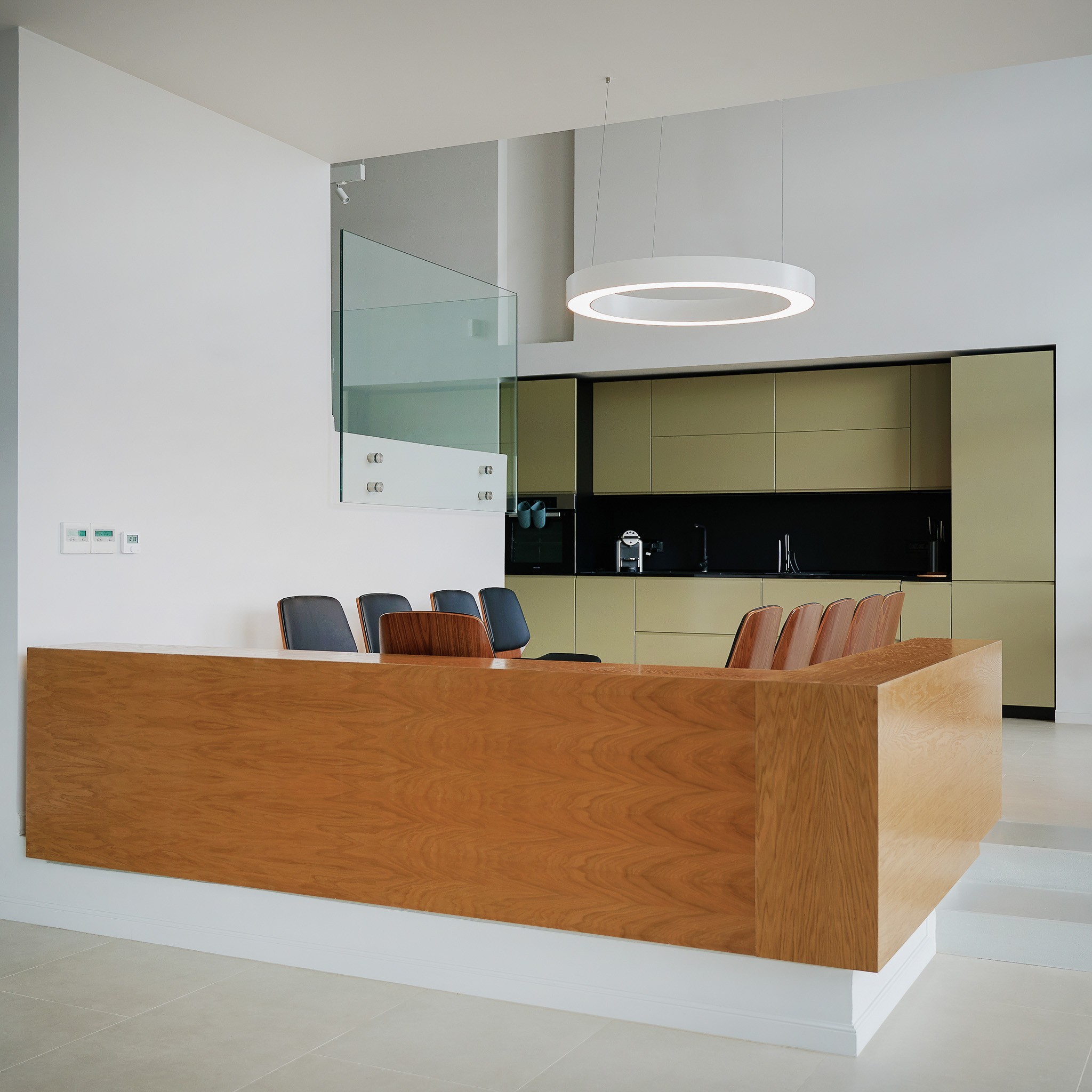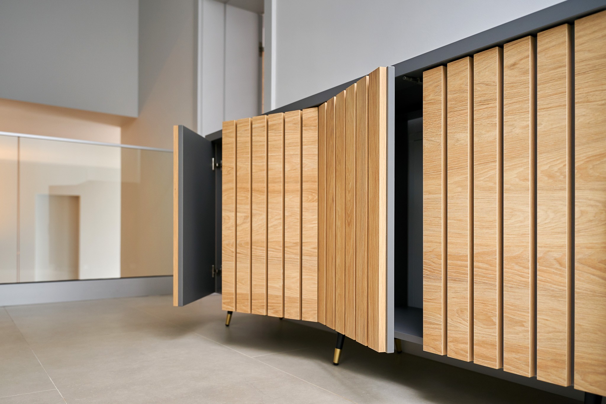 Zona de living emana eleganta, dar si caldura prin incorporarea semineului cu bioetanol. Utilizarea fronturilor din MDF vopsit , cu frezare Wave, vopsite metalizat, creeaza un placut joc de textura si culoare.