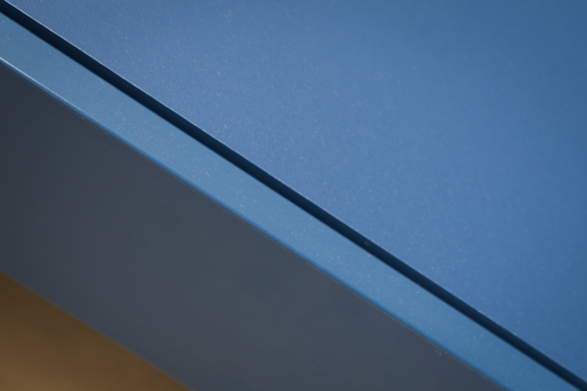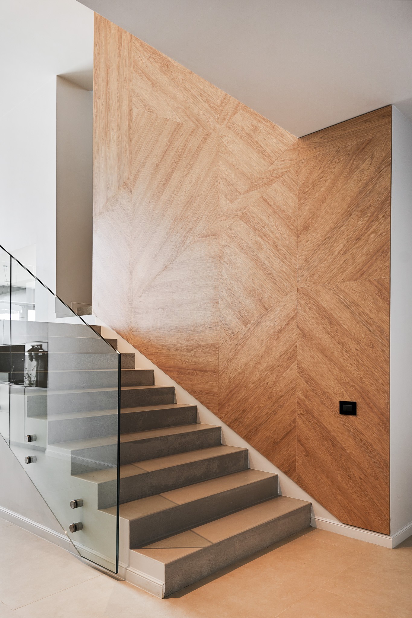 Bucataria este realizata din PAL cu usi si fronturi de sertar din MDF vopsit, care ne permit pastrarea liniei neoclasice. Blatul de corian de 12mm permite o intretinere foarte usoara si o rezistenta foarte mare in timp. Detaliul principal este zona de contrablat, unde s-a optat pentru un sistem de glisare discret, cu sticla printata cu efect de marmura, care face spatiul sa arate foarte ordonat.