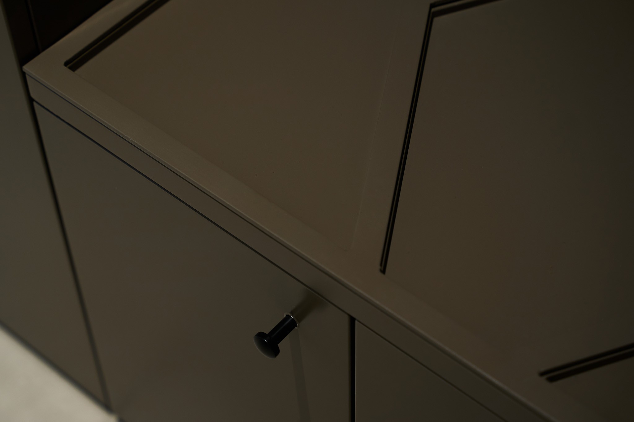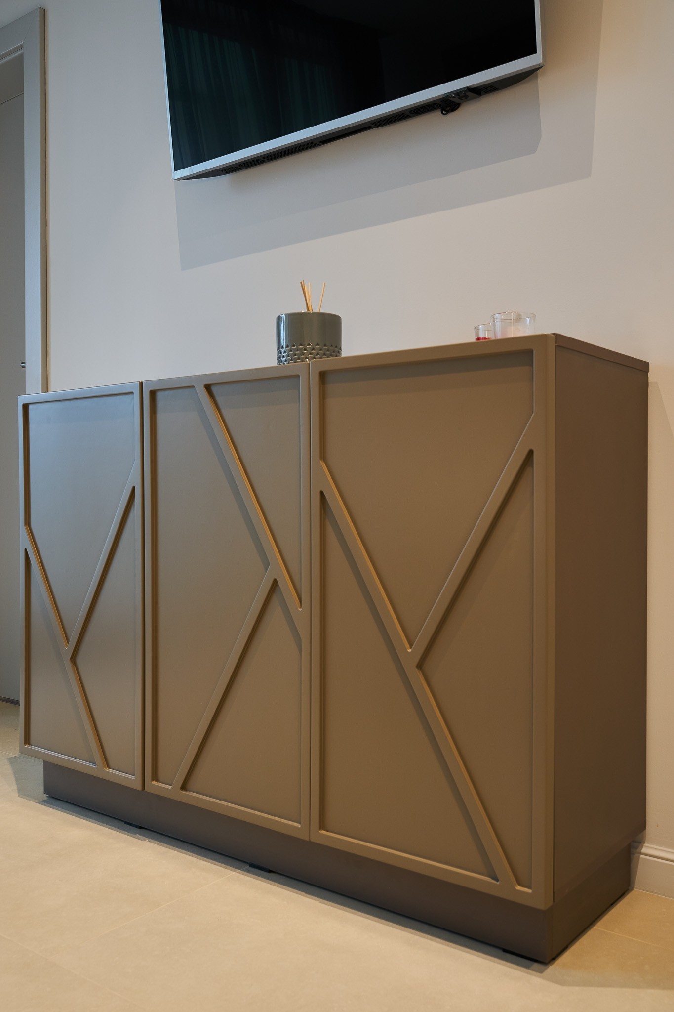 Clientul a dorit culori neutre , dar in acelasi timp detalii de efect . Utilizarea MDF-ului vopsit ca material predominant in aceasta lucrarea, ne-a permis sa creem senzatia unui spatiu luminos, dar plin de texturi, obtinute prin diferitele frezari ale fronturilor de mobilier.