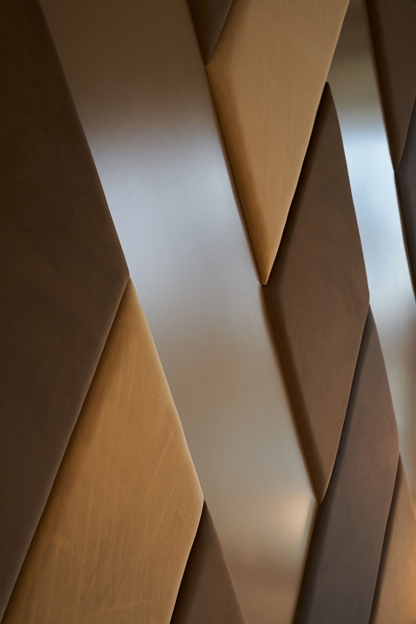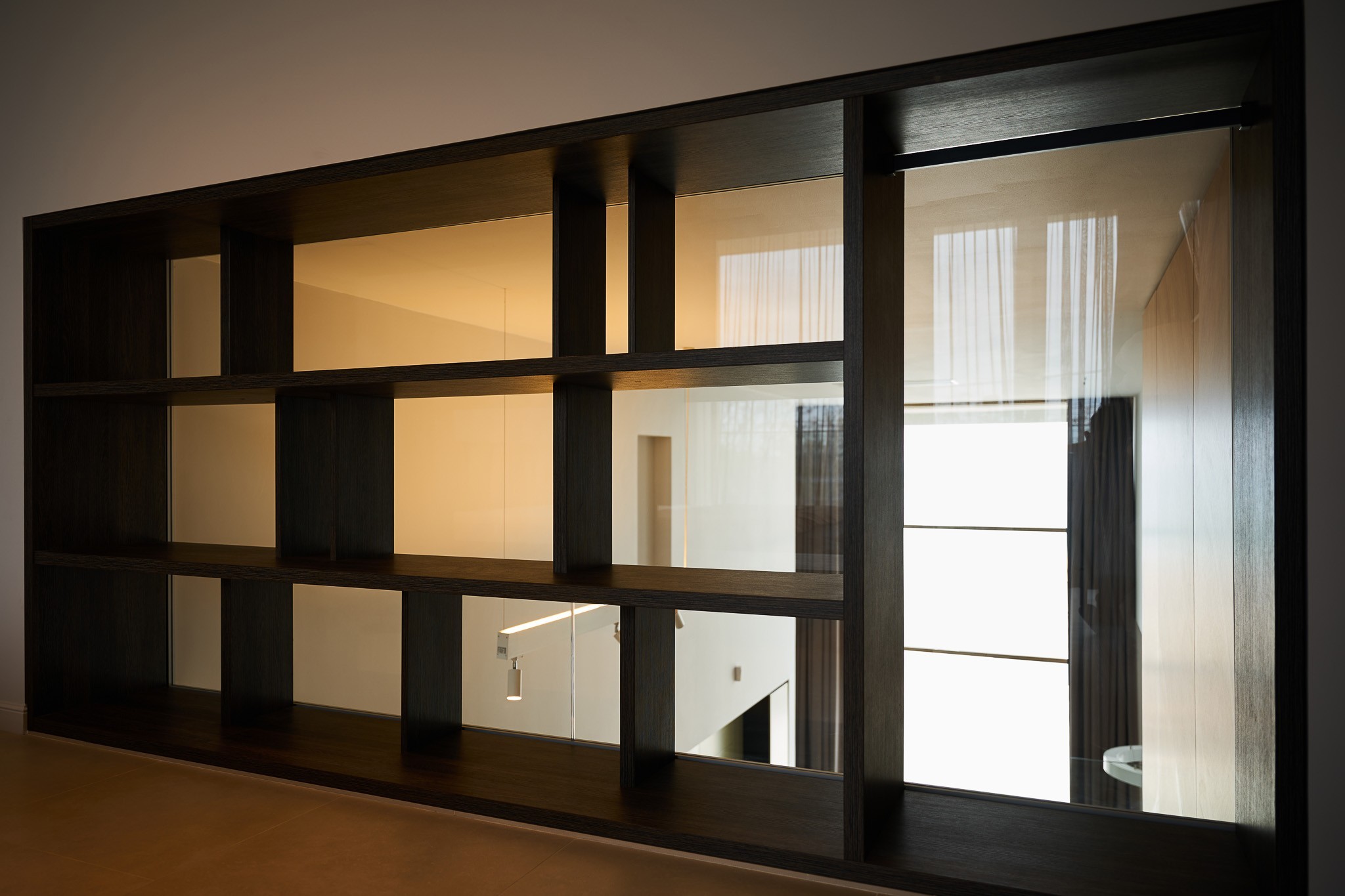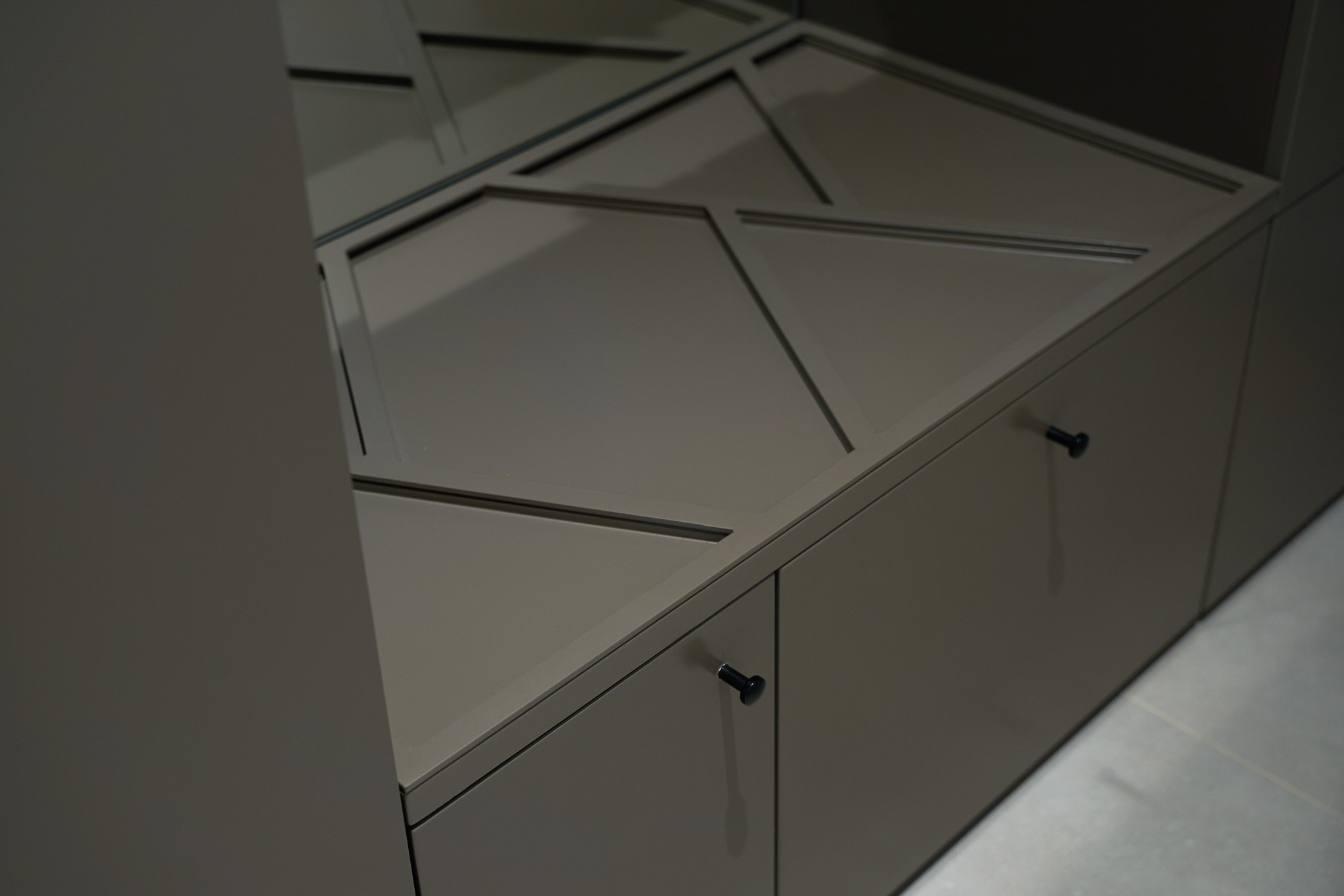 Comoda din hol, pare ca sta in echilibru, iar oglinda cu forme fazetate completeaza perfect linia. Dressingul generos tine loc de cuier si pantofar, lasand totusi intrarea luminoasa.